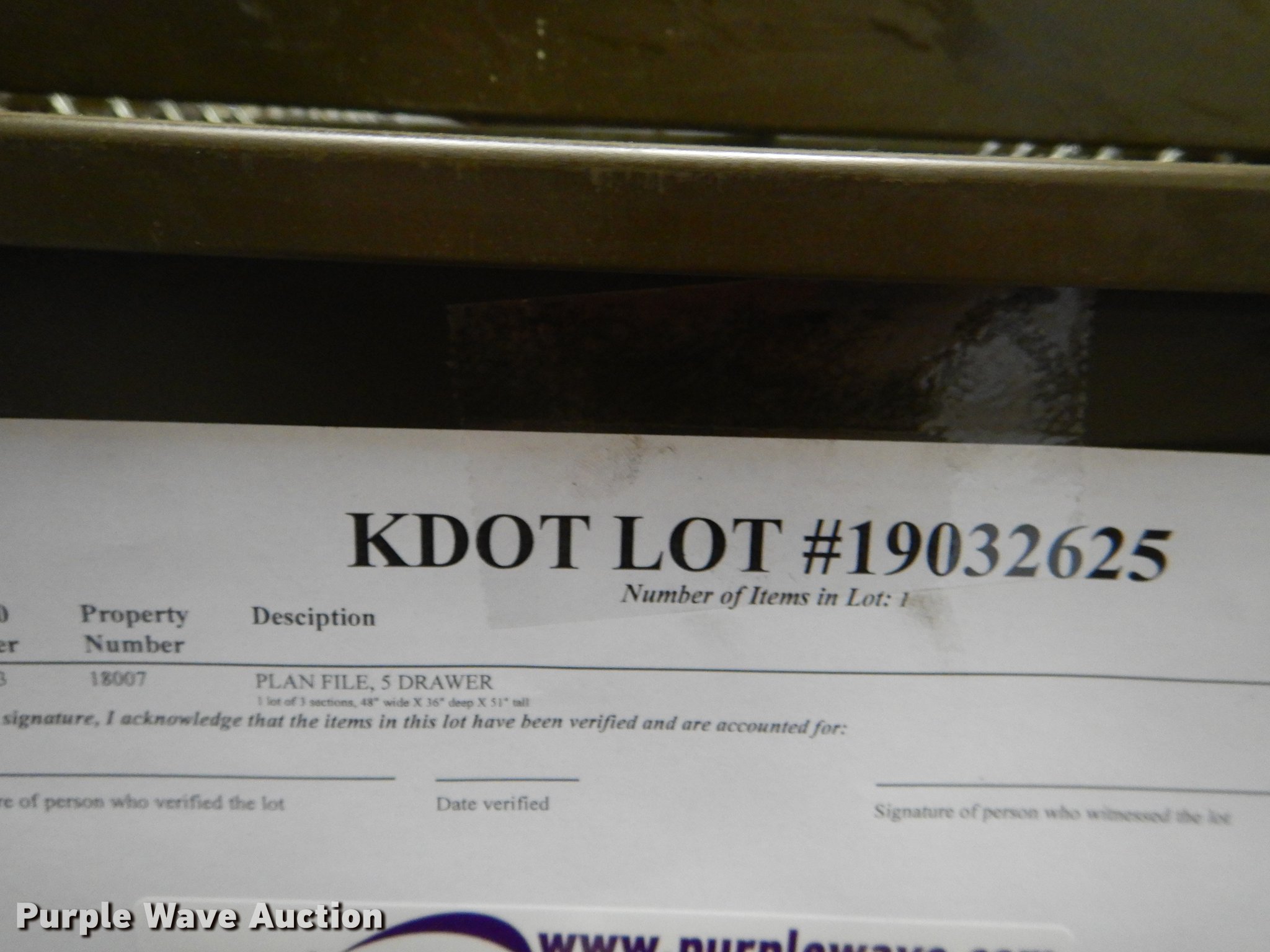Purple Wave is selling a used Office Supplies and Equip. in Kansas. This item is a (3) five drawer plan file cabinets with the following: 48"W x 36"D x 51"H, KDOT ID 19032625