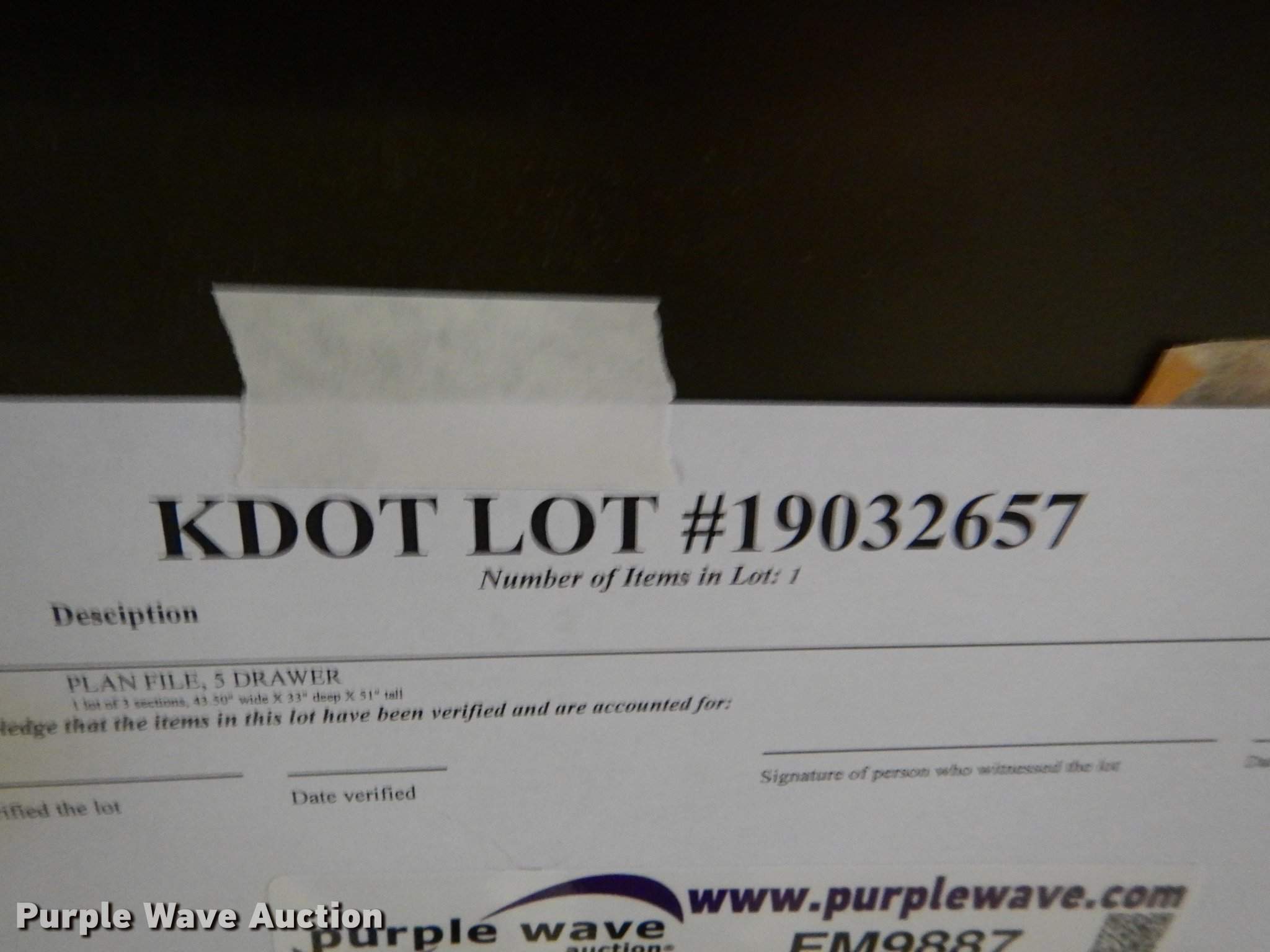 Purple Wave is selling a used Office Supplies and Equip. in Kansas. This item is a (3) five drawer plan file cabinets with the following: 43.5"W x 33"D x 51"H, KDOT ID 19032657