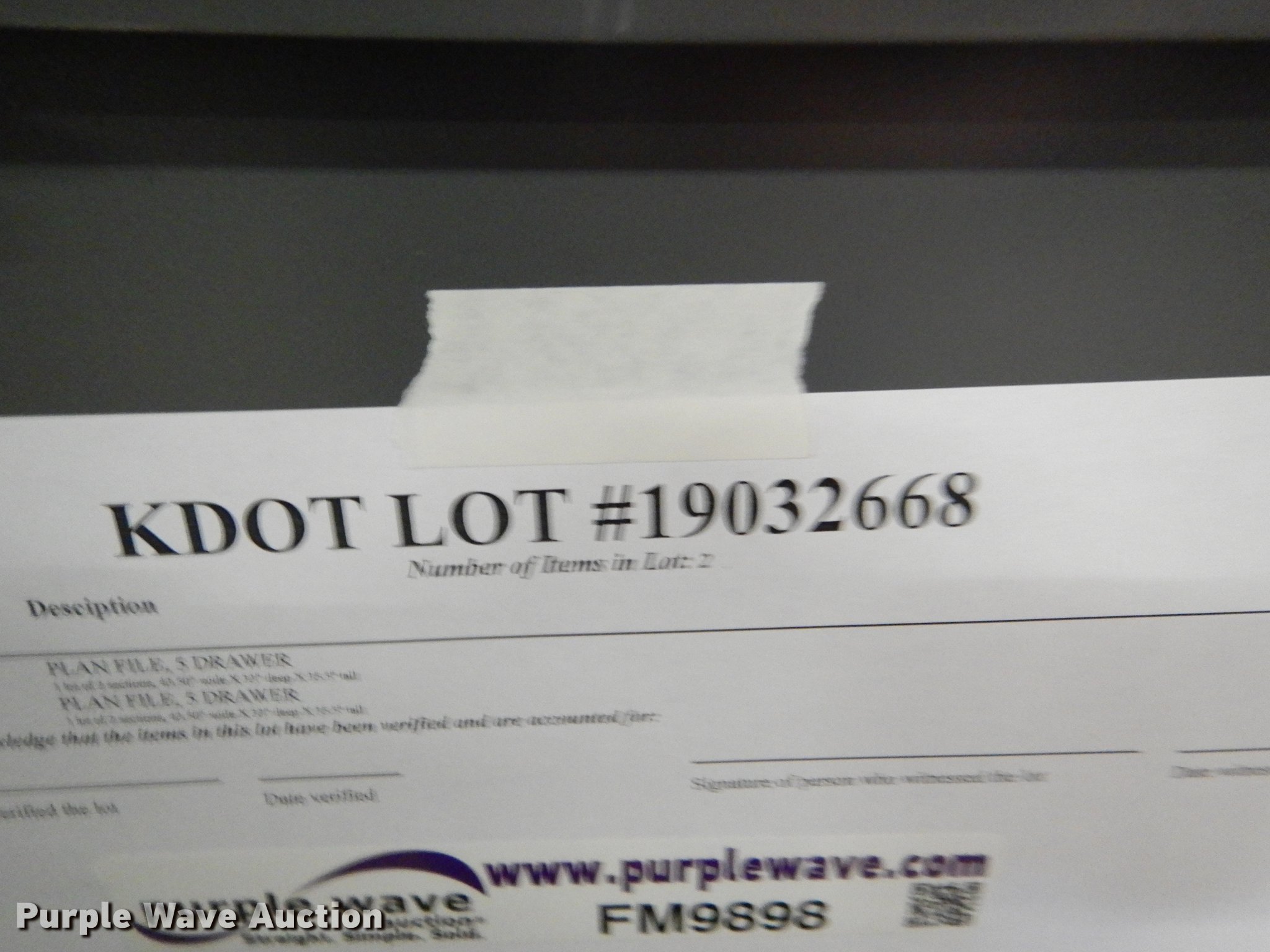 Purple Wave is selling a used Office Supplies and Equip. in Kansas. This item is a (4) five drawer plan file cabinets with the following: 43.5"W x 33"D x 35.5"H, KDOT ID 19032668