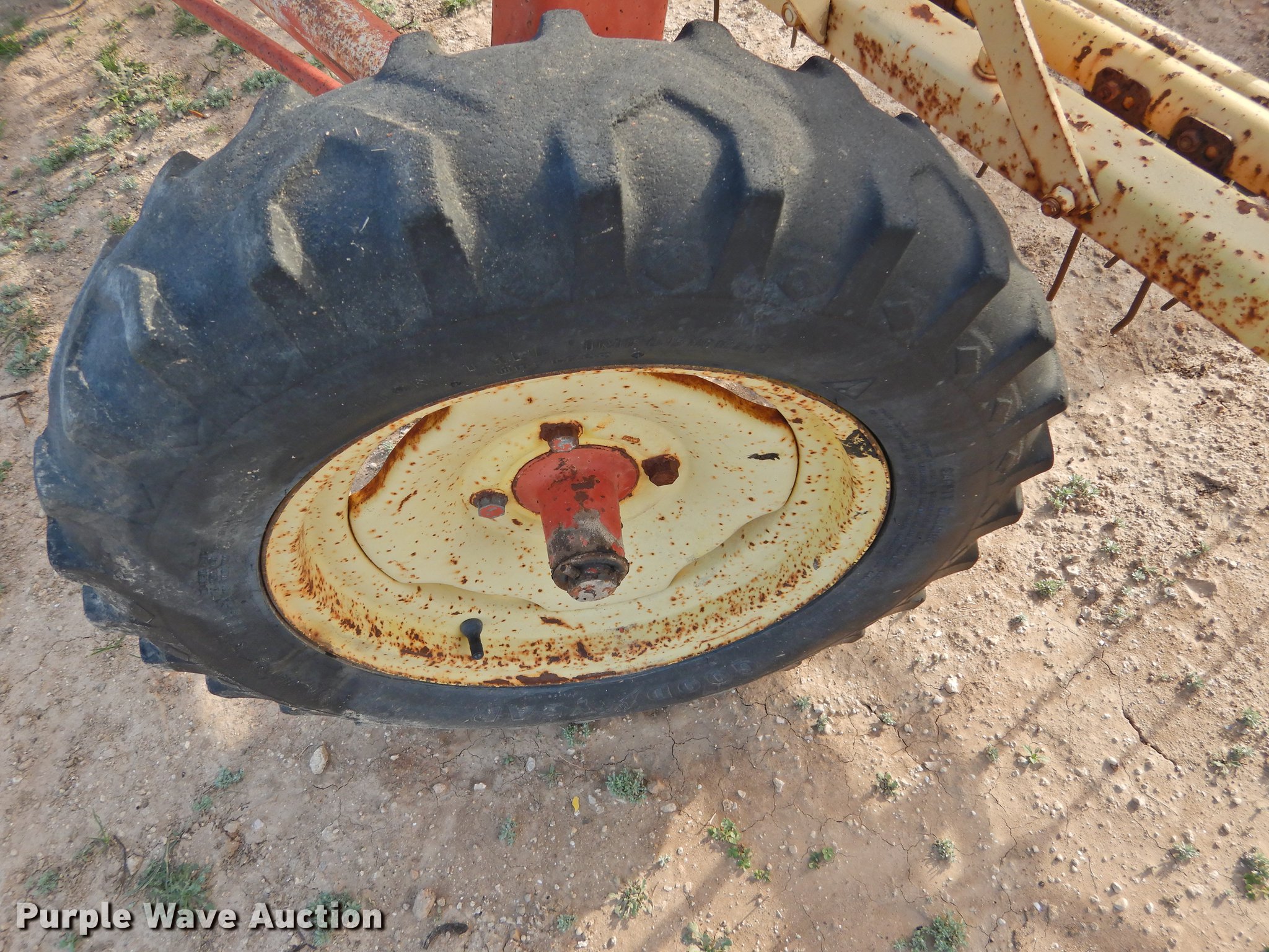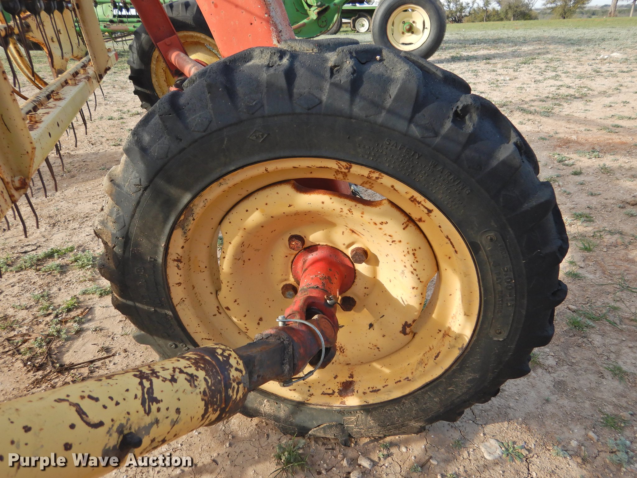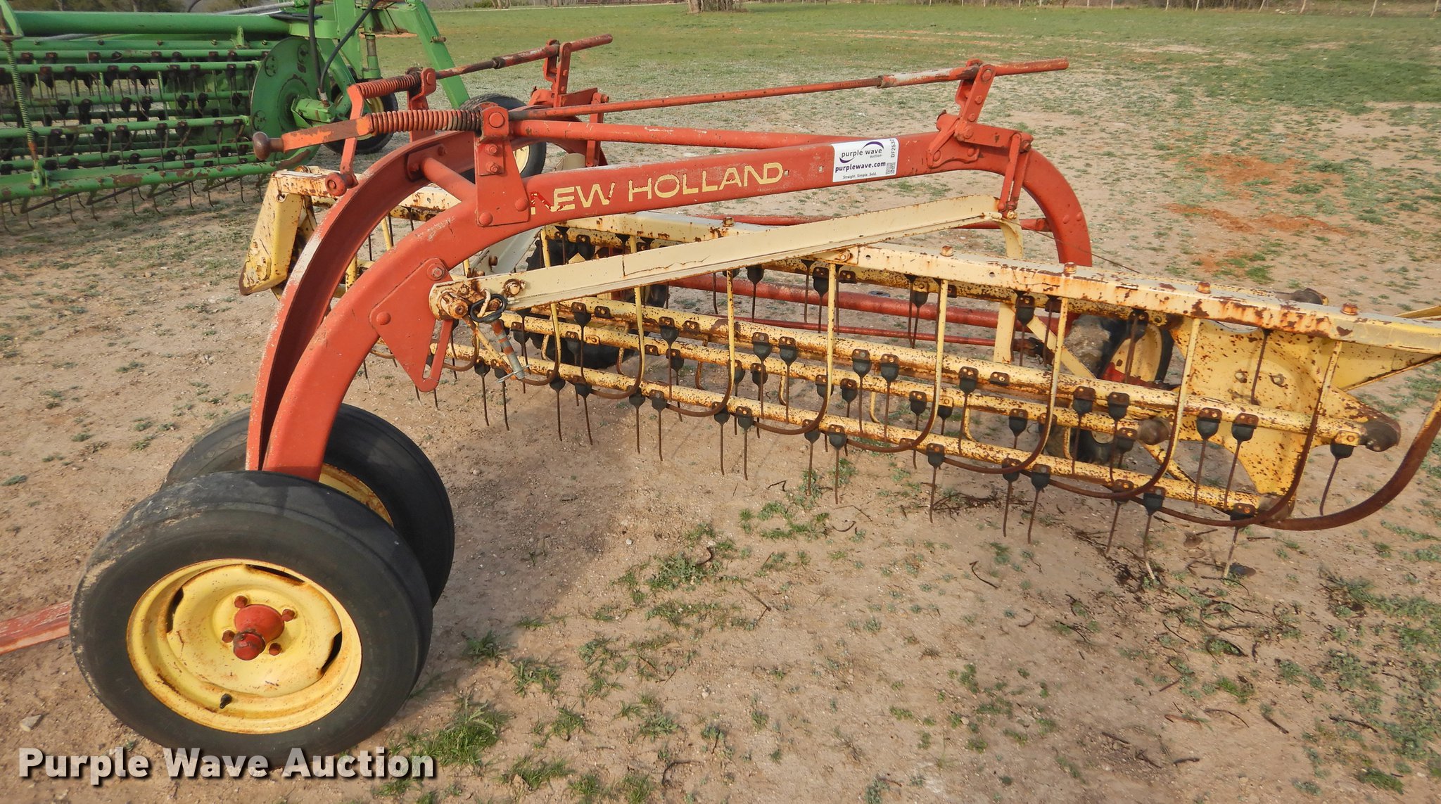 Purple Wave is selling a used Hay Rake in Texas. This item is a New Holland 258 hay rake with the following: Pin hitch, Goodyear 5.90-15 tires, Serial 163756