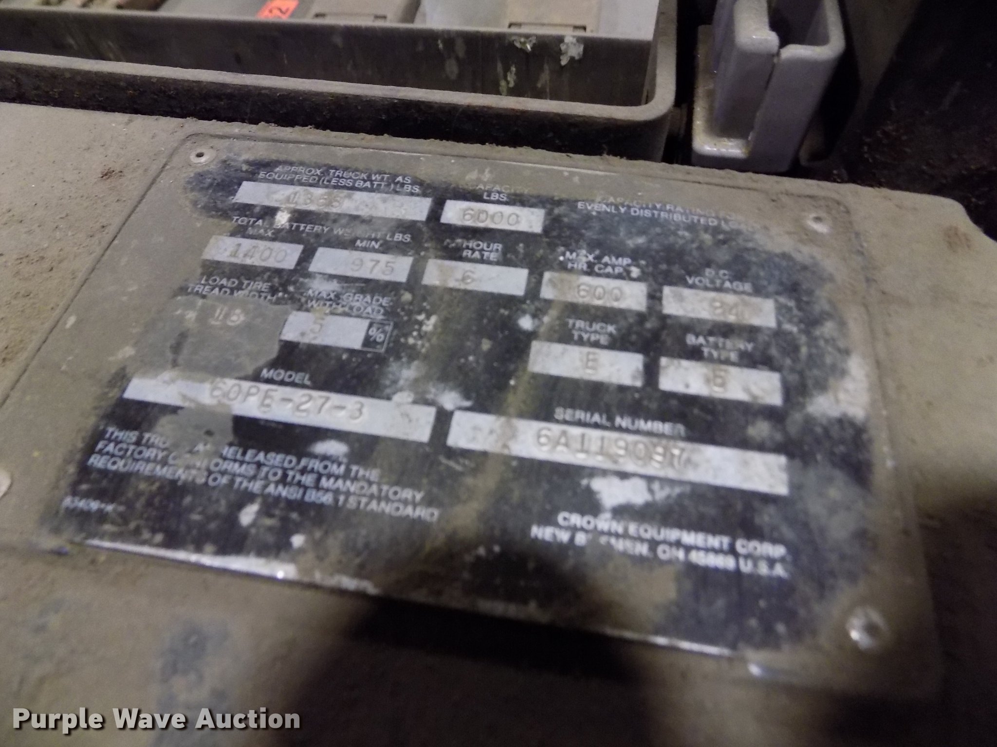 Purple Wave is selling a used Warehouse Forklift in Kansas. This item is a Crown 60PE-27-3 pallet jack with the following: 24V electric motor, 48" fork length, No batteries, Unknown operating condition, Serial 6A119097