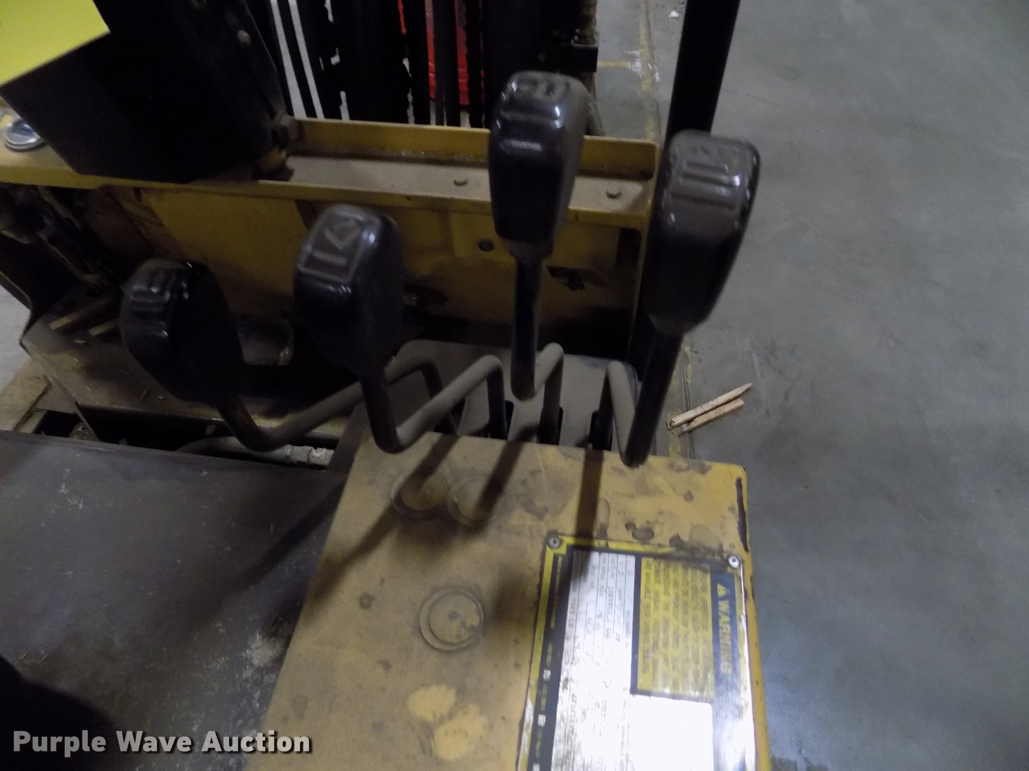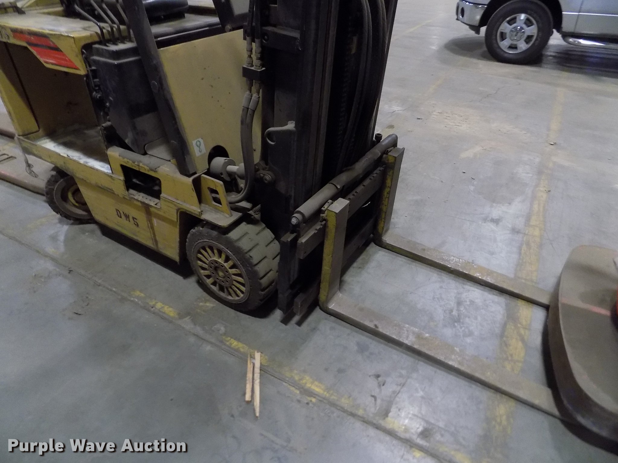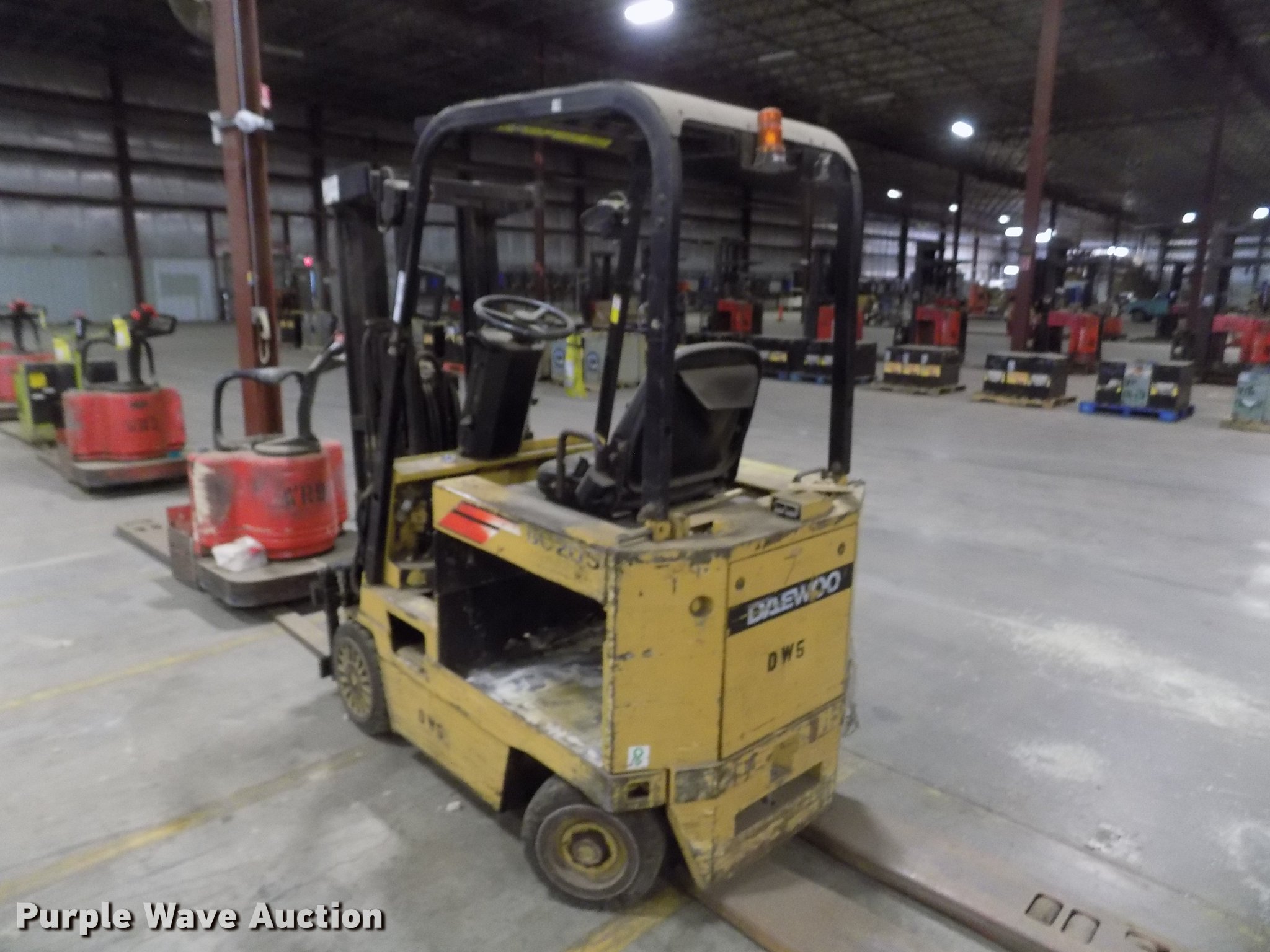 Purple Wave is selling a used Warehouse Forklift in Kansas. This item is a Daewoo BC20S forklift with the following: 3,927 hours on meter, 36/48V electric motor, 3,850 lbs max lift capacity, 129" max lift height, Two stage mast, Side shift, Mast tilt, 42" fork length, Auxiliary hydraulics, 18x8x12 1/8 solid front tires, Solid rear tires, No batteries, Unknown operating condition, Serial 27-00146
