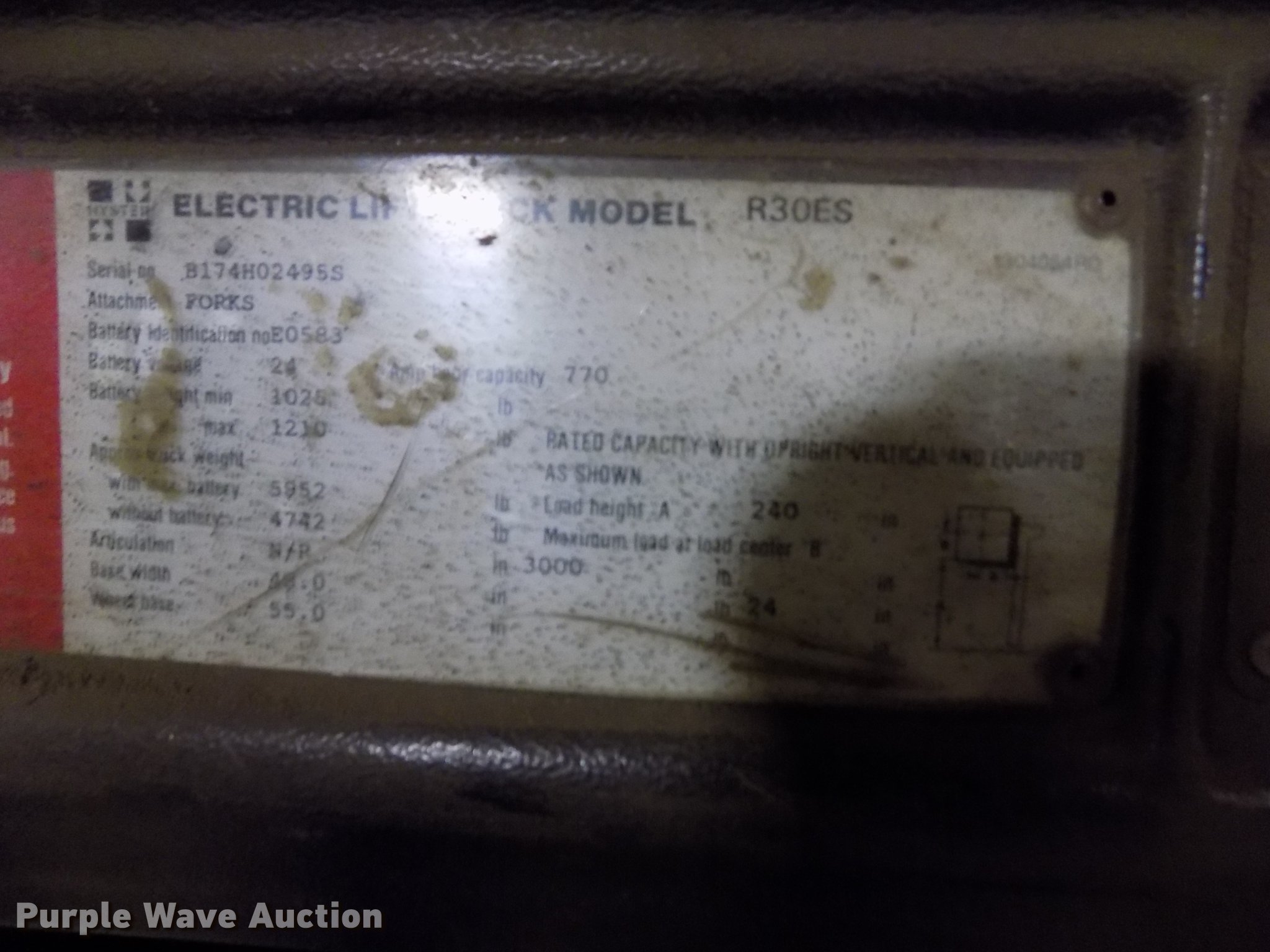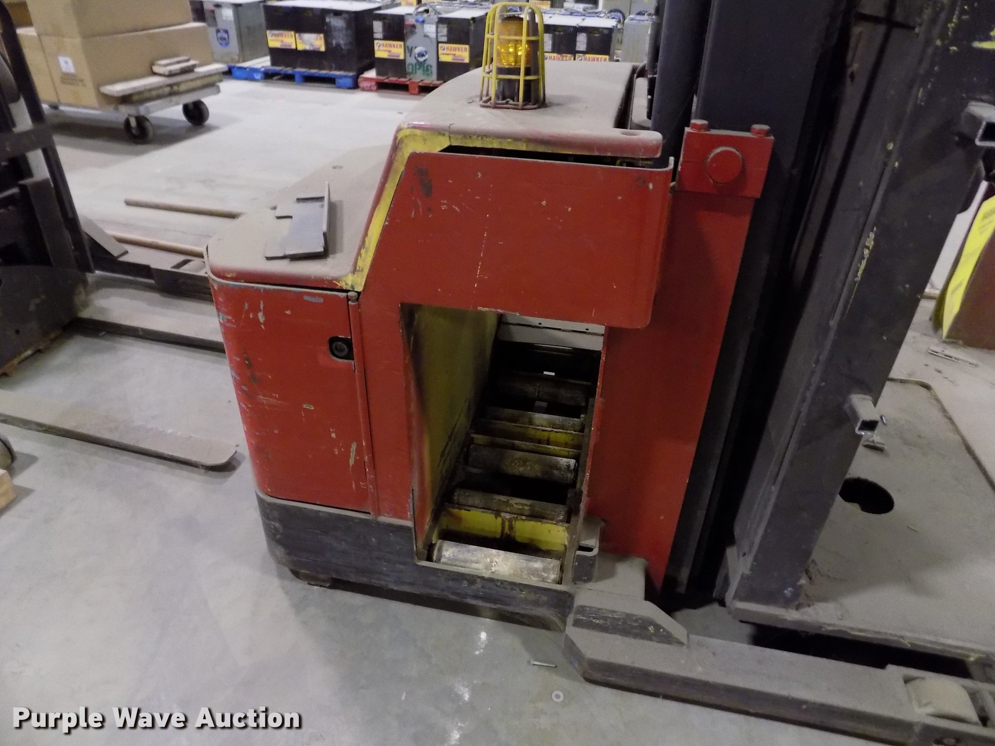 Purple Wave is selling a used Warehouse Forklift in Kansas. This item is a Raymond R30ES forklift with the following: 24V electric motor, 3,000 lbs max lift capacity, 240" max lift height, Three stage mast, 42" fork length, No batteries, Unknown operating condition, Serial B174H02495S