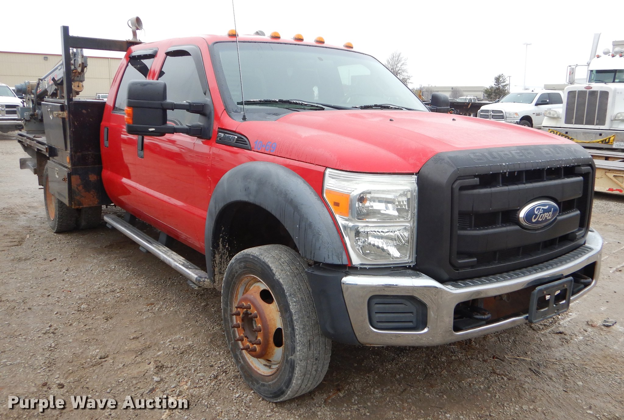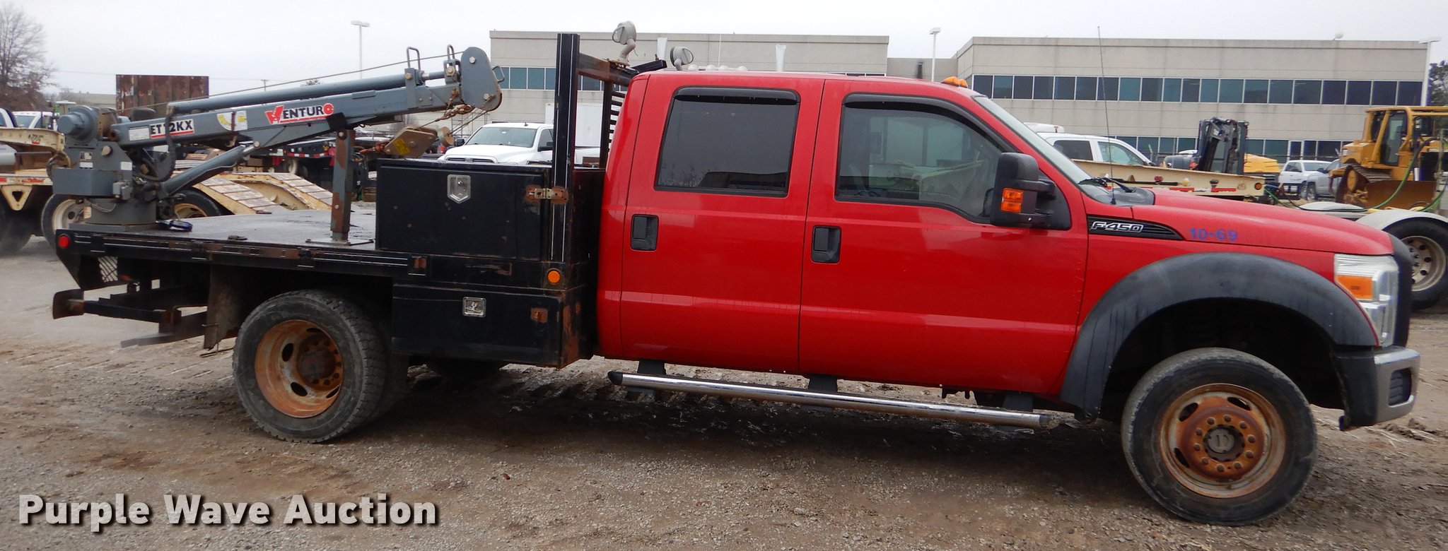 Purple Wave is selling a used Flat Bed Truck in Oklahoma. This item is a 2011 Ford F450 Super Duty Crew Cab flatbed truck with crane with the following: 155,883 miles on odometer, 6.8L V10 SOHC 30V gas engine, Automatic transmission, Four wheel drive, AC and heat, Cruise, Power windows and locks, 9'L x 96"W flatbed, Venturo ET12KX crane, 7' to 15' boom length, 3,500 lbs max lift capacity, Unknown operating condition, Serial 68553, 225/70R19.5 tires, Unit# 10-69