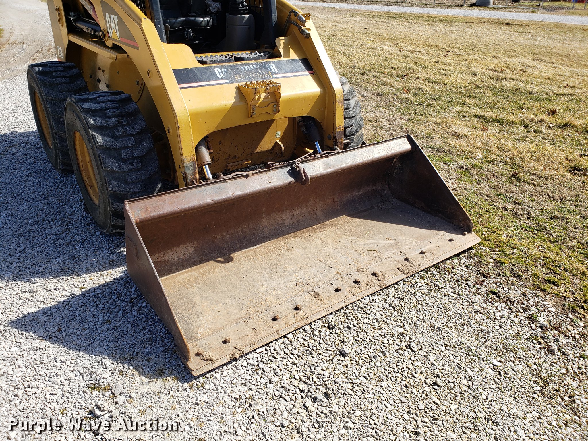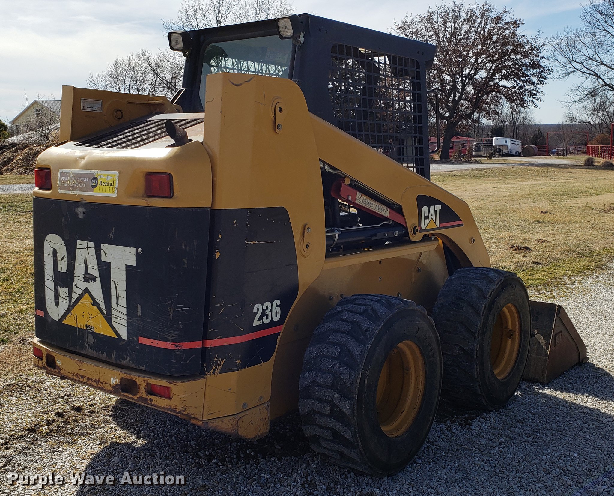 Purple Wave is selling a used Skid Steer Loader in Missouri. This item is a 2001 Caterpillar 236 skid steer with the following: 2,343 hours on meter, Caterpillar four cylinder diesel engine, Hydrostatic transmission, OROPS, Joystick controls, Front and rear work lights, Auxiliary hydraulics, 74"W smooth bucket, 12-16.5 tires, Serial 4YZ02986
