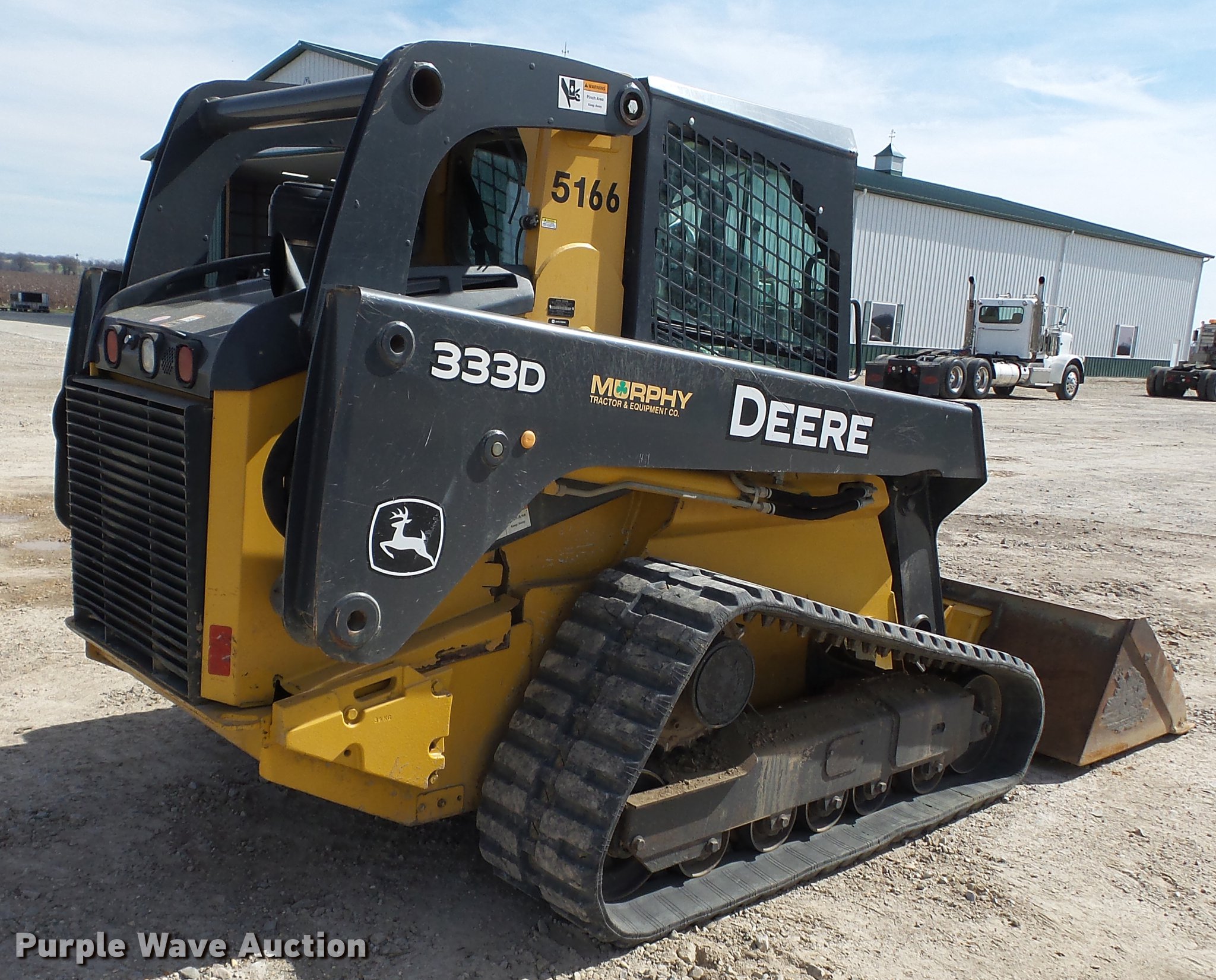 Purple Wave is selling a used Tracked Skid Steer Loader in Missouri. This item is a 2013 John Deere 333D skid steer with the following: 2,805 hours on meter, John Deere E5030HT 183.1 C.I.D. five cylinder diesel engine, 95.4 gross HP, 89 net HP, Two speed hydrostatic transmission, Enclosed cab, AC and heat, AM/FM, Joystick controls, Suspension seat, Front work lights, Wipers, Backup alarm, Block heater, Auxiliary hydraulics, Auxiliary electrical outlet, Hydraulic quick coupler, 84"W bucket, Weld-on cutting edge, Bolt-on teeth, (2) couterweights, 18"W tracks, Serial 1T0333DMECD236432, Unit# 5166