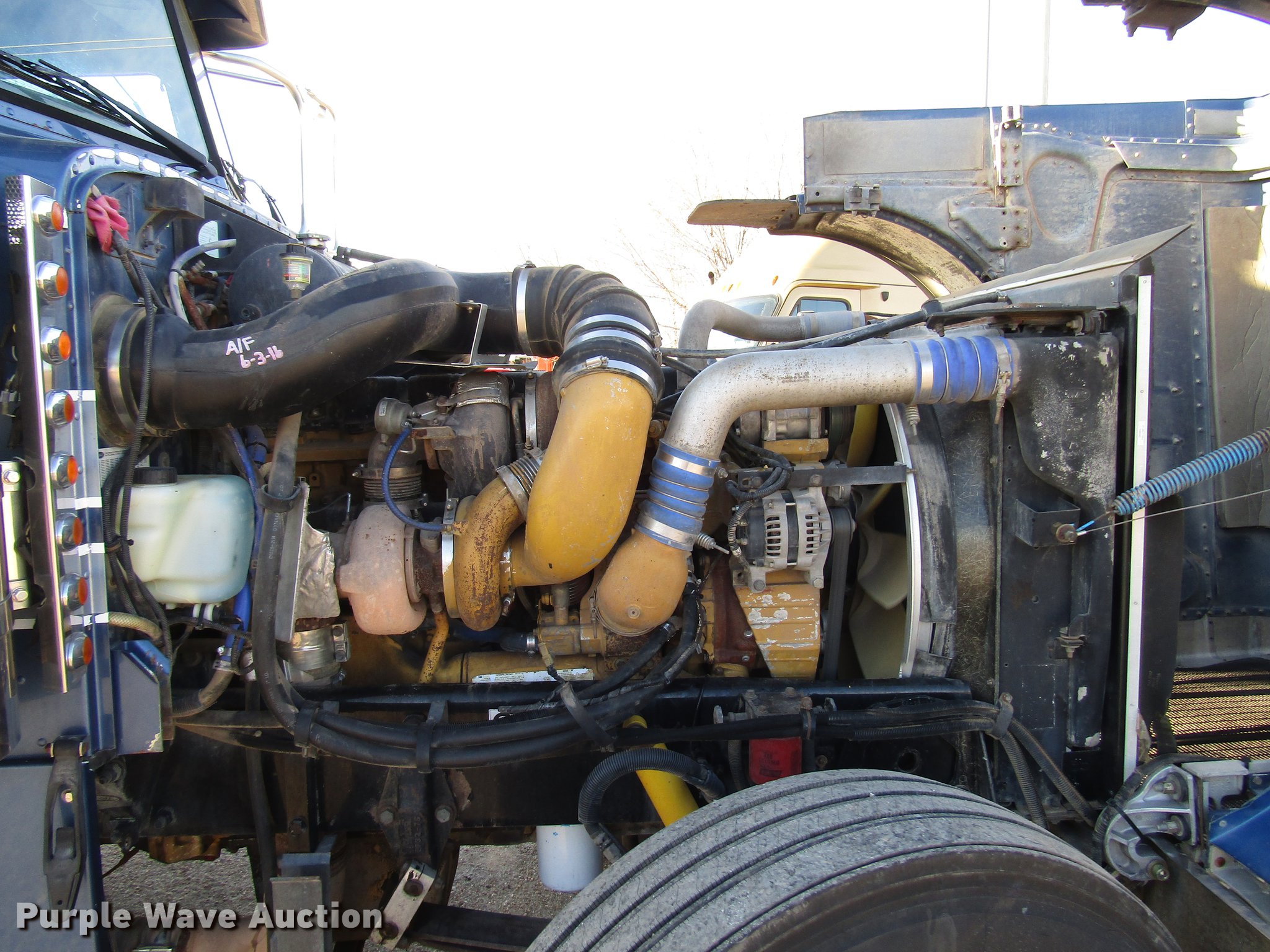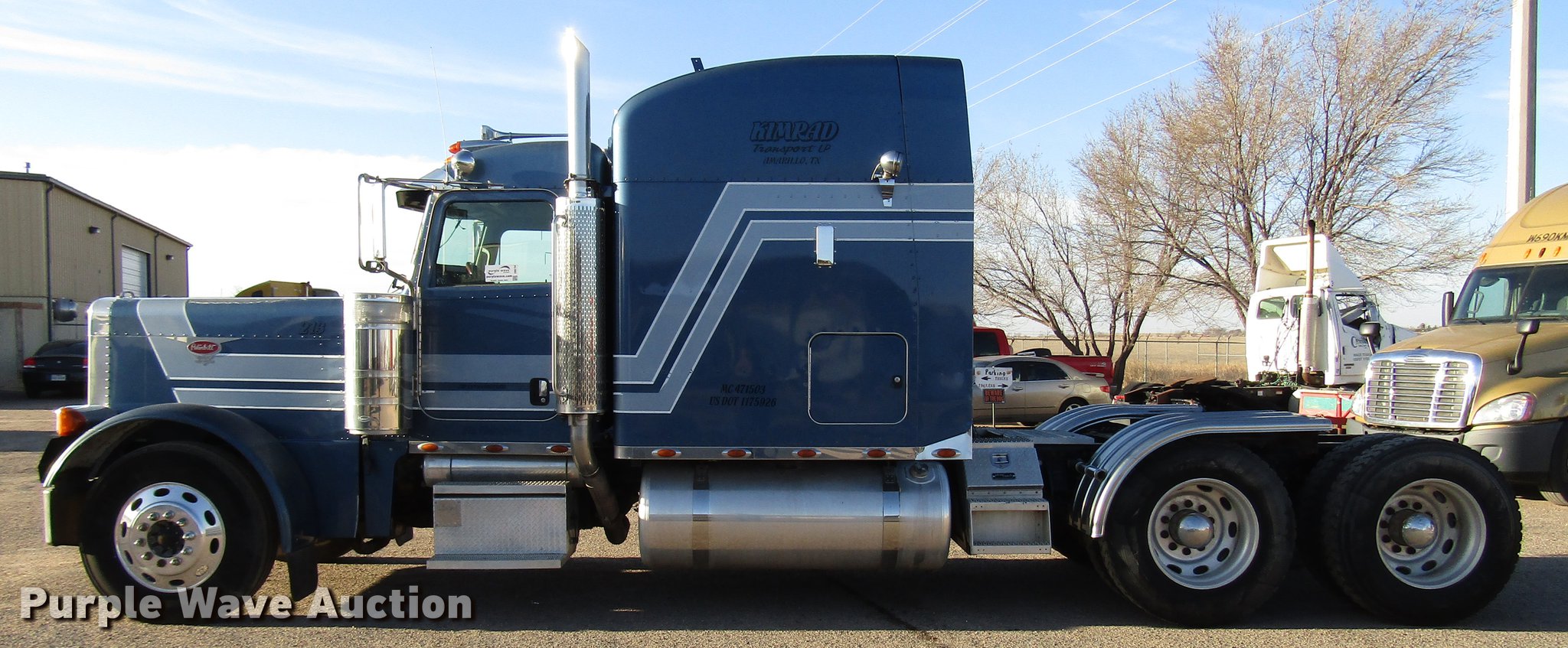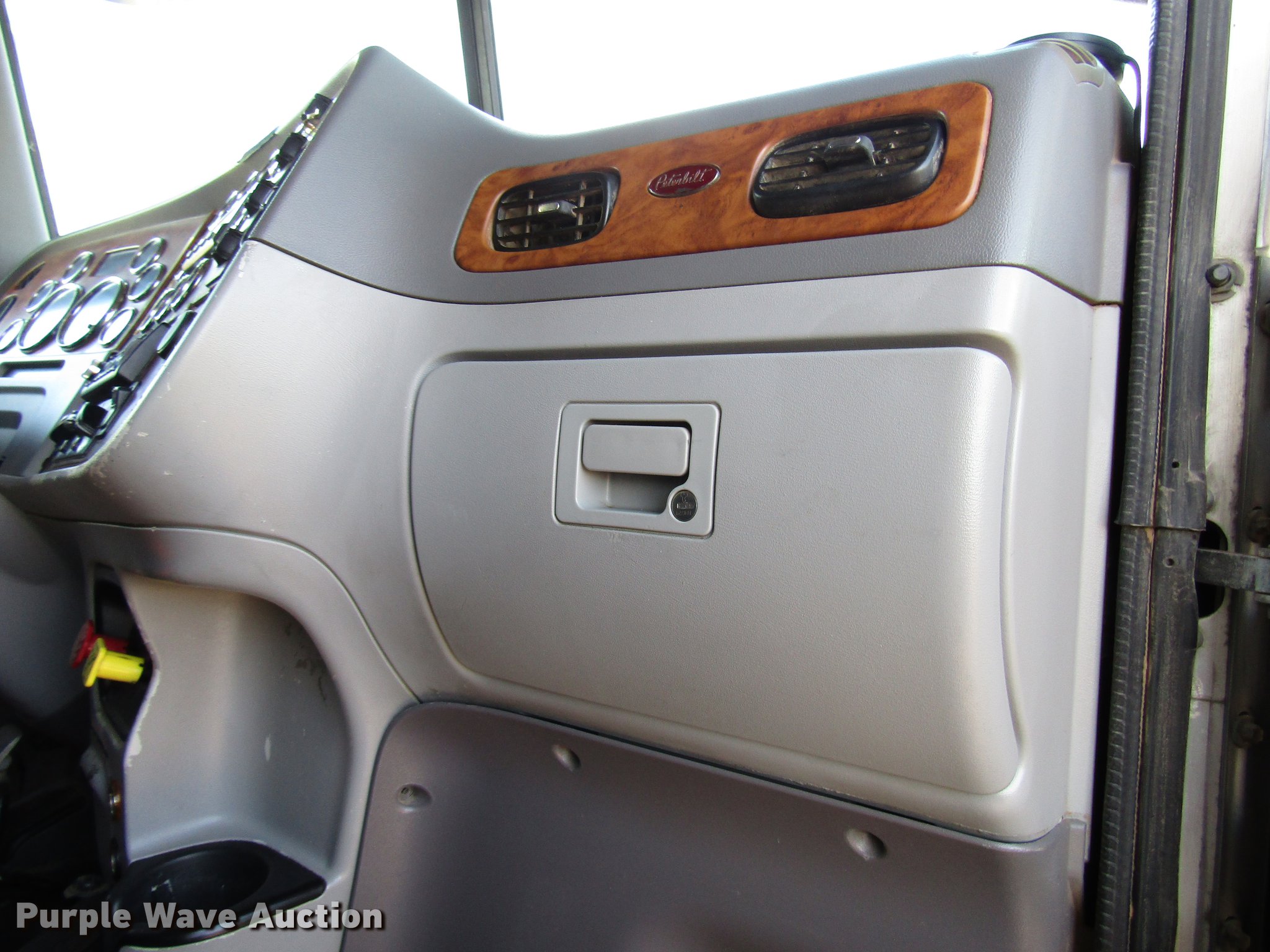 Purple Wave is selling a used Truck Tractor in Texas. This item is a 2007 Peterbilt 379 semi truck with the following: 1,062,890 miles on odometer, 14,679 hours on meter, Caterpillar C15 14.6L L6 turbo diesel engine, 10 speed manual transmission, Tandem axle, Inter-axle differential lock, Cruise, AM/FM/CD, Power locks, Heated mirrors, Air suspension seat, Air ride cab, 68"L sleeper, Single bed, Refrigerator, Rear climate control, Dump valves, Wet kit, Exterior visor, Dual rear exhaust stacks, Sliding fifth wheel plate, Dual fuel tanks, Half fenders, Air suspension, Air brakes, Engien brake, 258" wheelbase, 11R24.5 tires, GVWR 52,000 lbs, FAWR 12,000 lbs, IAWR 20,000 lbs, RAWR 20,000 lbs, Cracked windshield, Hail damage
