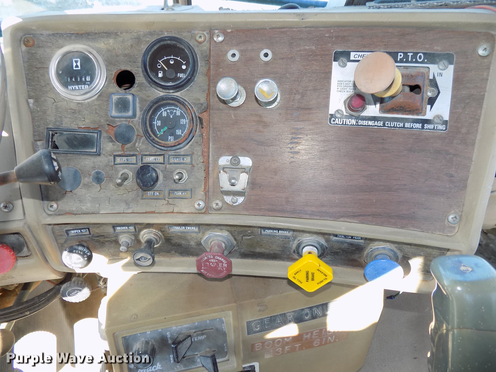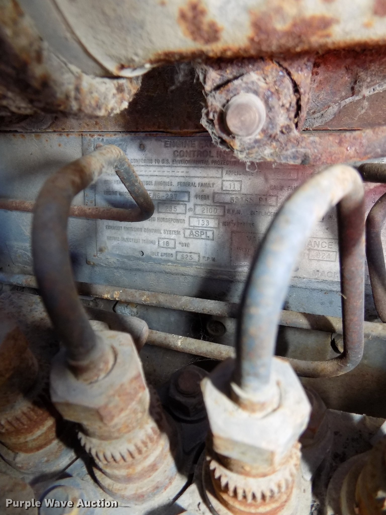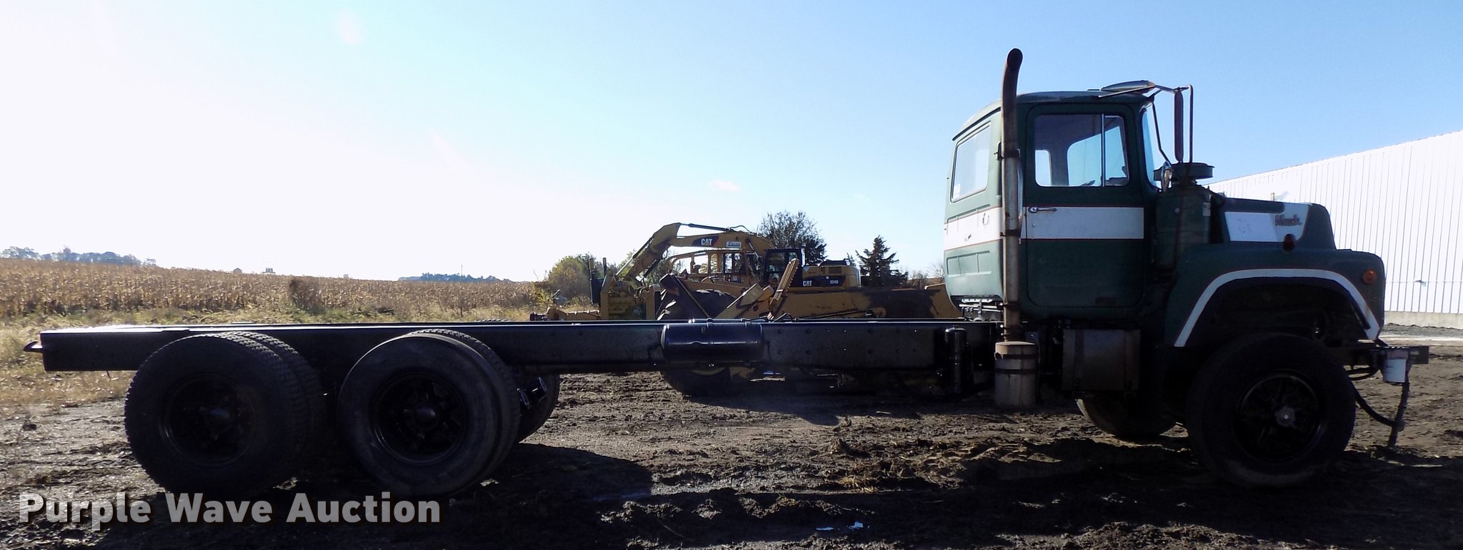 Purple Wave is selling a used Truck Chassis in Nebraska. This item is a 1984 Mack DM685S truck cab and chassis with the following: 79,673 miles on odometer, 4,488 hours on meter, 7,479 hours on second meter, Mack EM6 11.0L L6 turbo diesel engine, Maxitorque Extended Range five speed manual transmission, Two speed rear end, Tandem axle, Heat, AM/FM, Air suspension seat, Front mounted PTO, Front tow hook, Single fuel tank, Single exhaust stack, 239" wheelbase, 257" from rear of cab to rear of frame, Camelback suspension, Air brakes, 11R22.5 front tires, 10.00R20 rear tires, Contents included, PTO shaft disconnected, Unknown operating condition of radio