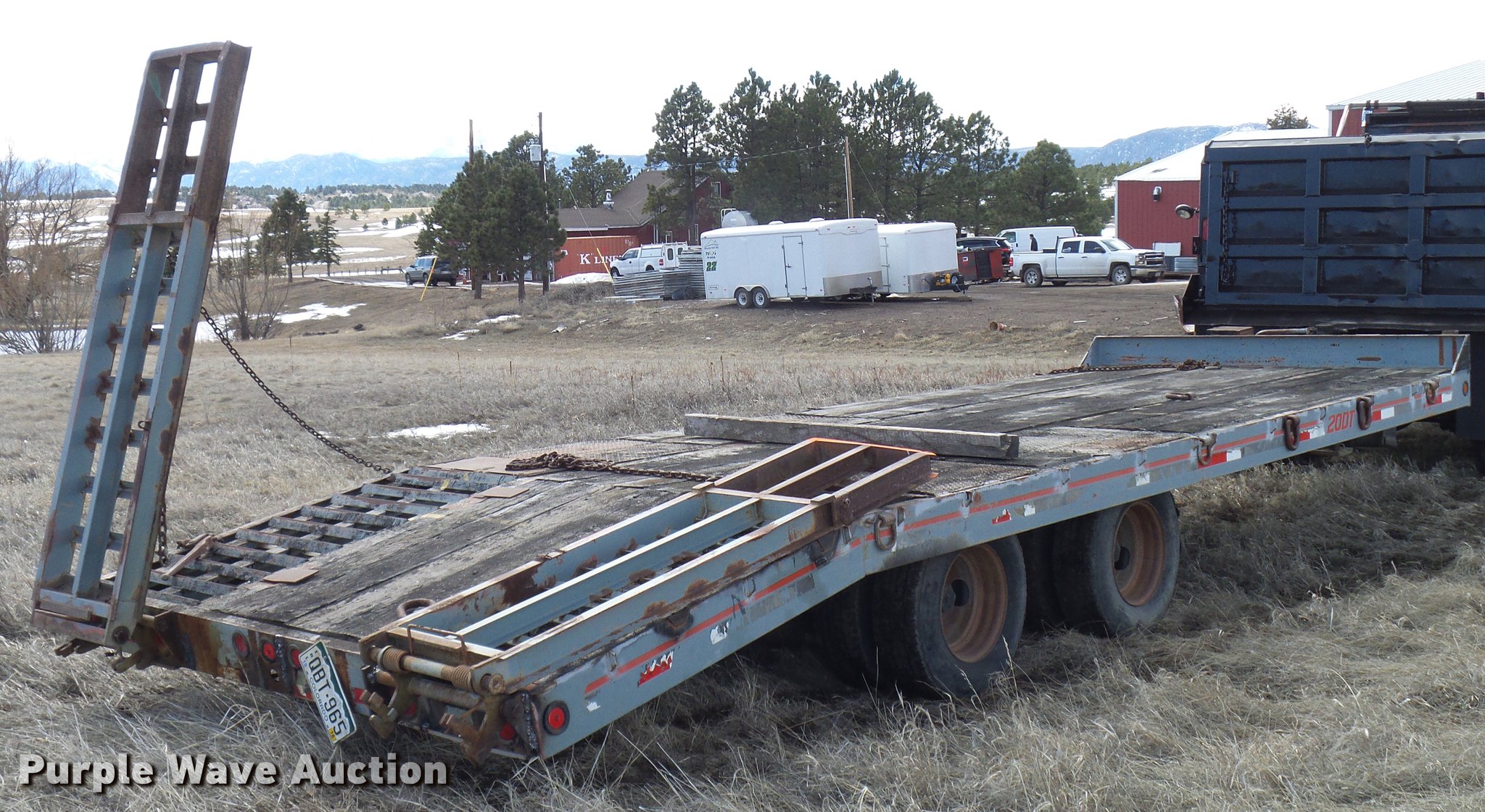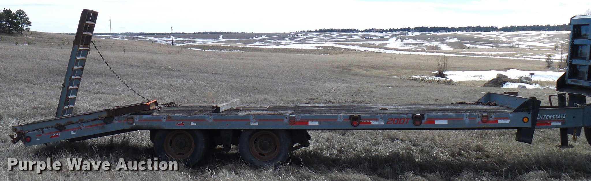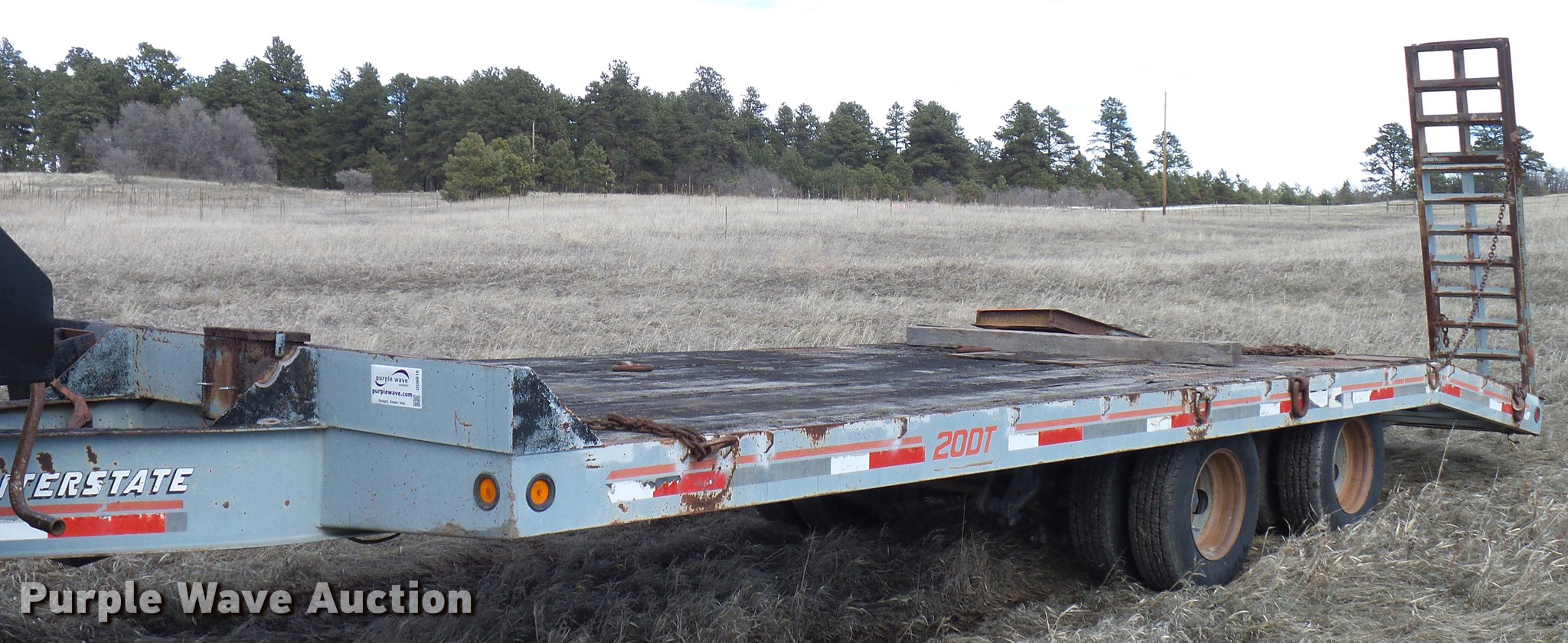 Purple Wave is selling a used Equip. Trailer in Colorado. This item is a 1997 Interstate 20DT equipment trailer with the following: 39.5' overall length, 19'L x 93"W wood deck, 5.5'L dovetail, 80"L ramps, 34" floor height, D-ring tie downs, Pintle hitch, Single leg landing gear, Spring suspension, Electric brakes, Tandem axles, Steel wheels, 19.50R16.5 tires, GVWR 25,907 lbs, GAWR 9,440 lbs