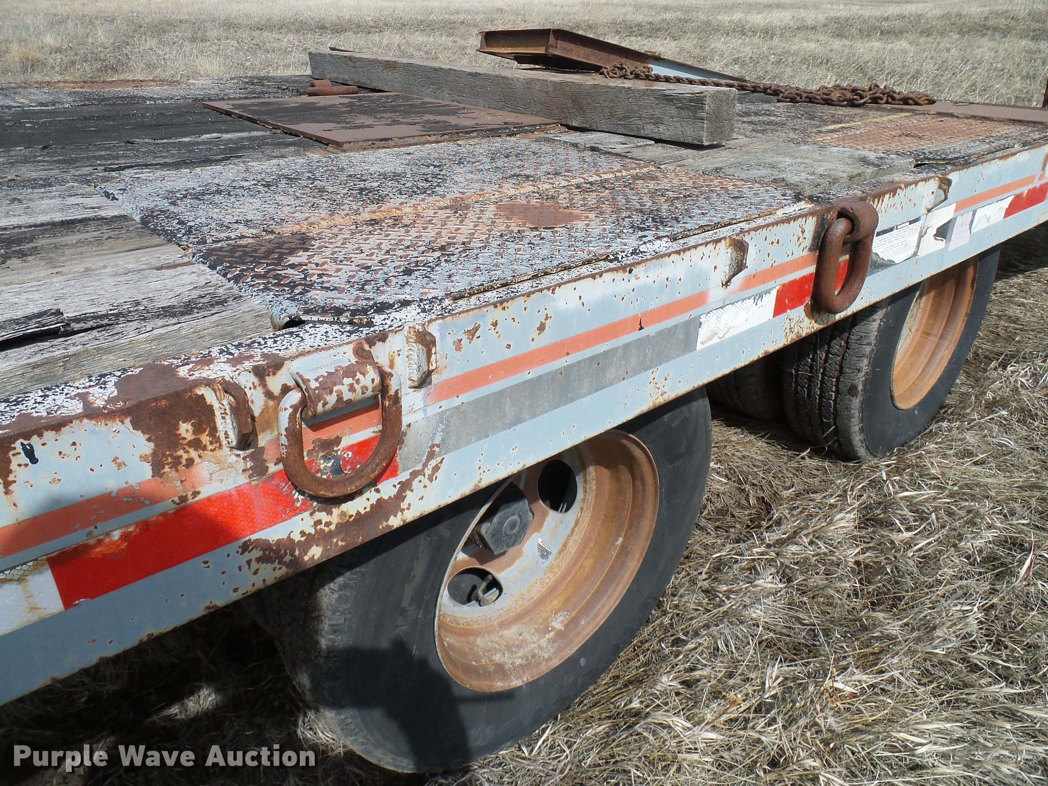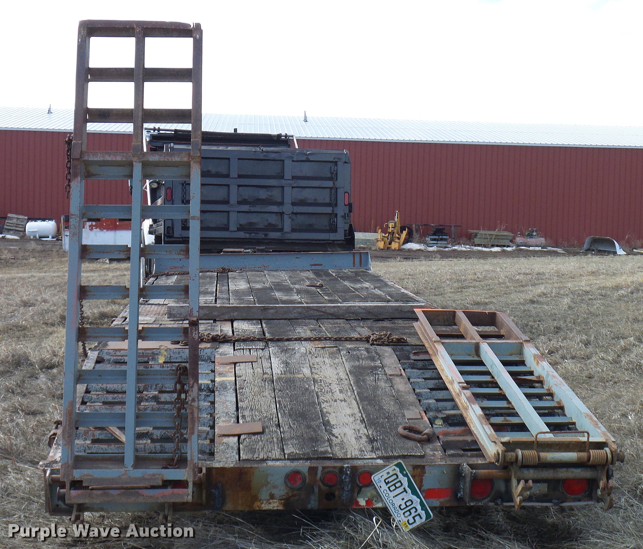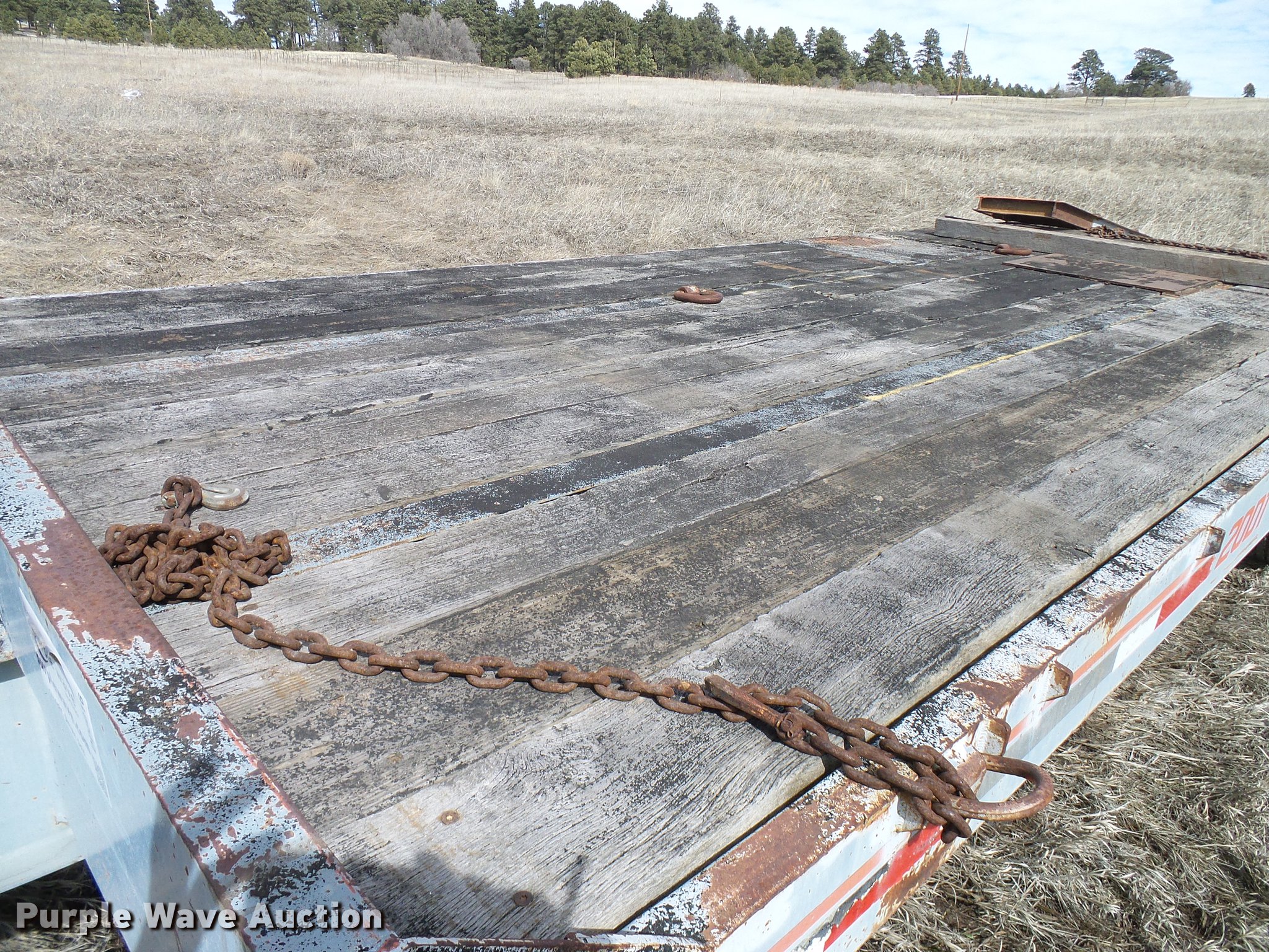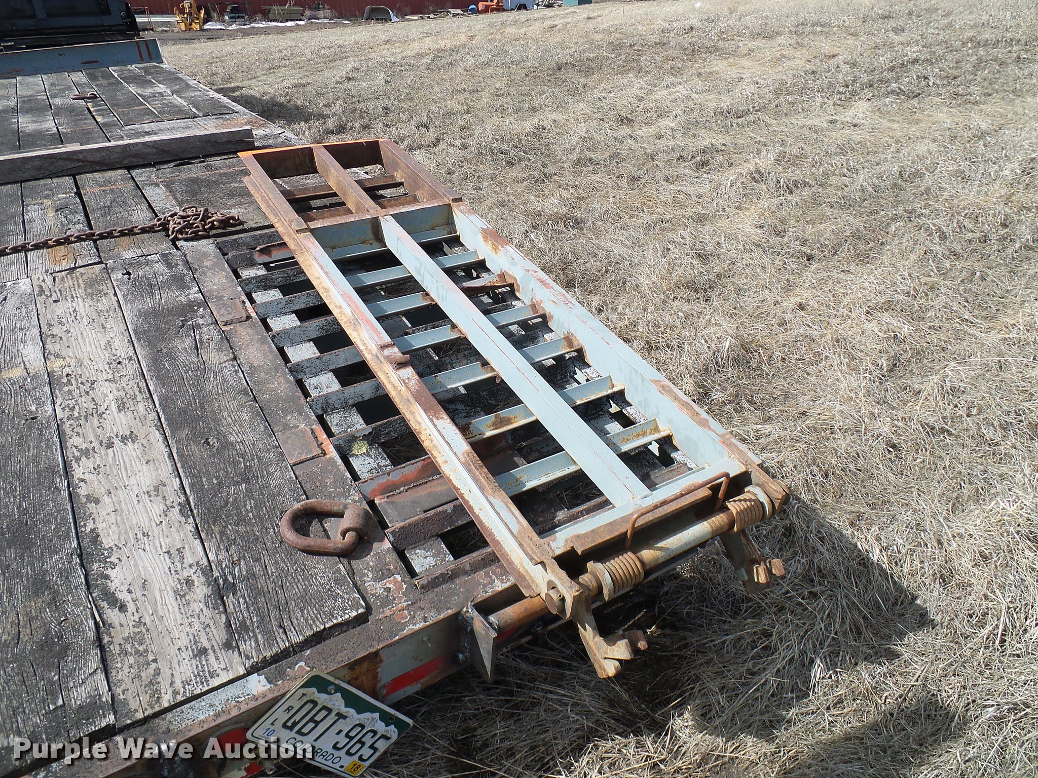 Purple Wave is selling a used Equip. Trailer in Colorado. This item is a 1997 Interstate 20DT equipment trailer with the following: 39.5' overall length, 19'L x 93"W wood deck, 5.5'L dovetail, 80"L ramps, 34" floor height, D-ring tie downs, Pintle hitch, Single leg landing gear, Spring suspension, Electric brakes, Tandem axles, Steel wheels, 19.50R16.5 tires, GVWR 25,907 lbs, GAWR 9,440 lbs