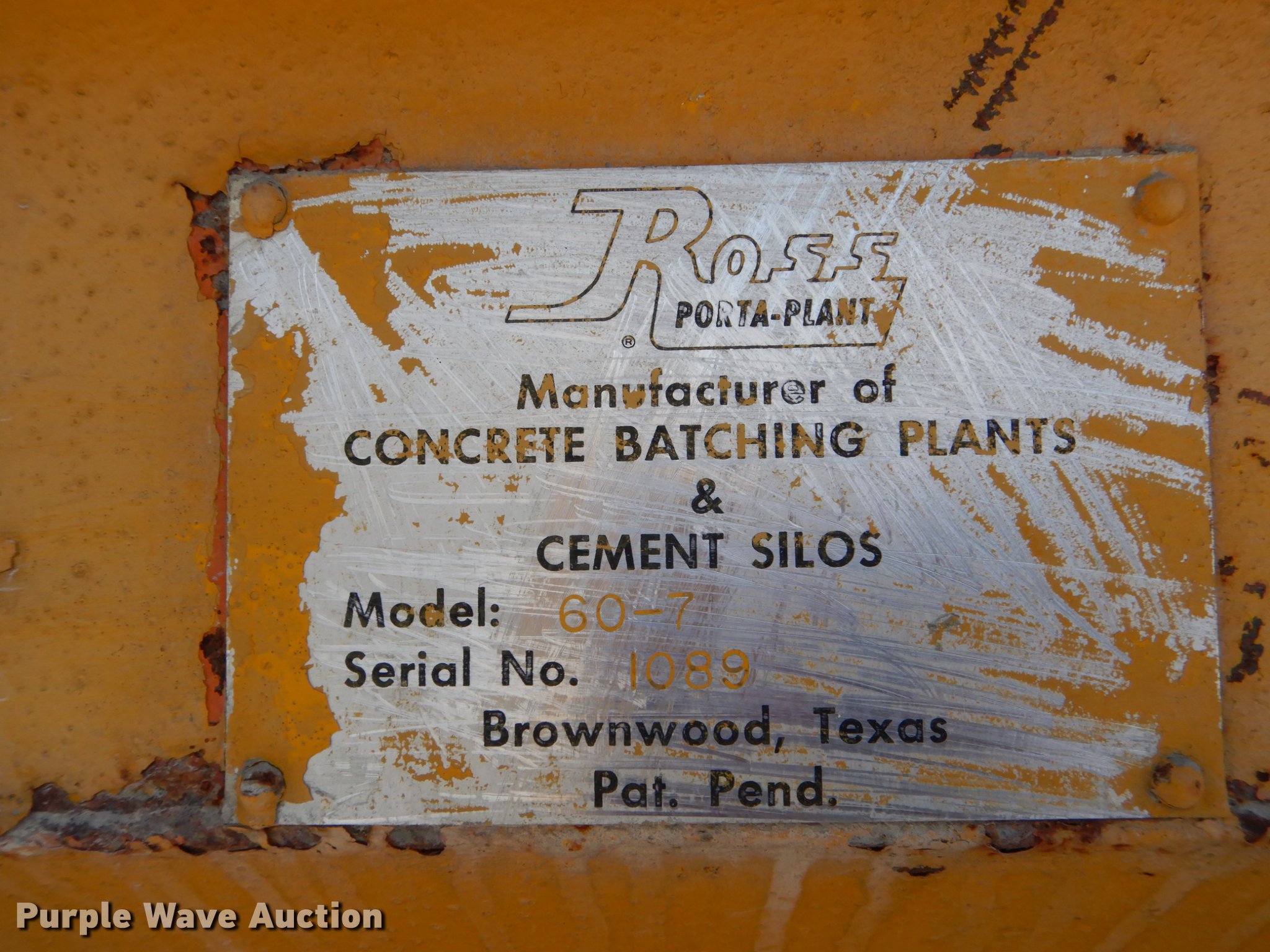 Purple Wave is selling a used Concrete Plant in Missouri. This item is a Ross 60-7 concrete plant with the following: 5 1/2 cu. yd. batch capacity, Silo, Hopper, Feed bin, Control panel, Hot water heater, One million BTU, Tank, Sioux D-1000 heater, Serial 118901, Neptune 432 water gauge, Building and concrete blocks not included, Serial 1089