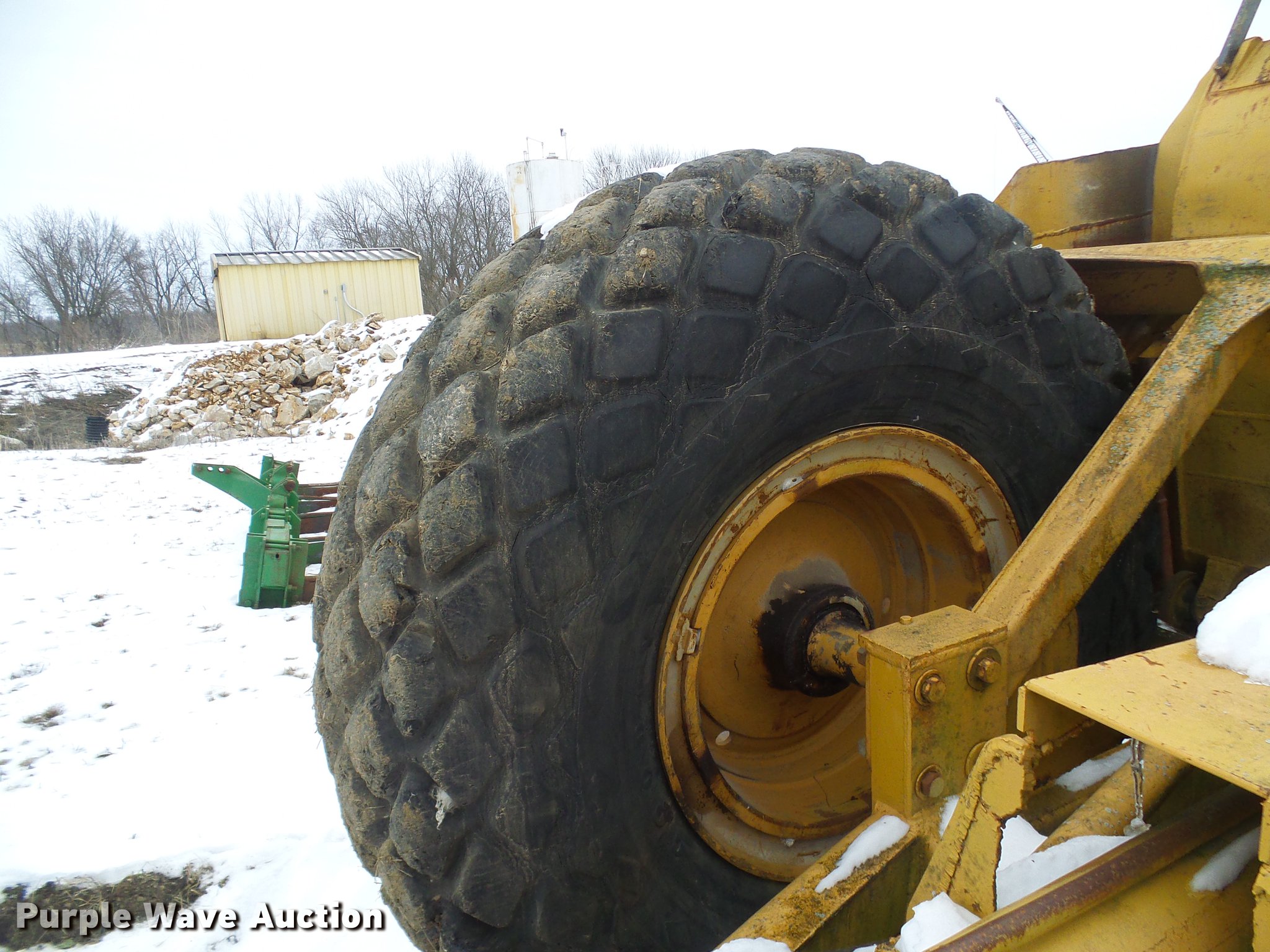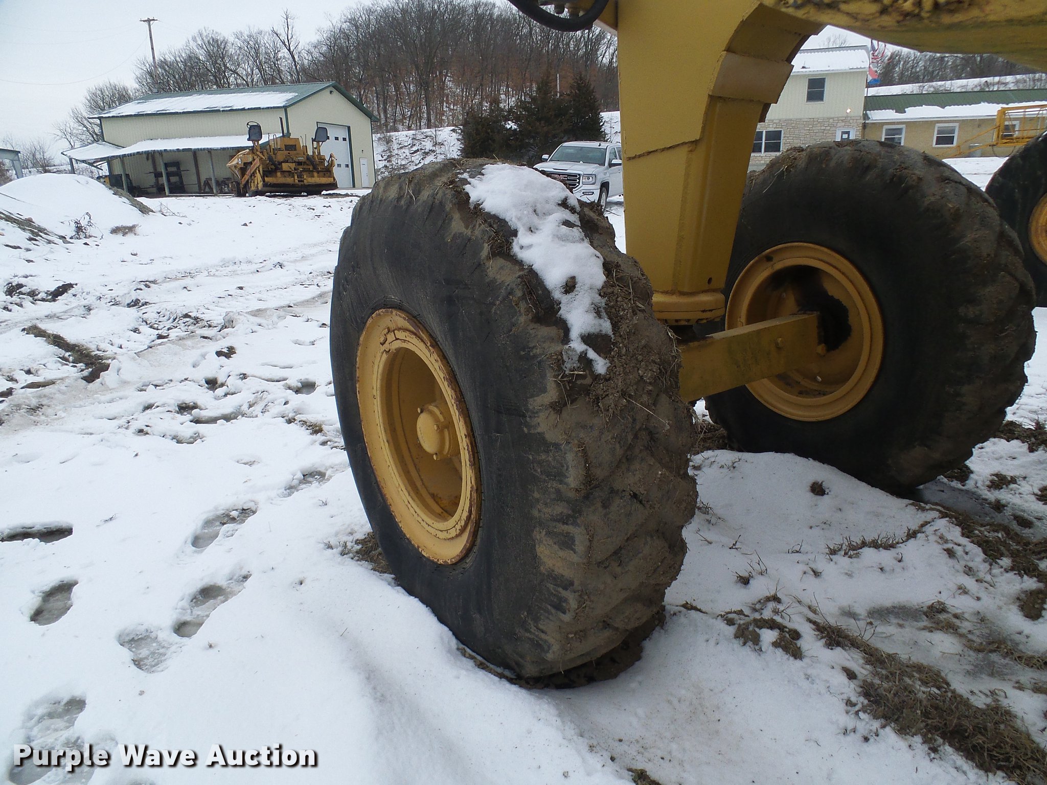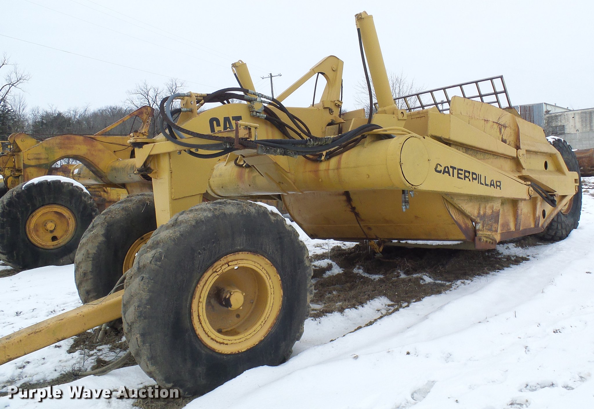 Purple Wave is selling a used Pull Type Scraper in Missouri. This item is a Caterpillar 80 scraper with the following: Approximately 10' bowl width, Hydraulic height adjustment, Rear push block, Pin hitch, 18-24 front tires, 24-29 rear tires