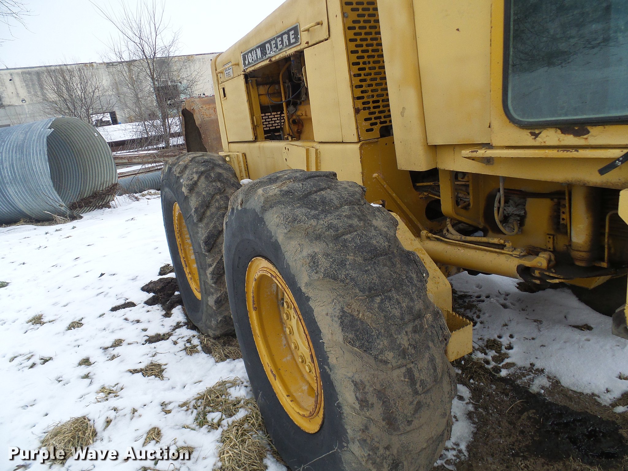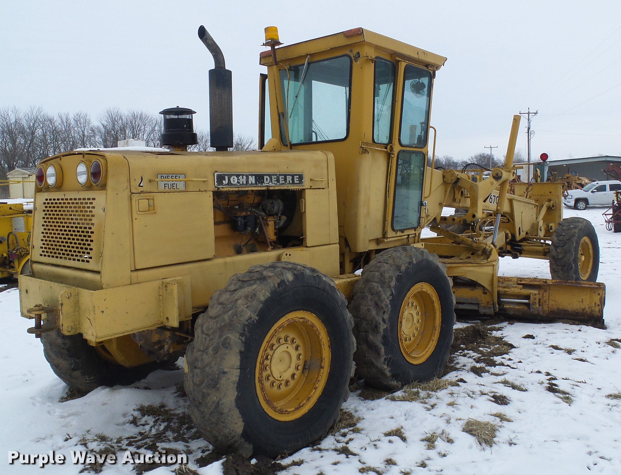 Purple Wave is selling a used Motor Grader in Missouri. This item is a 1980 John Deere 670A motor grader with the following: 4,442 hours on meter, John Deere six cylinder diesel engine, Powershift transmission, 8F-8R gears, Differential lock, EROPS, Suspension seat, Four control valves, Front work lights, 14'W moldboard, Tip control, Side shift, Front mounted scarifier, (4) teeth, 14.00-24 tires, Windshield broken, Serial 08053T