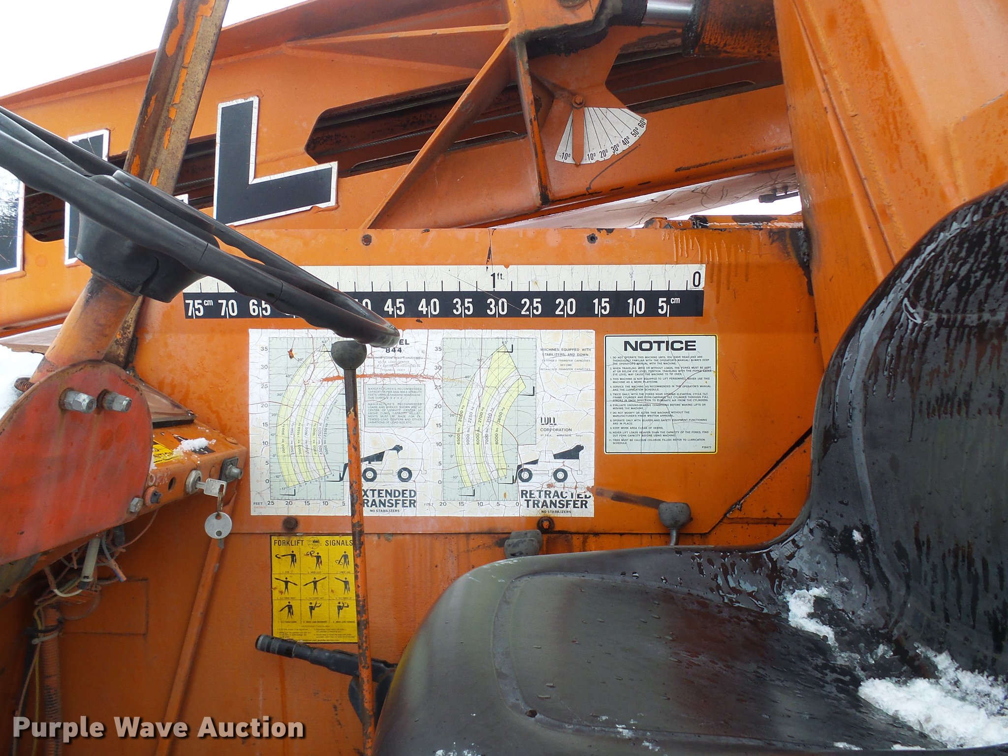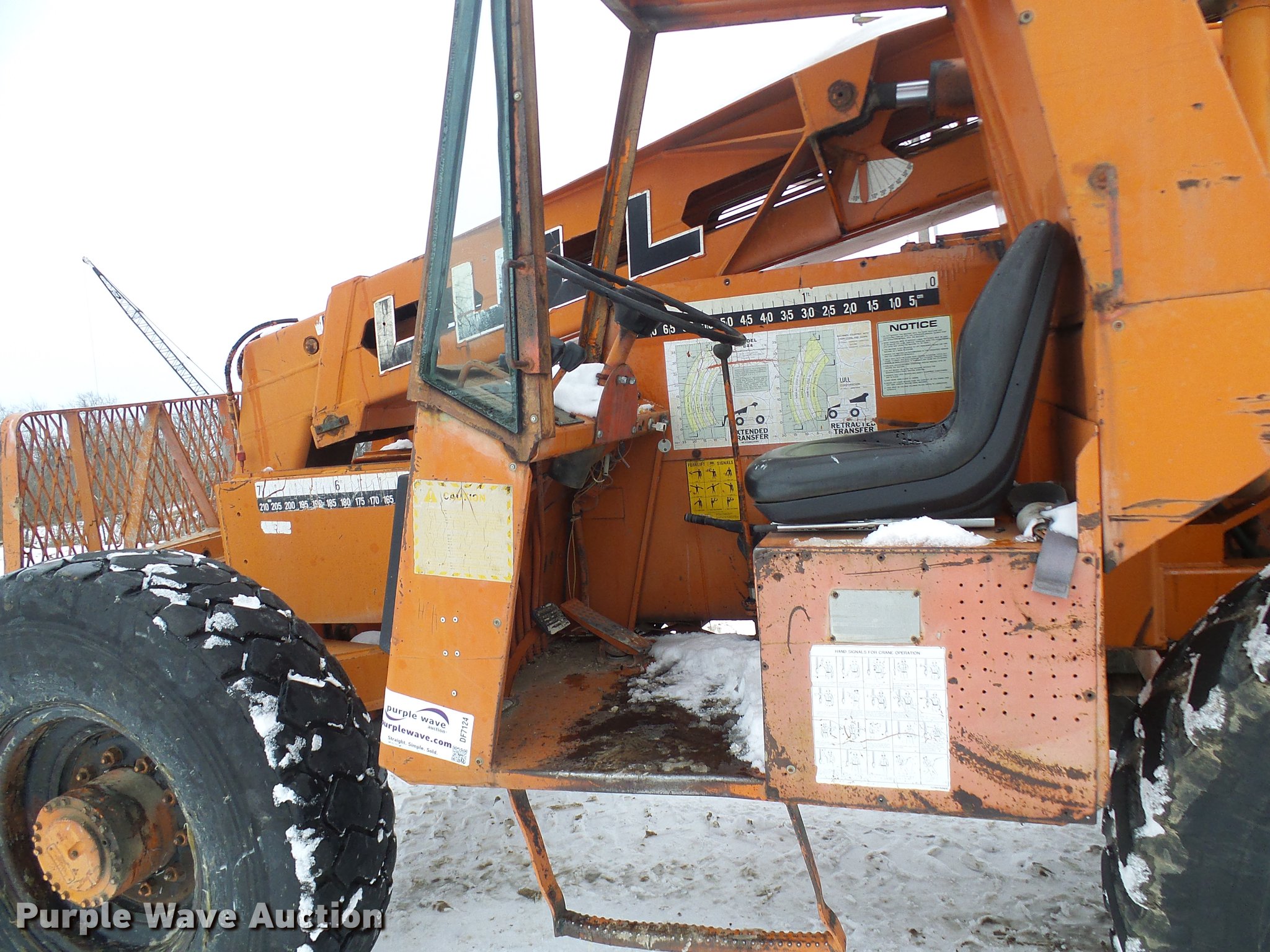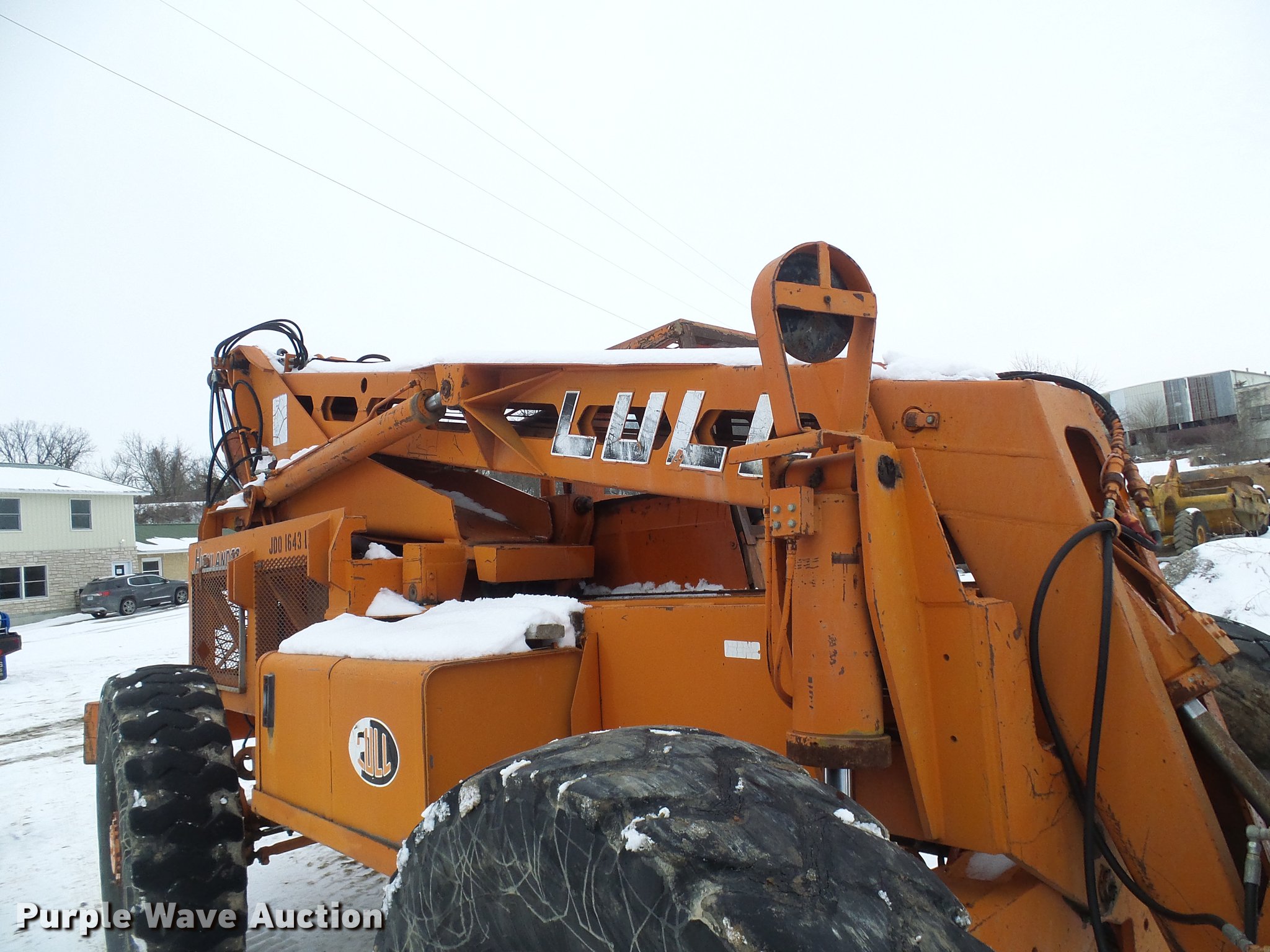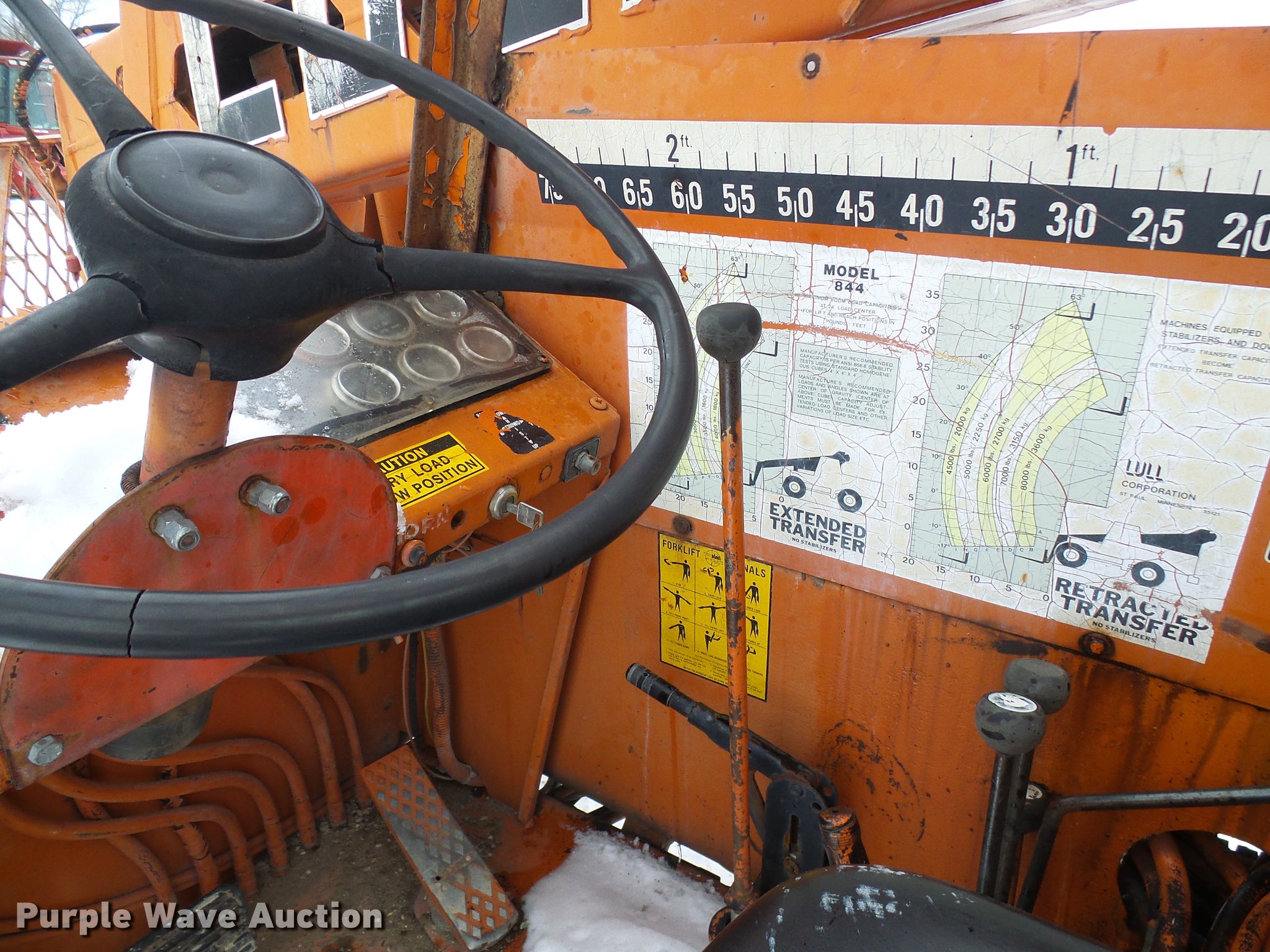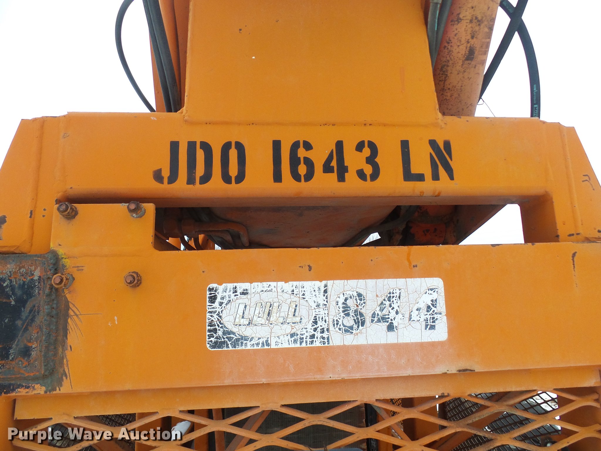 Purple Wave is selling a used Telehandler in Missouri. This item is a Lull 844 telehandler with the following: 2,064 hours on meter, John Deere four cylinder diesel engine, Shuttle shift transmission, 4F-4R gears, Four wheel drive, Crab steer, 8,000 lbs maximum lift capacity, 34' maximum lift height, 42"L forks, Tilt carriage, 14.00-24 tires, Serial JD01643LN
