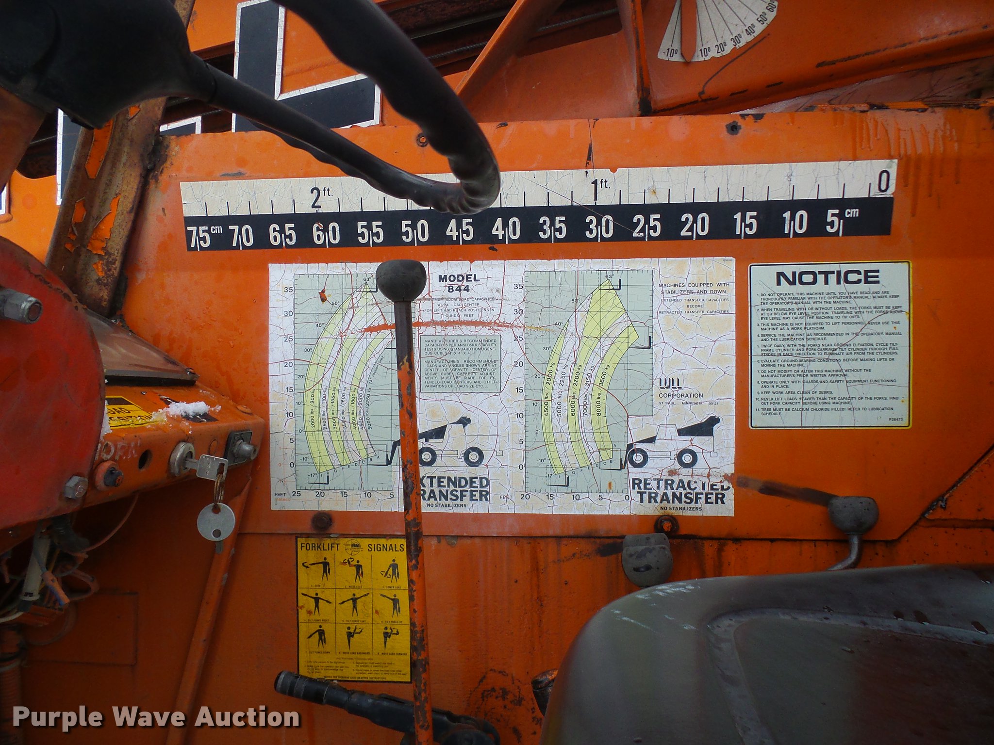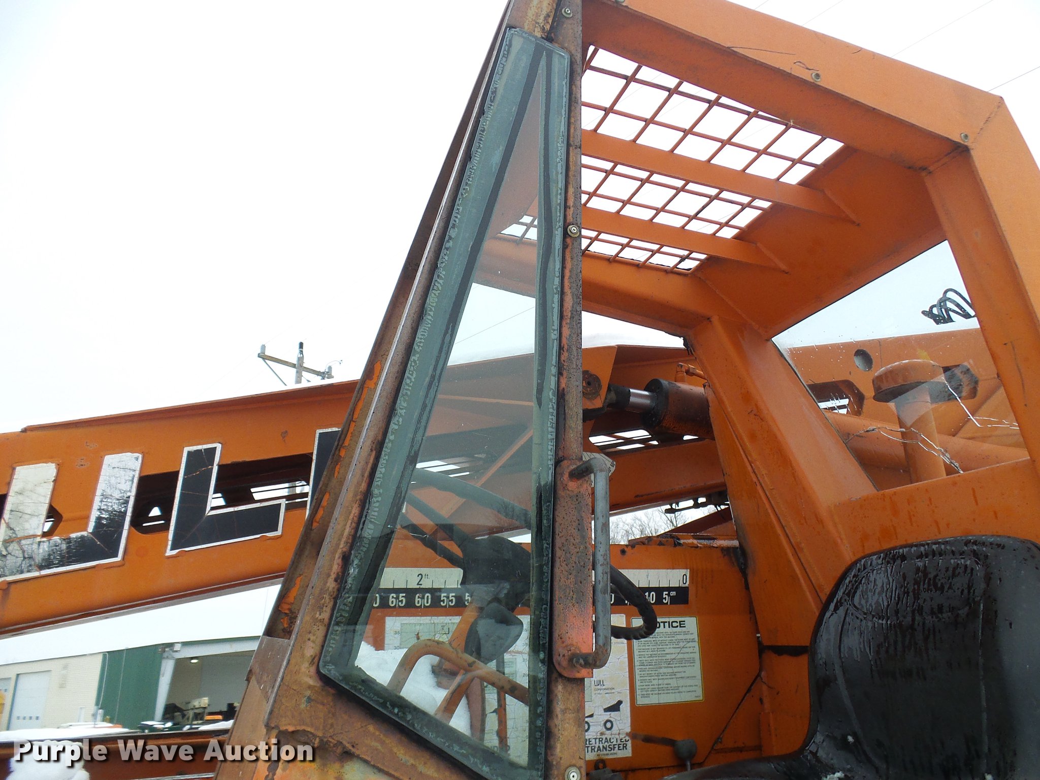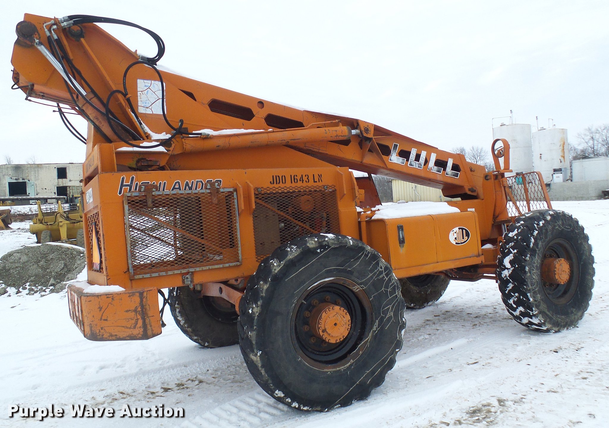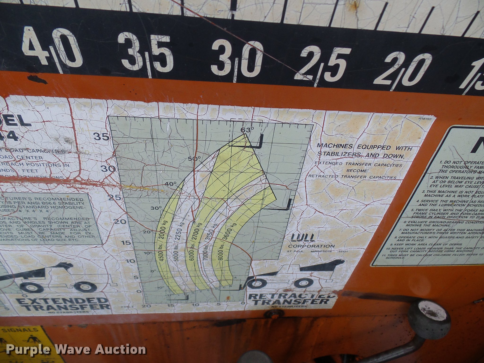 Purple Wave is selling a used Telehandler in Missouri. This item is a Lull 844 telehandler with the following: 2,064 hours on meter, John Deere four cylinder diesel engine, Shuttle shift transmission, 4F-4R gears, Four wheel drive, Crab steer, 8,000 lbs maximum lift capacity, 34' maximum lift height, 42"L forks, Tilt carriage, 14.00-24 tires, Serial JD01643LN