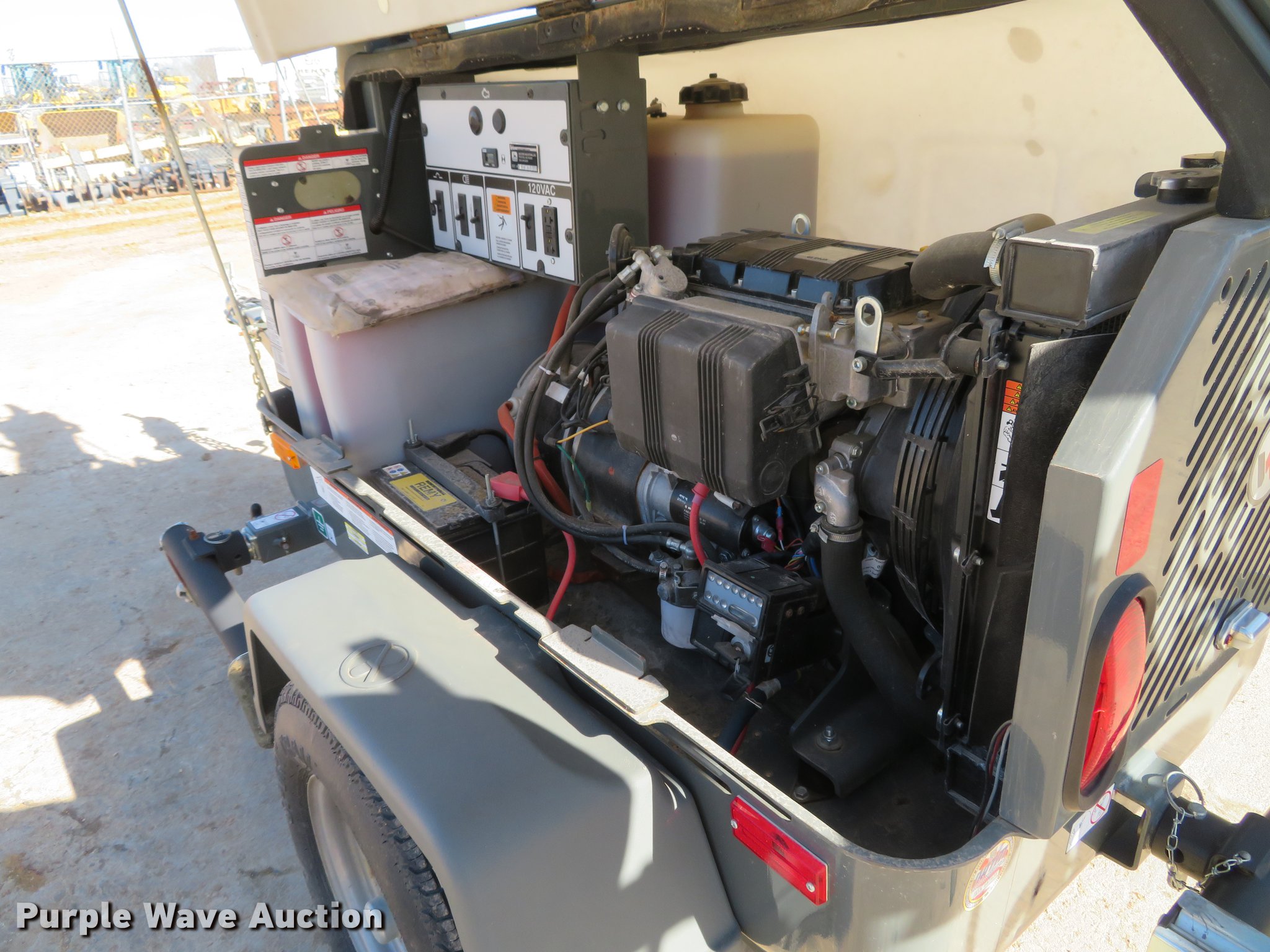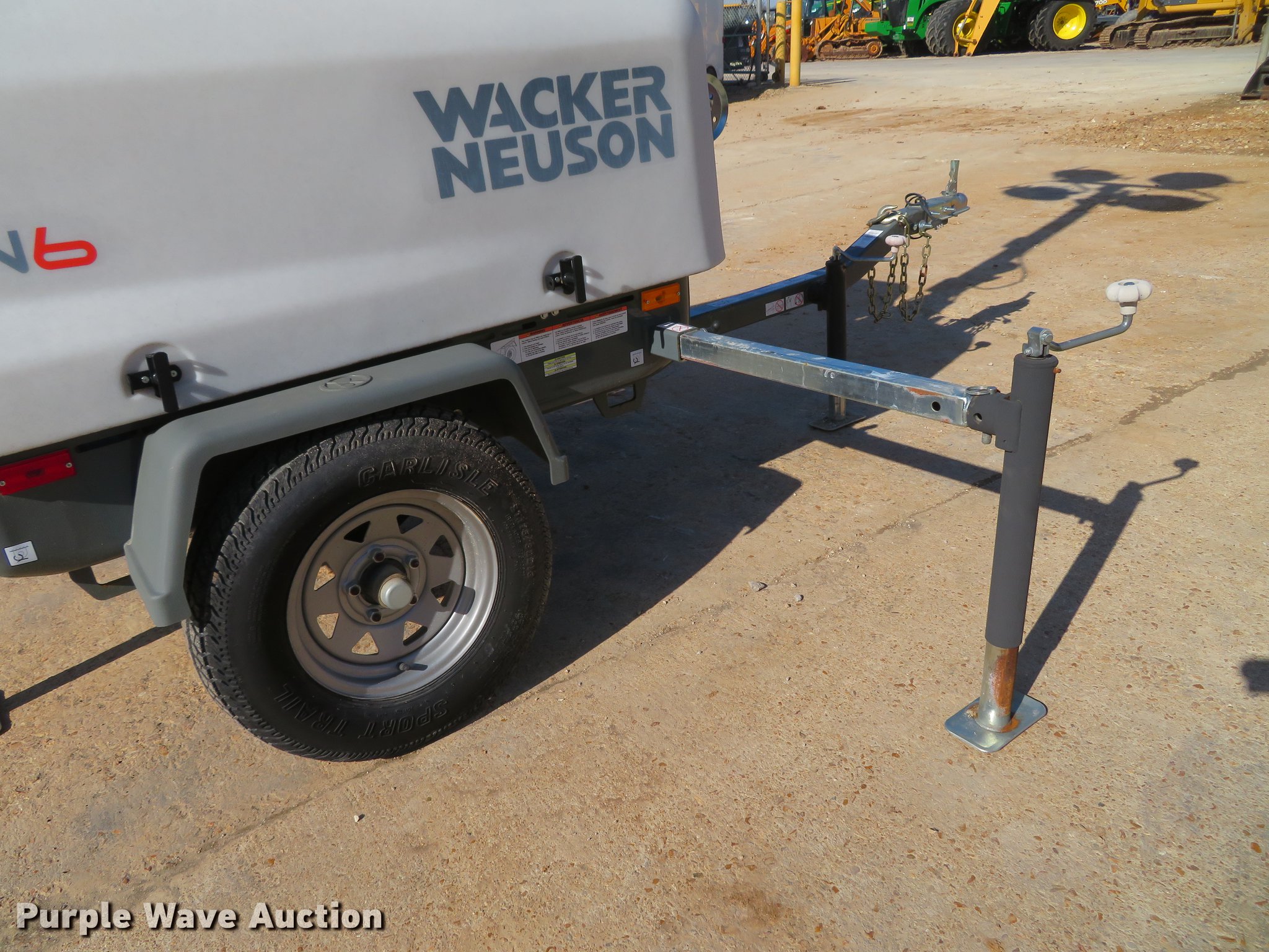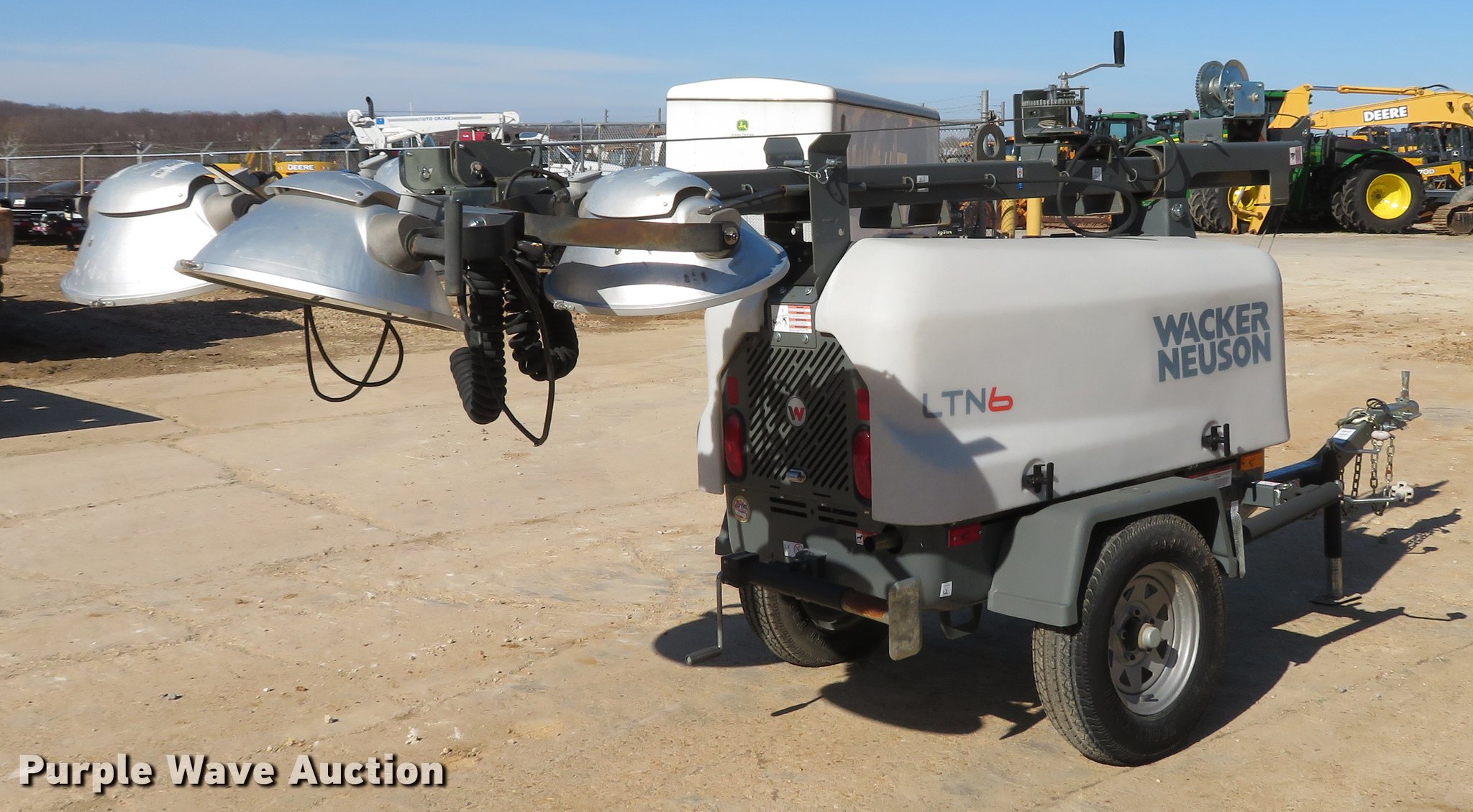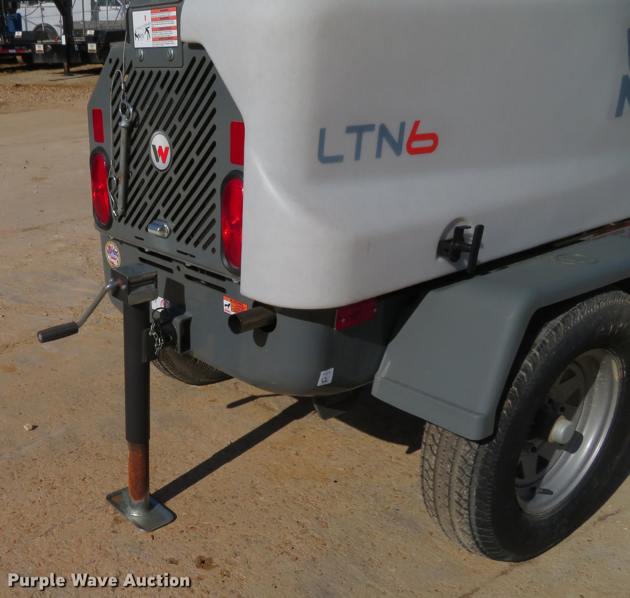 Purple Wave is selling a used Light Plant in Missouri. This item is a 2013 Wacker Neuson LTN6 light plant with the following: 532 hours on meter, Kohler three cylinder diesel engine, 13.4 HP, 6 kW generator, (2) 120V outlets, 20 amp, (4) bulbs, 1,000 watts, 30' tower height, Manual hoist, (4) stabilizers, 2" ball hitch, ST175/80D13 tires, Unit# 65833