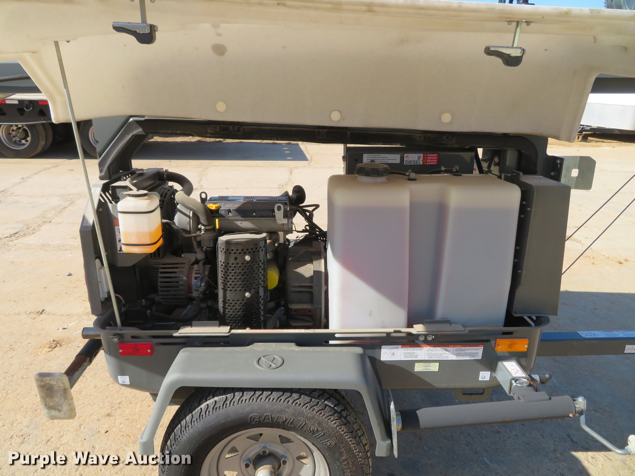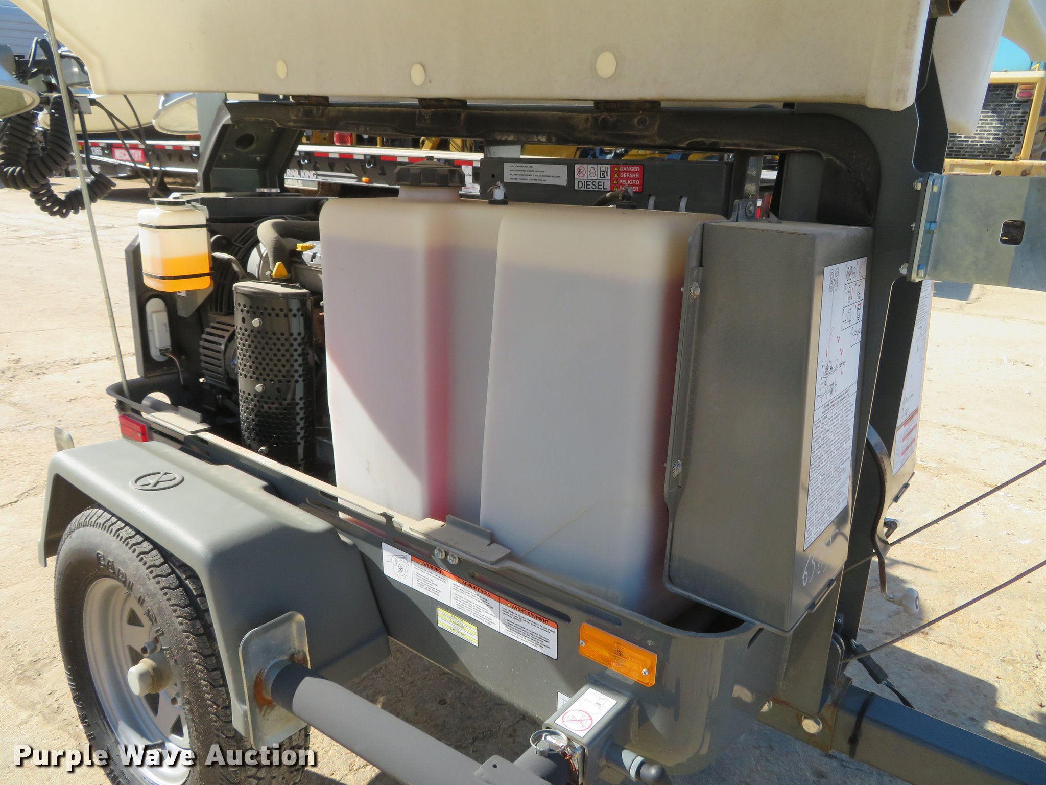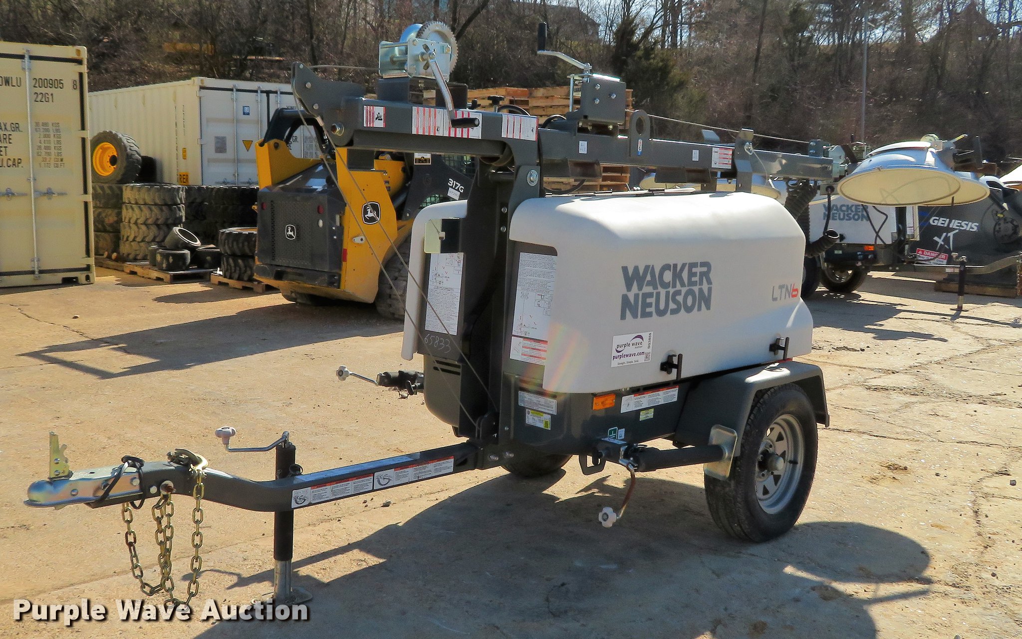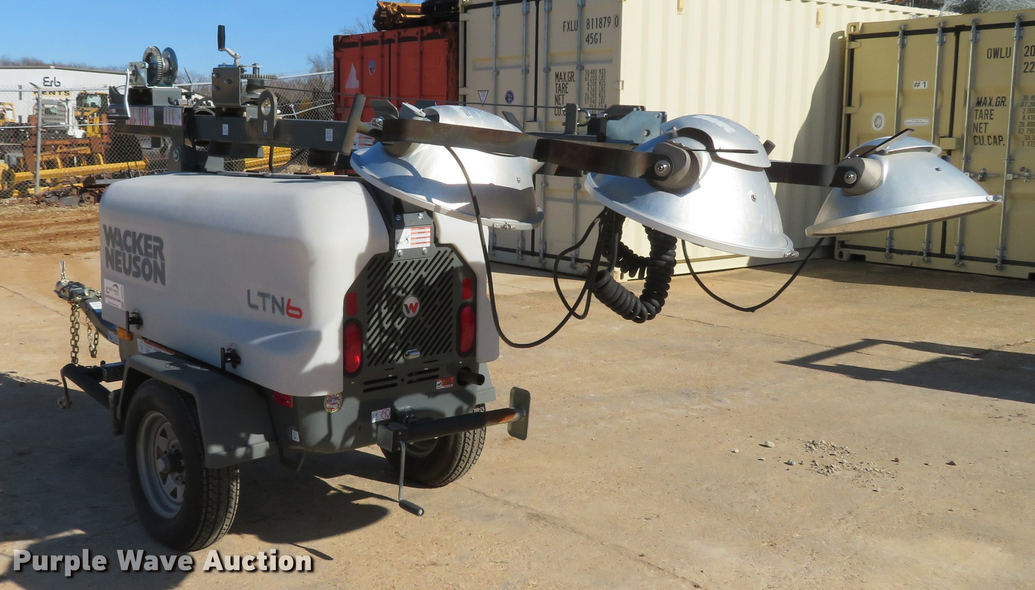 Purple Wave is selling a used Light Plant in Missouri. This item is a 2013 Wacker Neuson LTN6 light plant with the following: 532 hours on meter, Kohler three cylinder diesel engine, 13.4 HP, 6 kW generator, (2) 120V outlets, 20 amp, (4) bulbs, 1,000 watts, 30' tower height, Manual hoist, (4) stabilizers, 2" ball hitch, ST175/80D13 tires, Unit# 65833