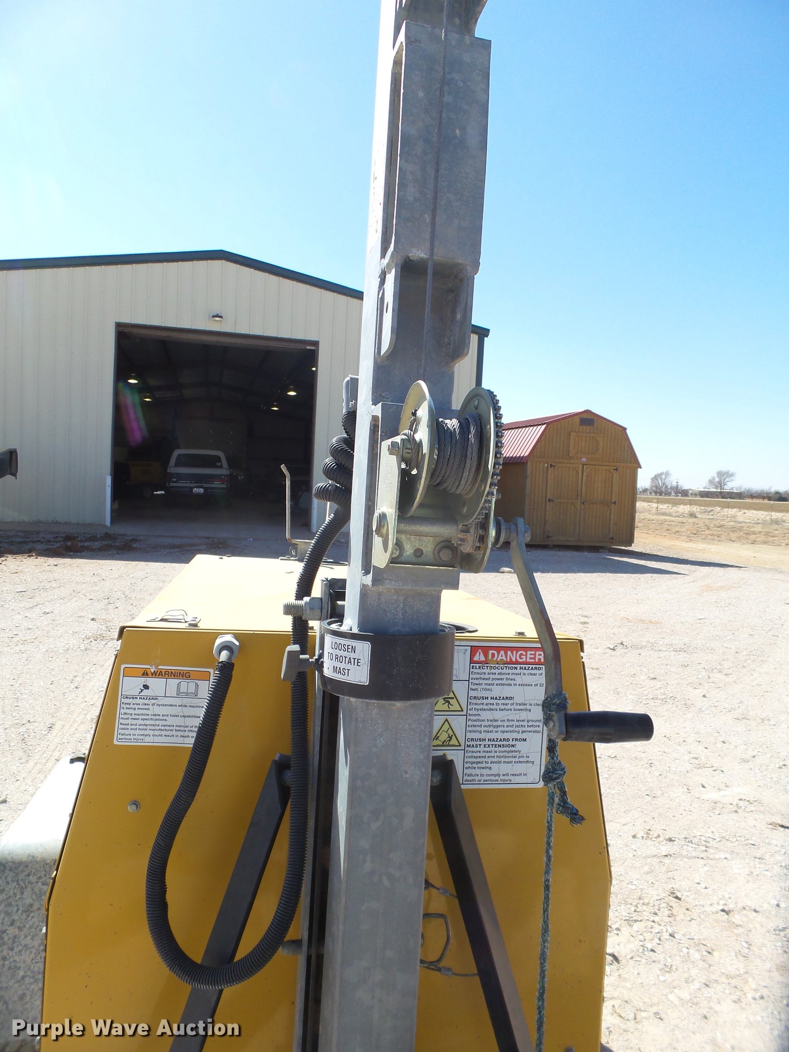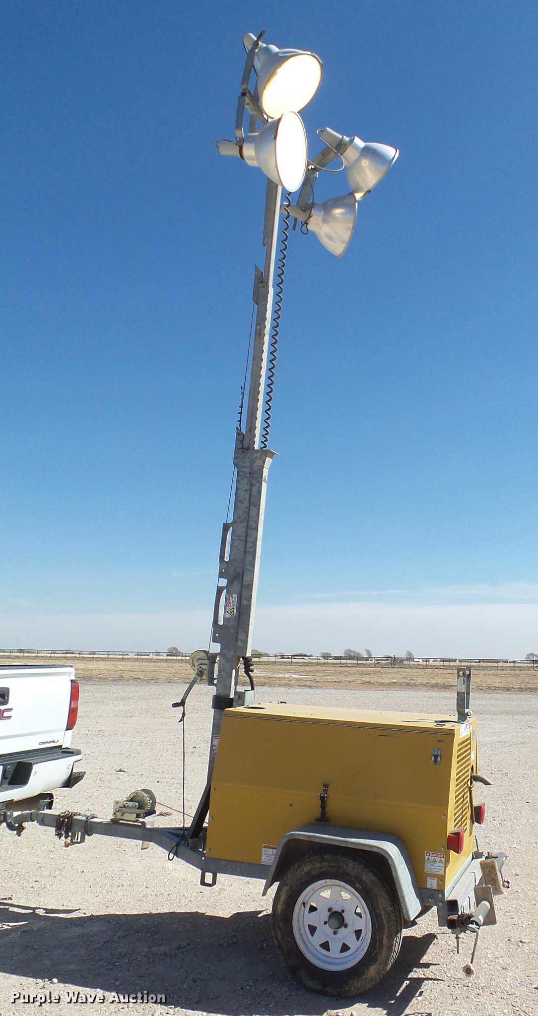 Purple Wave is selling a used Light Plant in Texas. This item is a Warren Power Systems WCN64MH light plant with the following: 2,008 hours on meter, Caterpillar three cylinder diesel engine, 110V outlet, (4) lights, Manual tower lift, (3) Bulldog stabilizers, 2" ball hitch, Single axle, 205/75R15 tires, Serial C08-05-03237