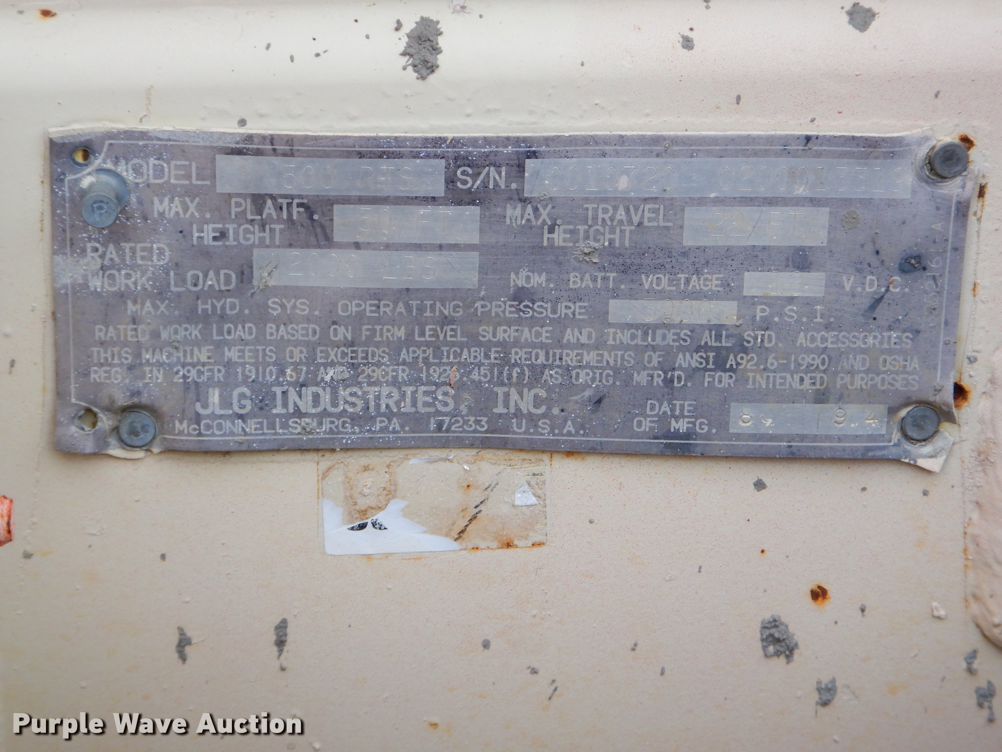 1994 JLG 500RTS scissor lift. Four cylinder dual fuel engine Propane and gas capable, Four wheel drive, 2,000 lbs maximum lift capacity, 50' maximum lift height, 14'L x 6'W platform Power platform extensions, Platform and ground controls, 31 x 15.5-15 tires, Serial 00107200200013319. DaVco Mechanical Contractors Inc.. 4248 E 96th St N. Sperry, OK 74073