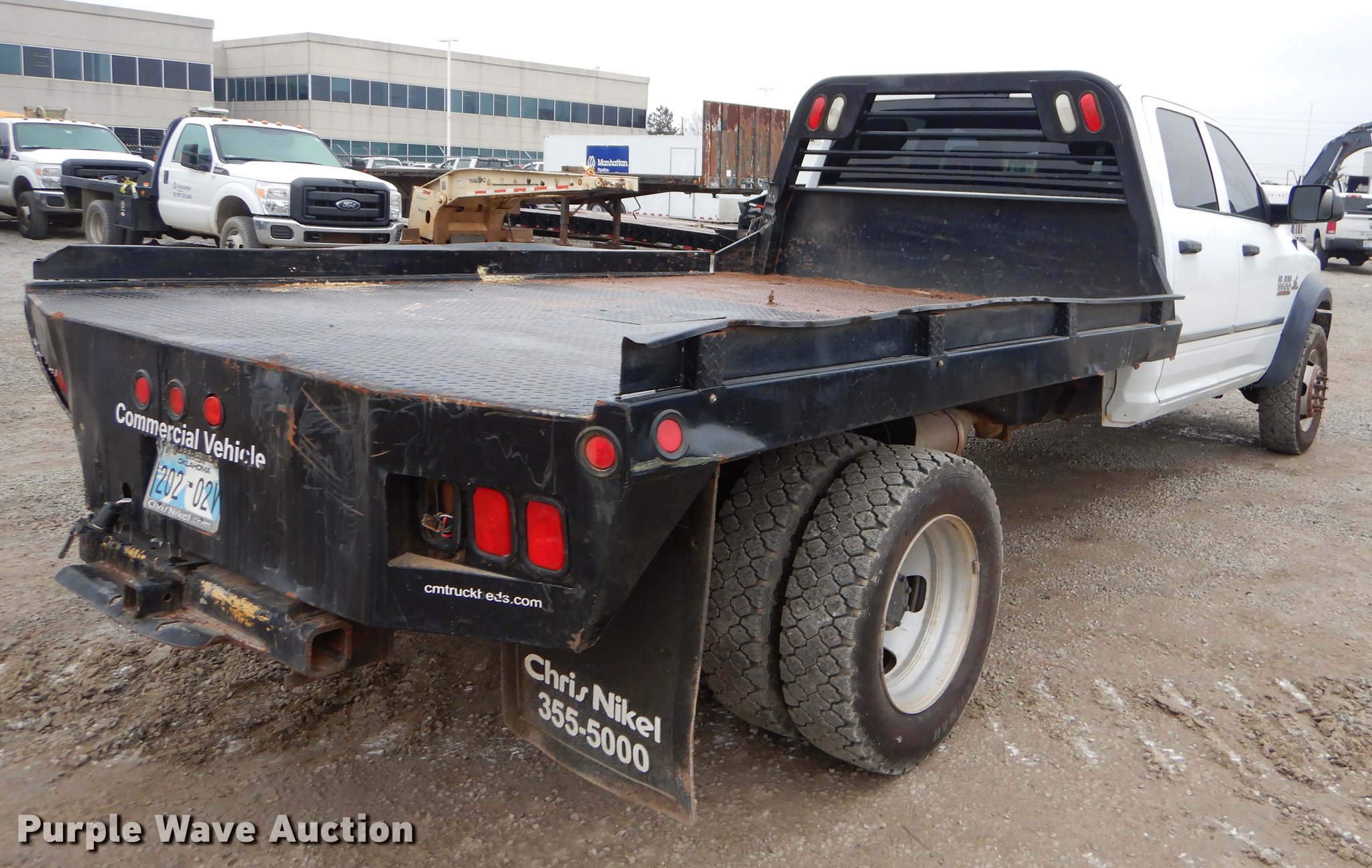 Purple Wave is selling a used Flat Bed Truck in Oklahoma. This item is a 2014 Dodge Ram 5500 Crew Cab flatbed truck with the following: 25,229 miles on odometer, 6.7L L6 OHV 24V turbo diesel engine, Automatic transmission, Four wheel drive, AC and heat, Cruise, Power windows and locks, 11'L x 96"W flatbed, Gooseneck ball, 245/70R19.5 tires
