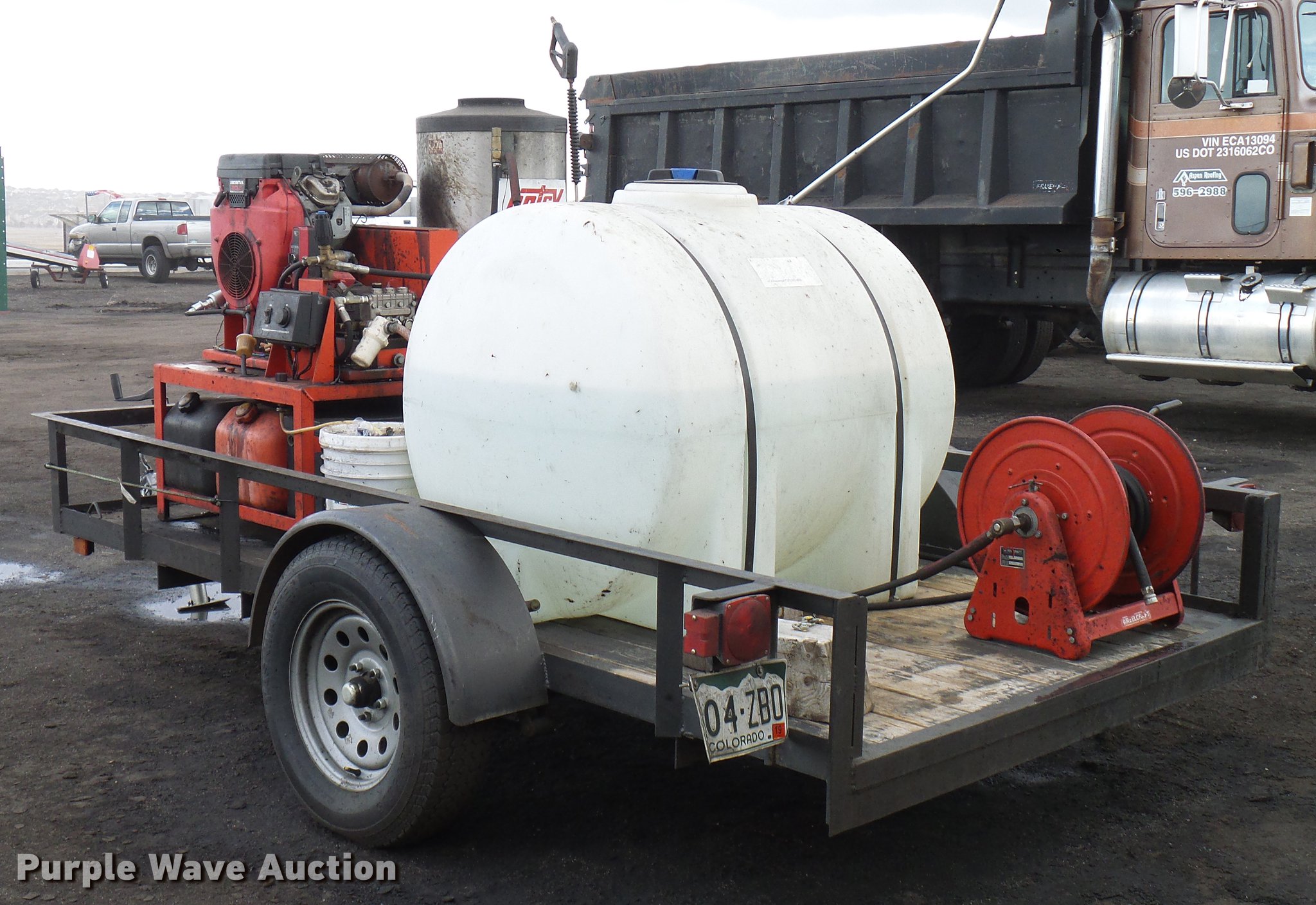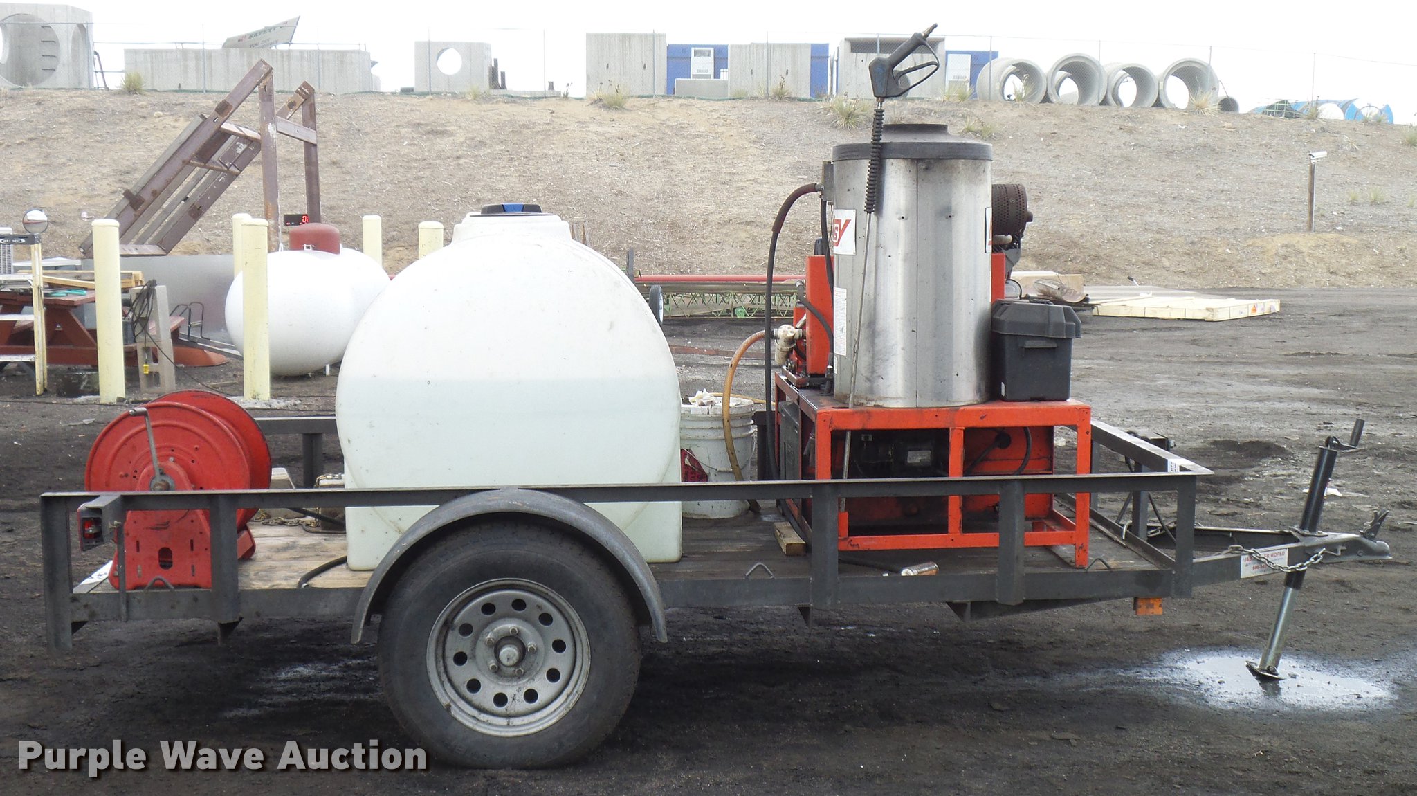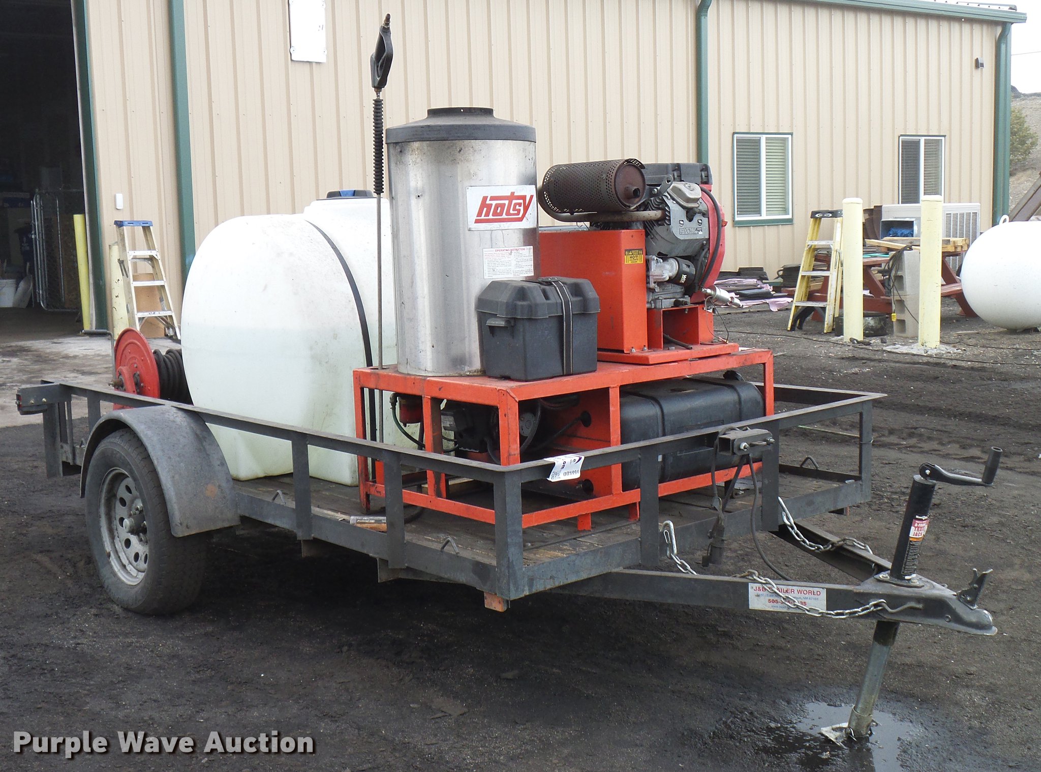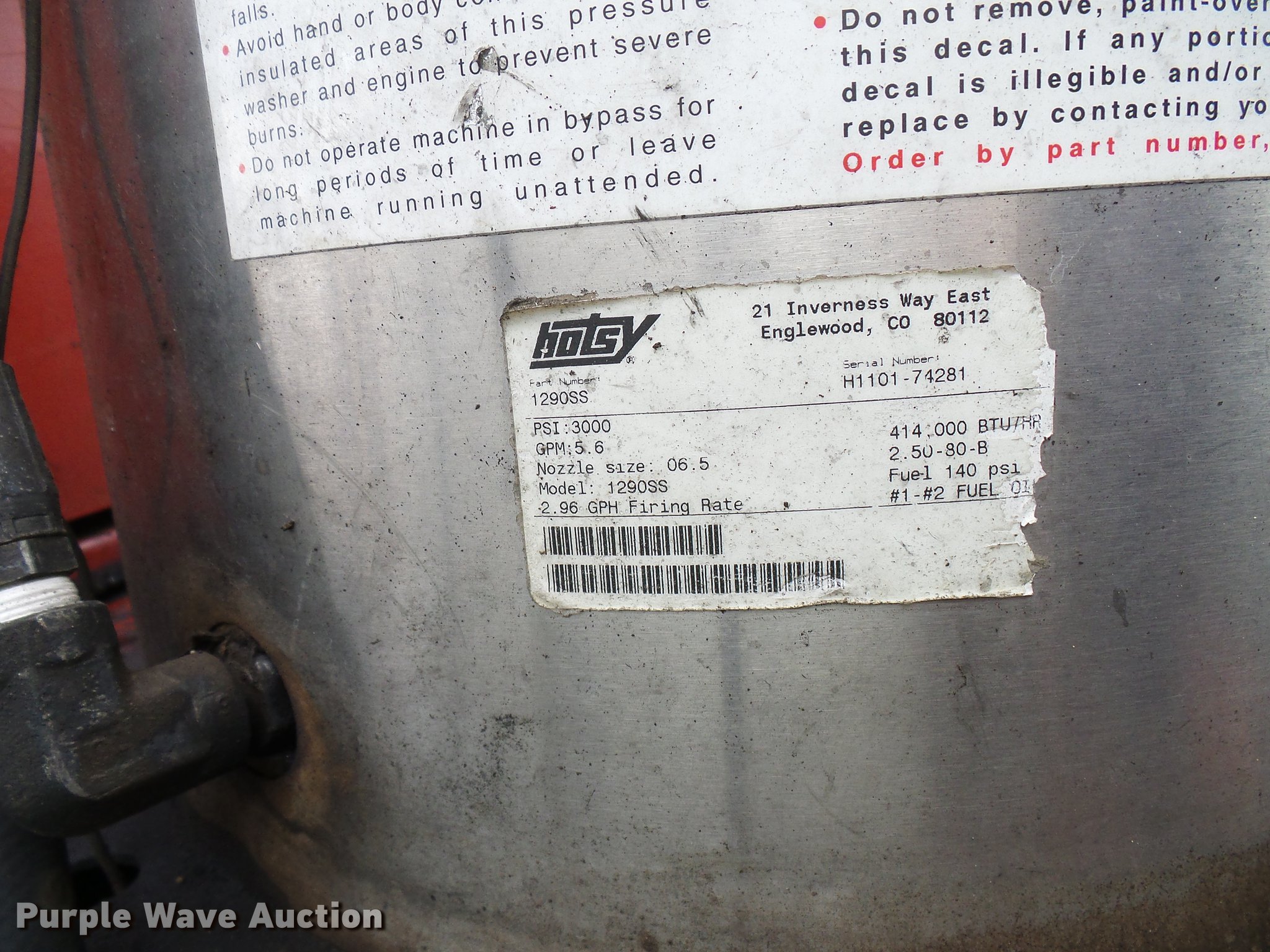 Purple Wave is selling a used Pressure Washer in Colorado. This item is a Hotsy 1280S pressure washer with trailer with the following: Honda GX620 two cylinder gas engine, 20 HP, 225 gallon poly tank, Hose reel, 75'L hose, 3,000 psi, 5.6 gallon per minute capacity, 414 BTU, No 2 fuel oil fired burner, Serial H1101-74281, 2013 JBTS 5X10SA utility trailer, 10'L x 5'W wood deck, 2" ball hitch, 205/75R15 tires, GVWR 2,895 lbs