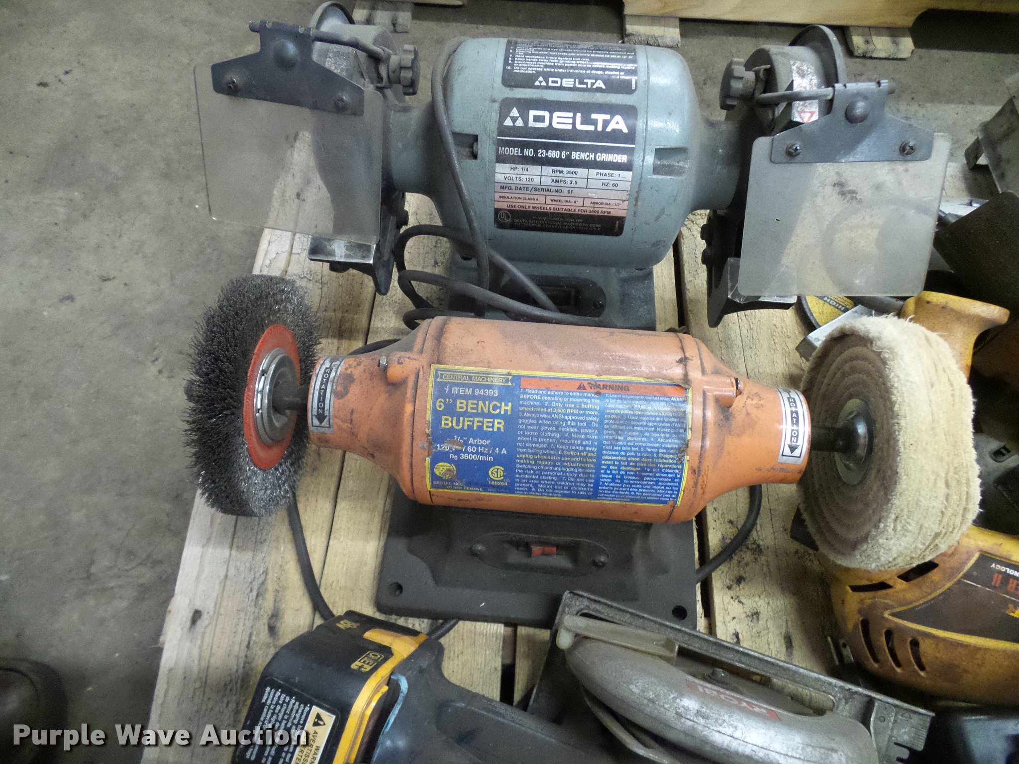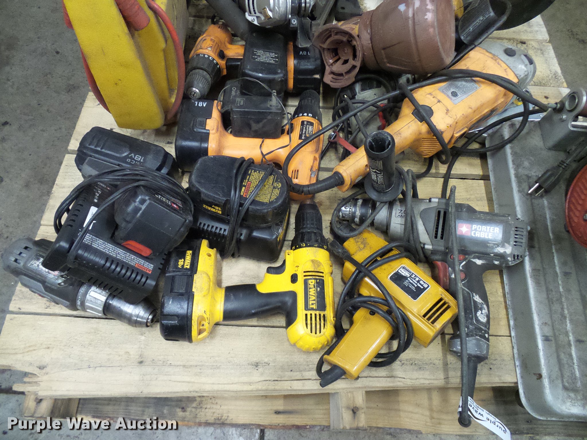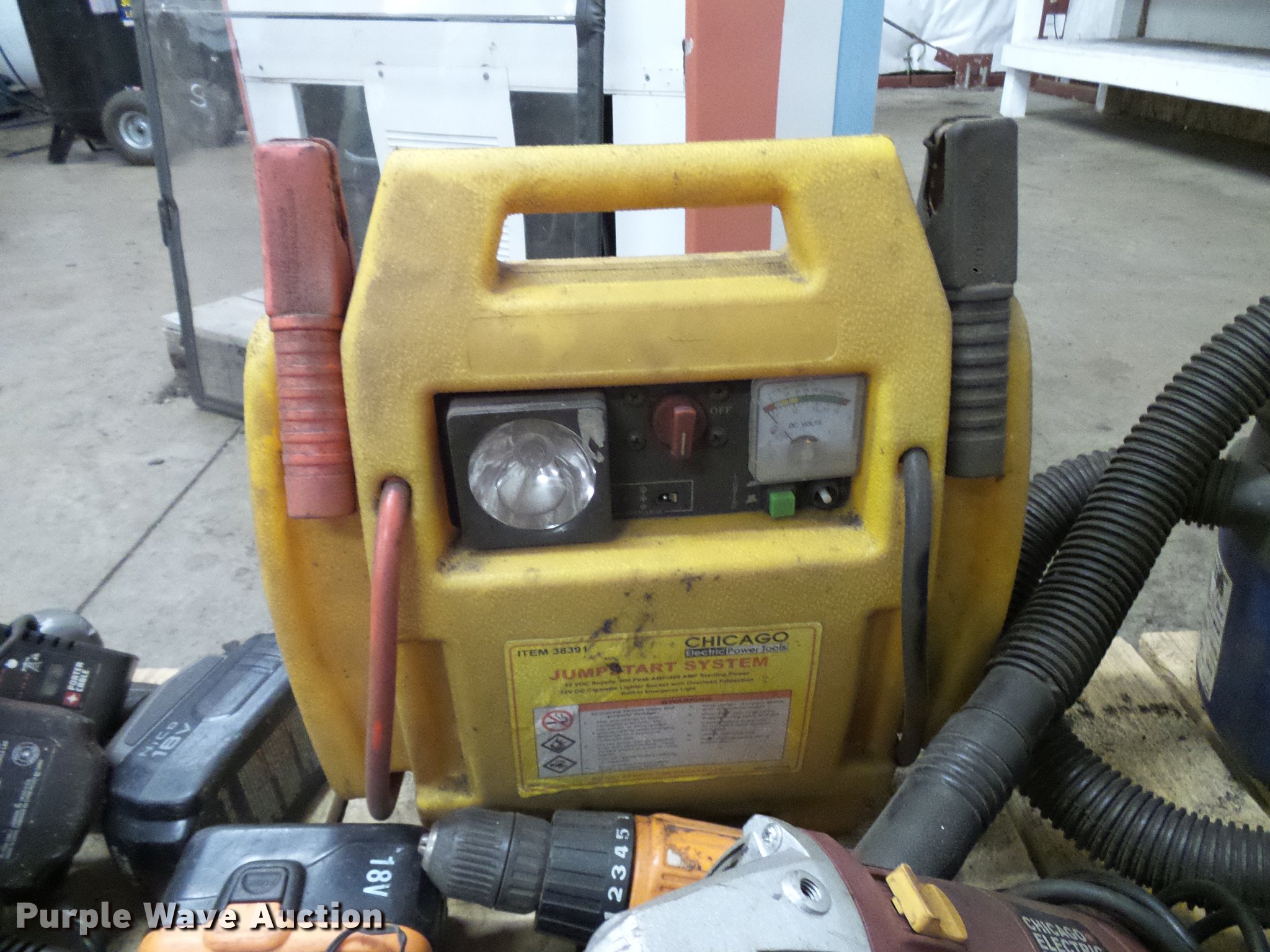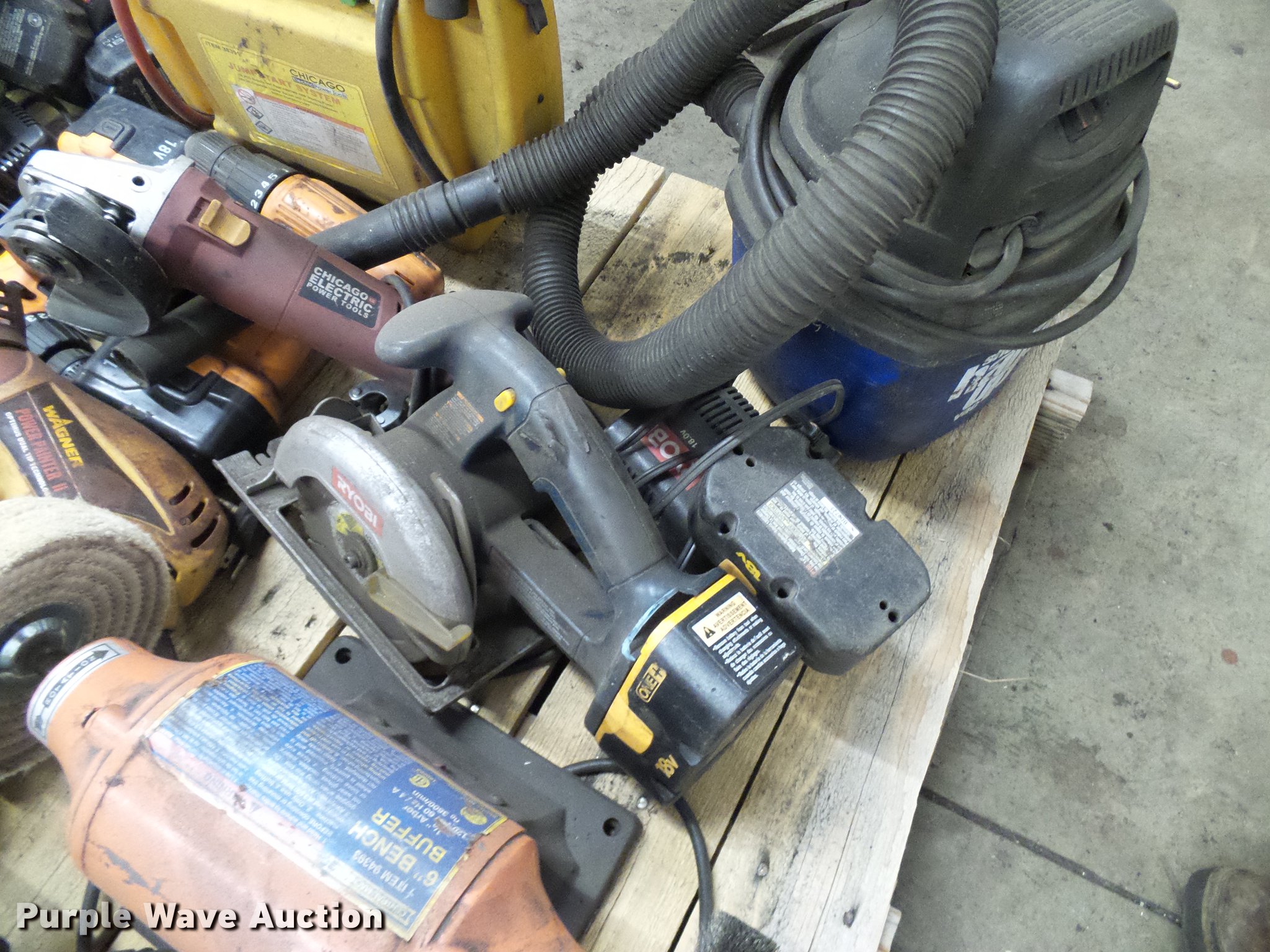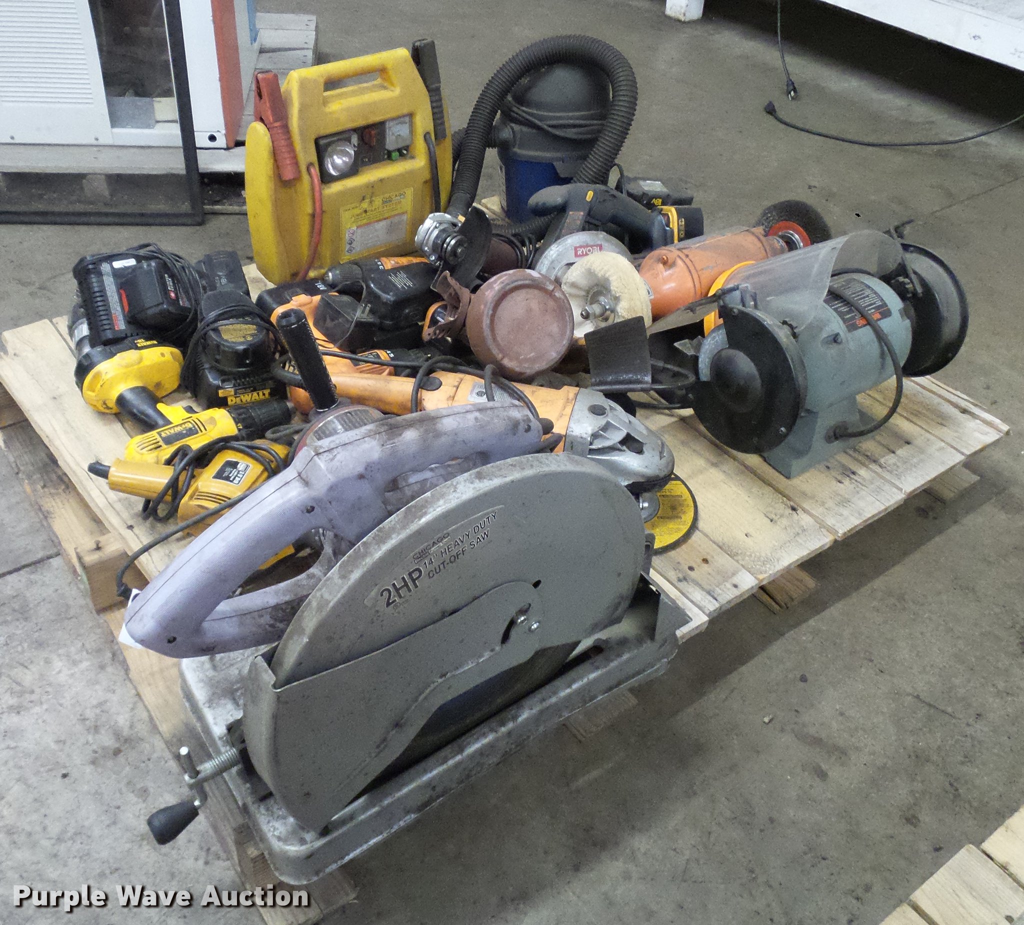 Purple Wave is selling a used Tools in Colorado. This item is a Tools with the following: (2) 18V drills, (2) Chicago angle grinders, Bench grinder, Circular saw, Chicago chop saw, Wet/dry vacuum, Battery booster and more