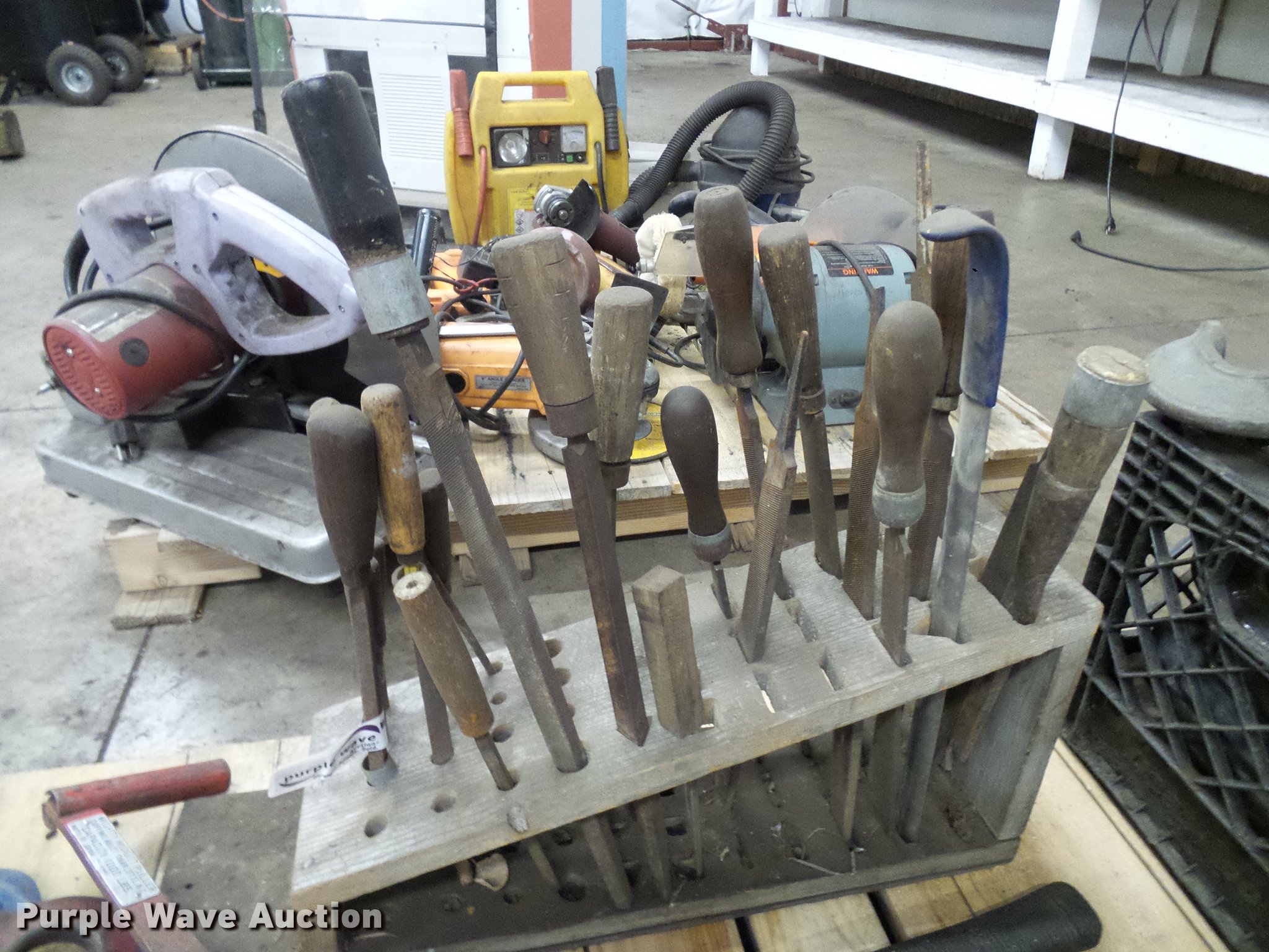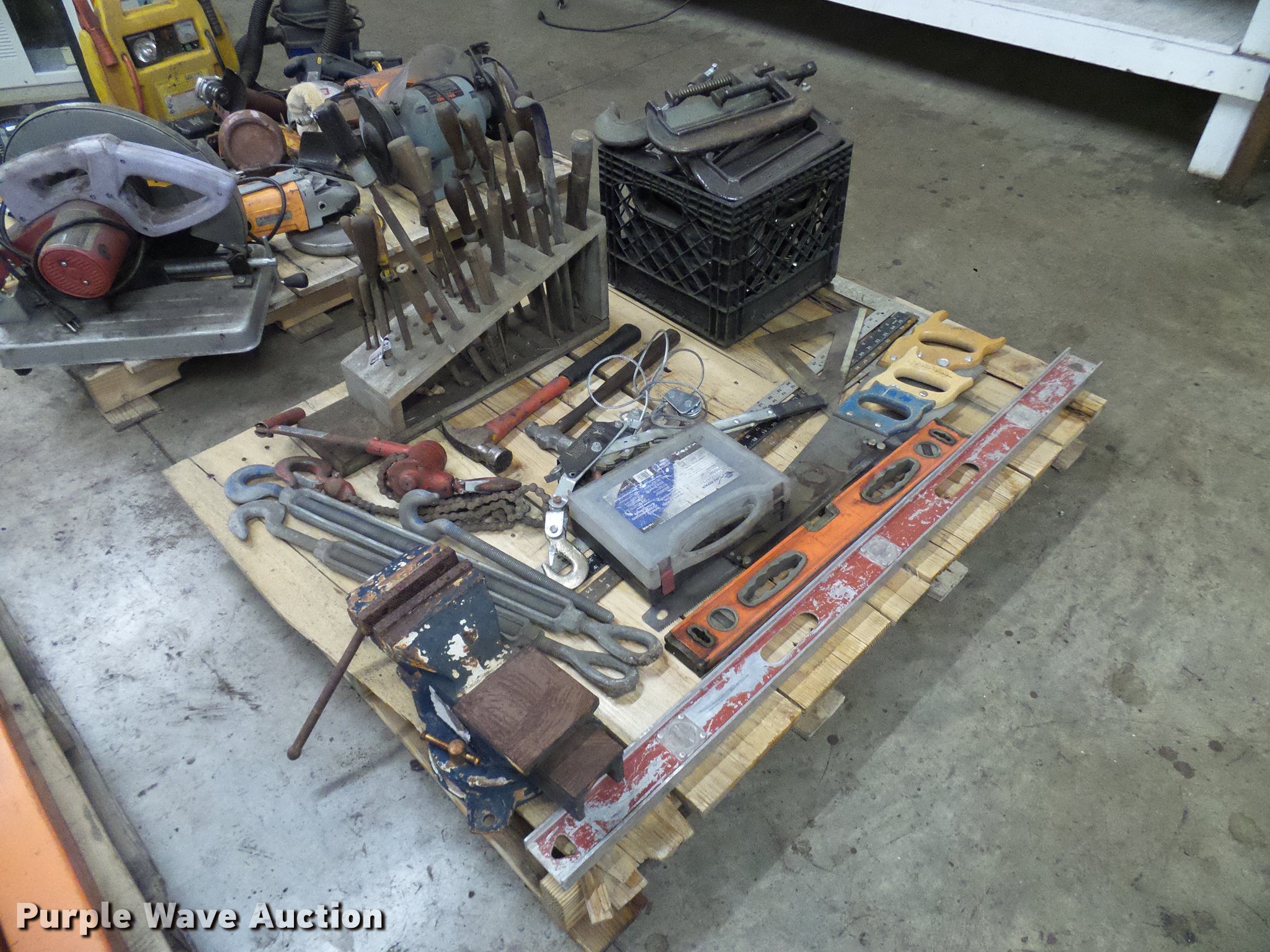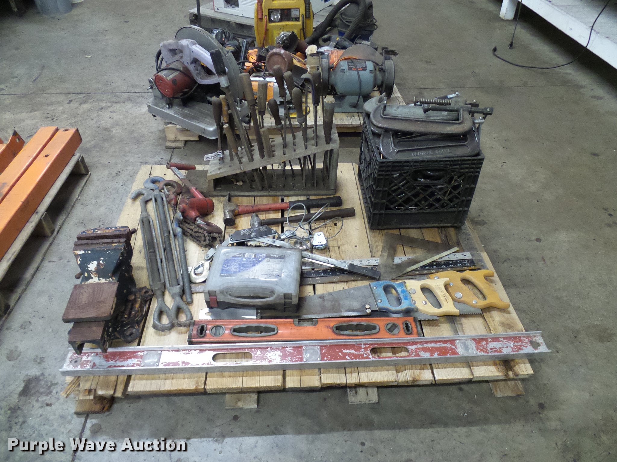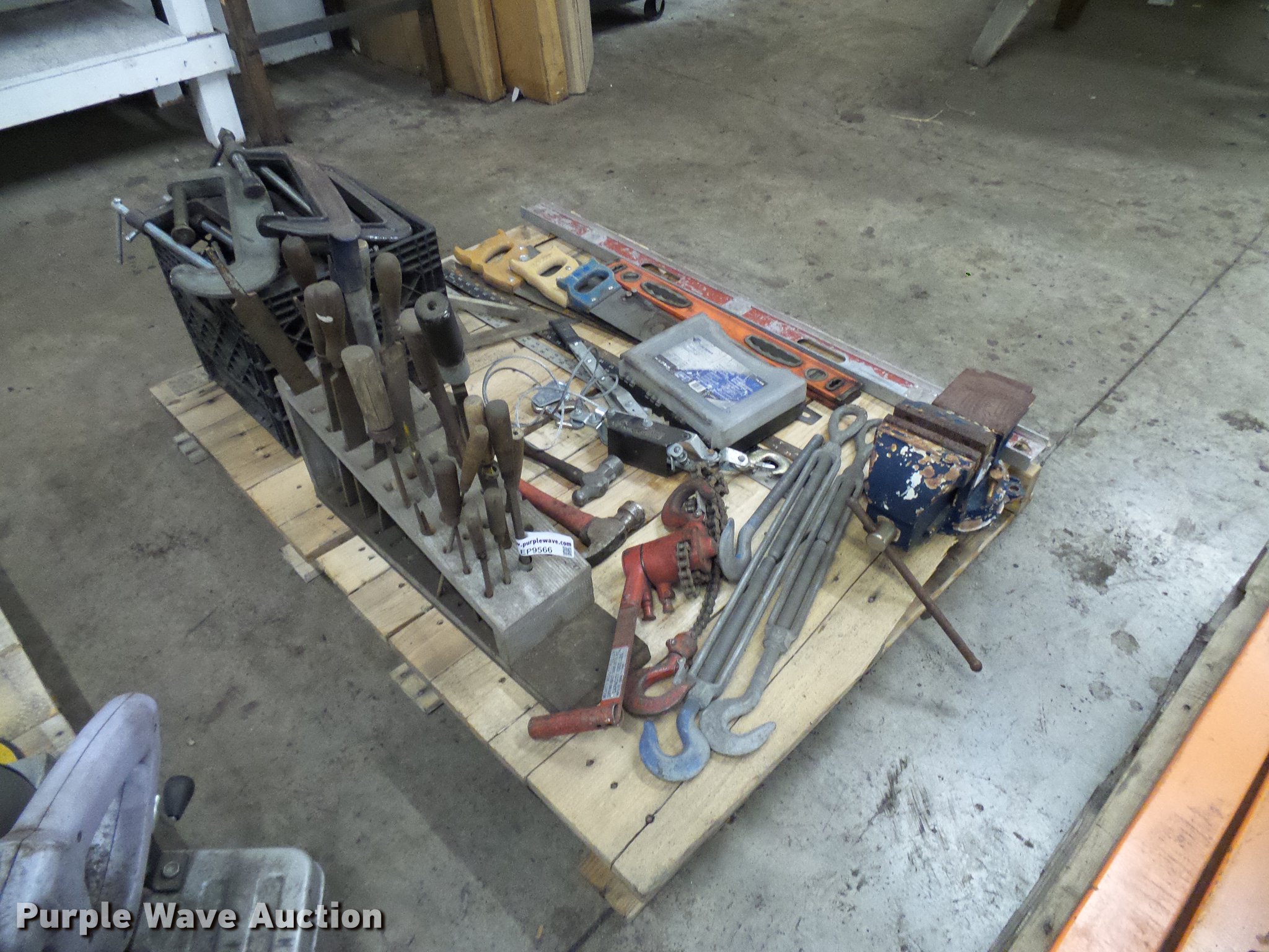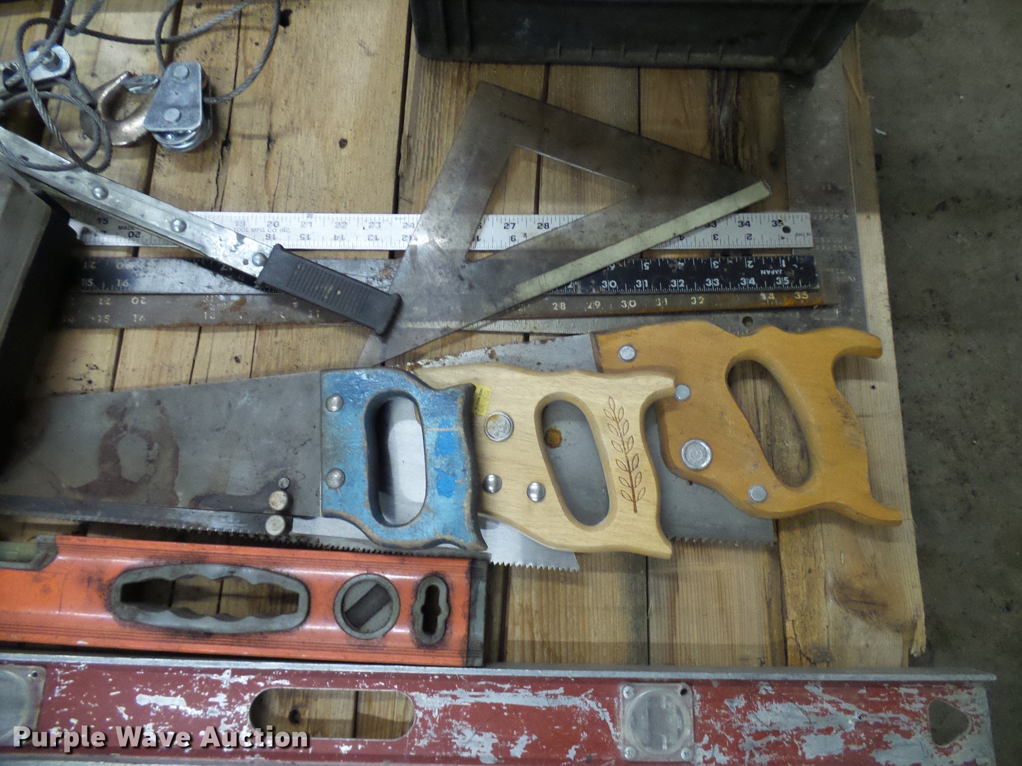 Purple Wave is selling a used Tools in Colorado. This item is a Tools with the following: (2) hammers, Winch, Cable stretcher, Wood chisels, (3) saws, 6" C clamps, 8" vice grip clamps, (2) levels and more