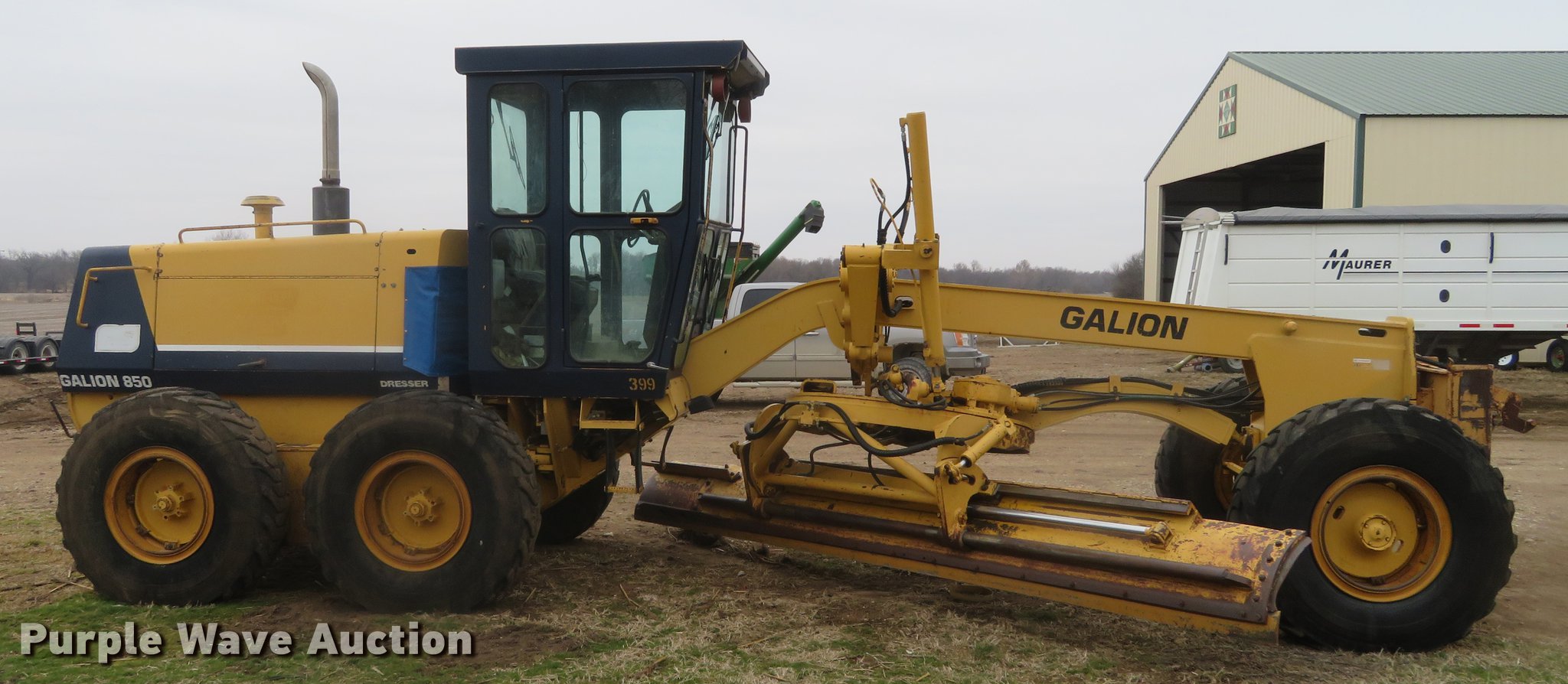 Purple Wave is selling a used Motor Grader in Kansas. This item is a 1995 Galion Dresser 850 motor grader with the following: 9,393 hours on meter, Six cylinder diesel engine, Powershift transmission, 6F-3R gears, EROPS, AC and heat, 16'W moldboard, Tip control, Side shift, 14.00R24 tires, Engine has been replaced, Serial G580010U281472