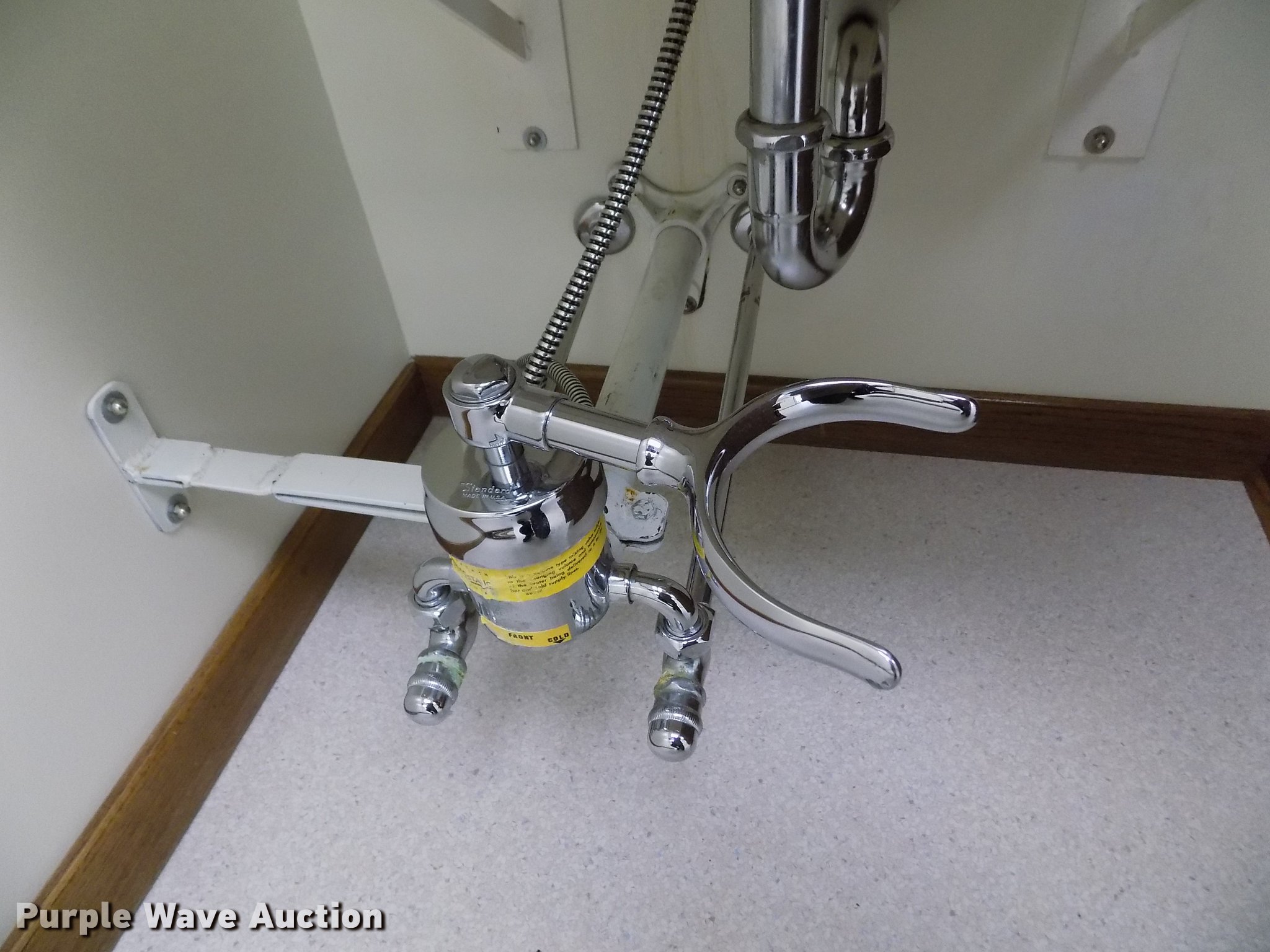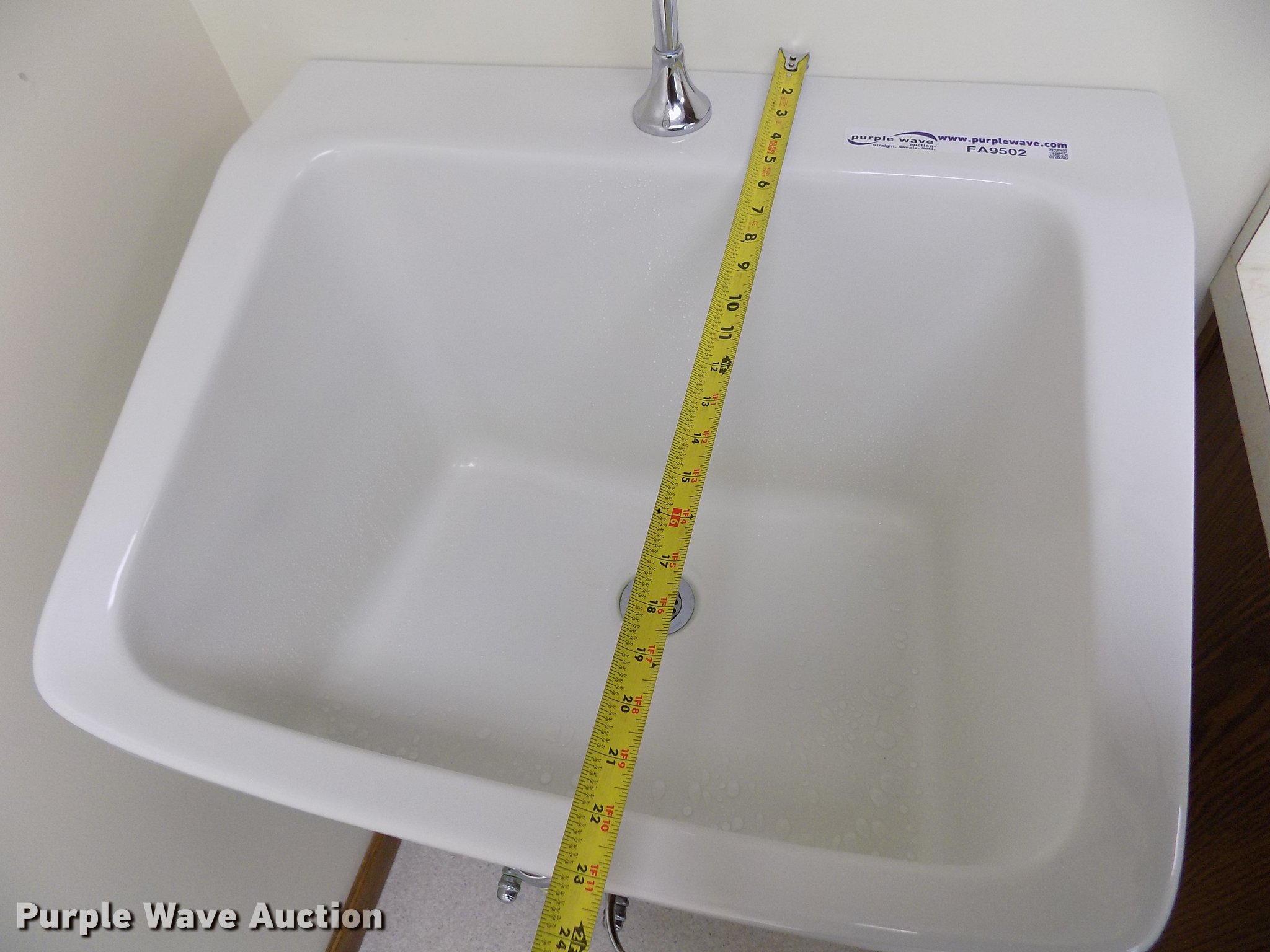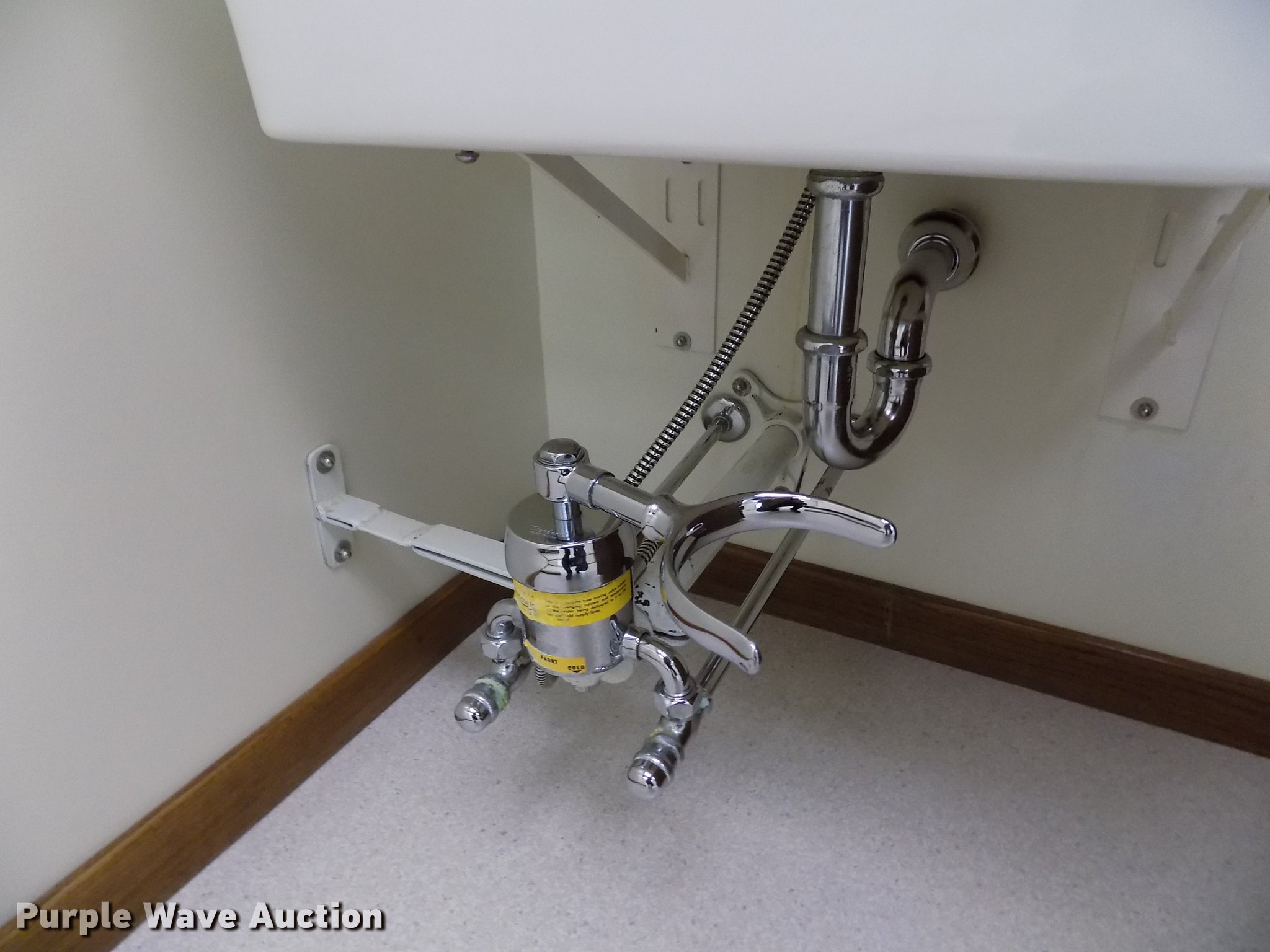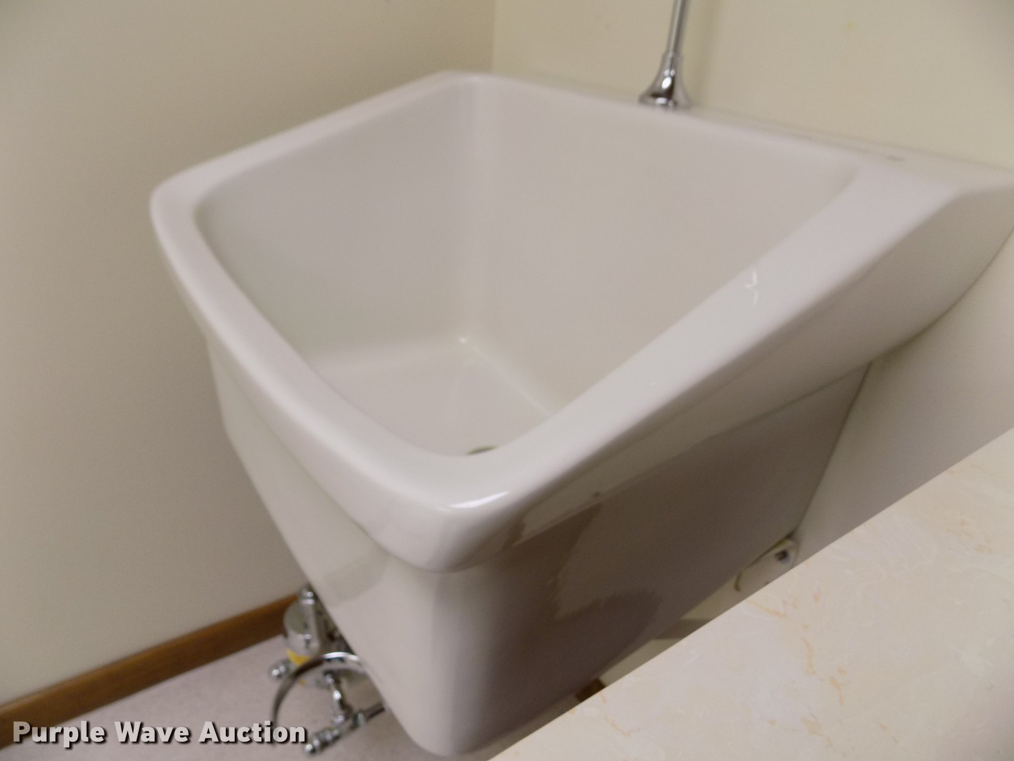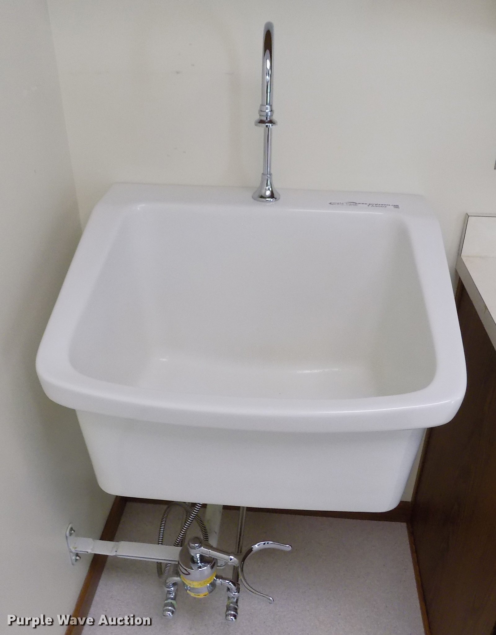 Purple Wave is selling a used Building Materials in Kansas. This item is a Wall mounted sink with the following: 28"L x 23"W x 12"D, Knee actuated water shut off, Brackets and plumbing