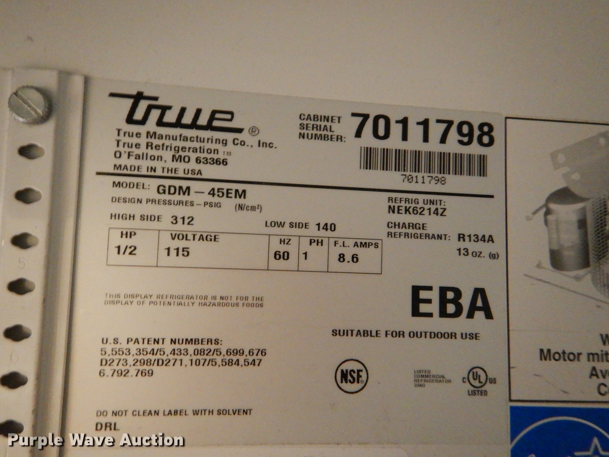 Purple Wave is selling a used Retail Displays in Kansas. This item is a Coca Cola True GDM-45EM double beverage cooler with the following: 51" x 29" x 83", Single phase, One door pulley needs to be replaced, Serial 7011798