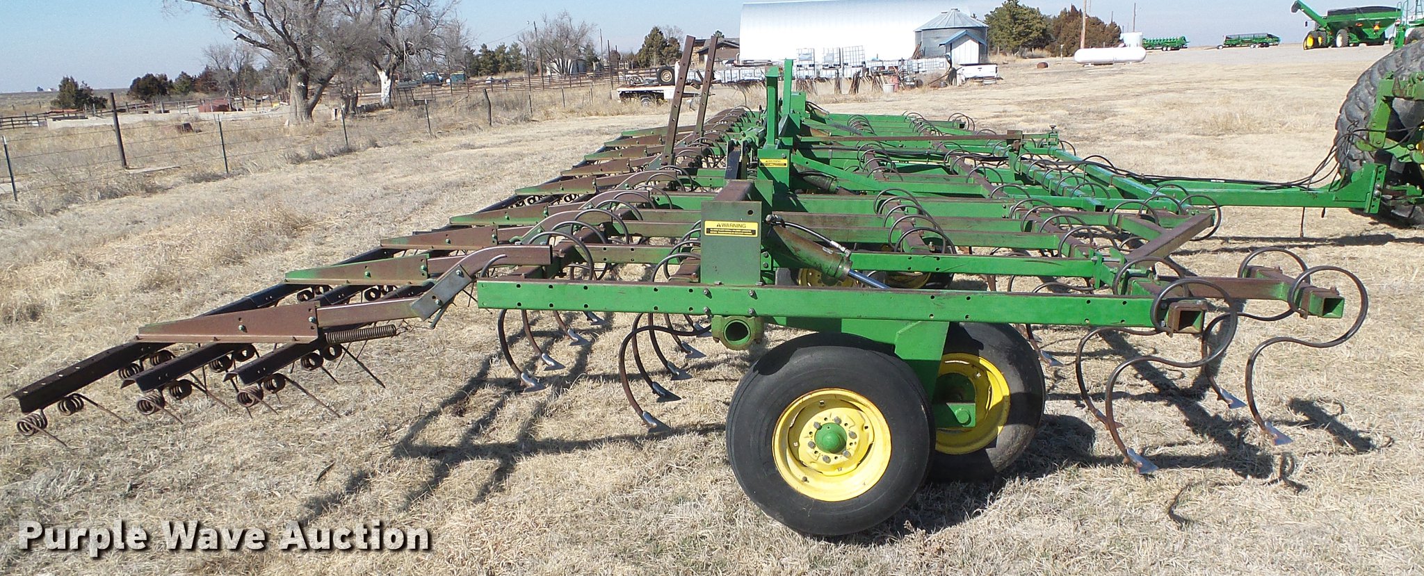 Purple Wave is selling a used Field Cultivator or Sweep Plow in Kansas. This item is a John Deere 960 field cultivator with the following: 36'W overall, 15' transport width, 6"W sweeps, 9" spacing, Three bar tine harrow, Manual leveler, Hydraulic lift and fold, Slab hitch, Walking tandem axle, 9.5L-15 tires, Serial N00960X007114