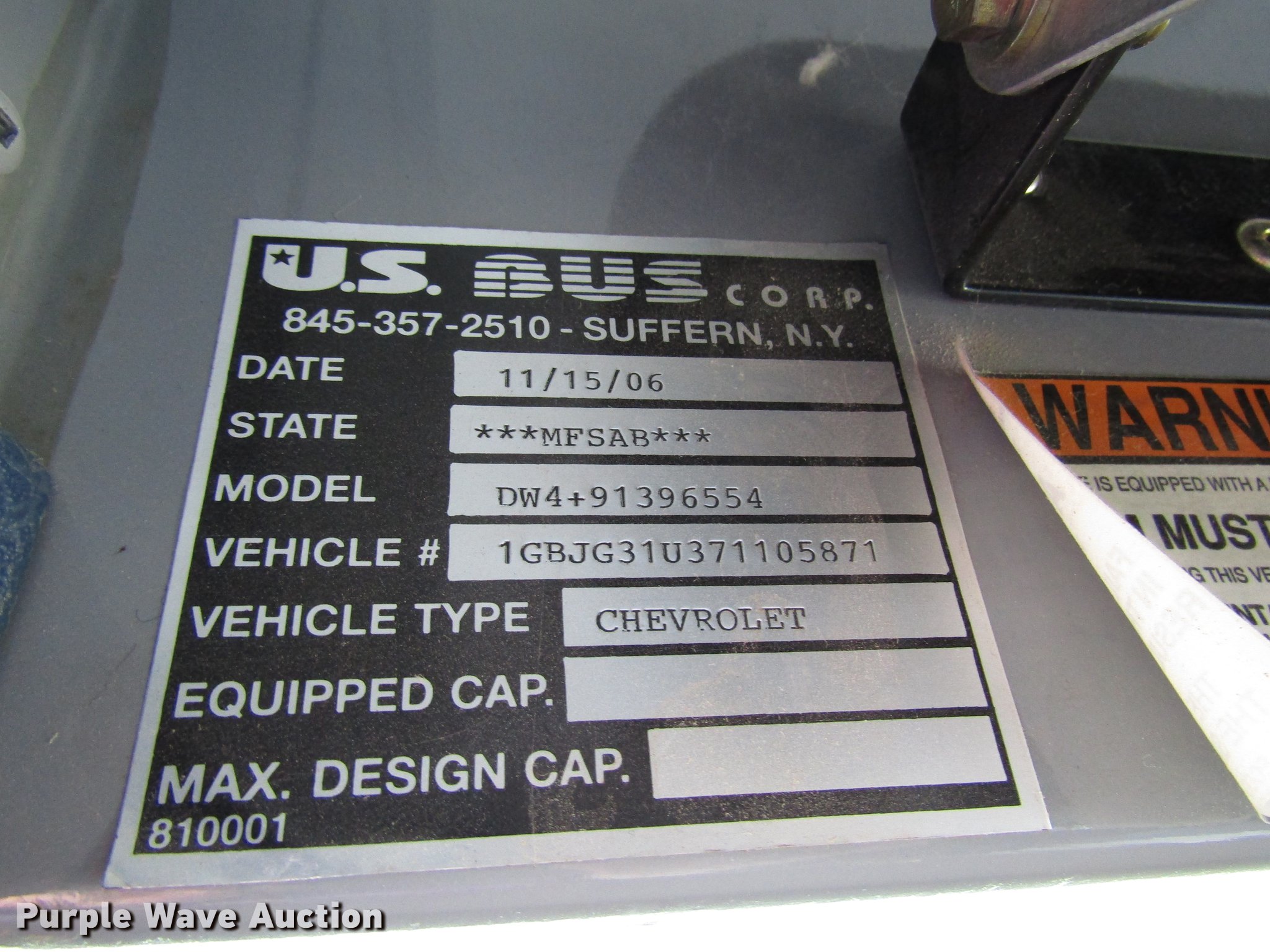 Purple Wave is selling a used Bus in Kansas. This item is a 2007 Chevrolet Express 3500 Cargo school bus with the following: 110,576 miles on odometer, 6.0L V8 OHV 16V gas engine, Automatic transmission, Single axle, AC and heat, Brake controls, 14 passenger capacity, (14) child safety seats, Seat belts, Ceiling, rear, and side emergency exits, Backup alarm, Spring suspension, Hydraulic brakes, 142" wheelbase, 225/75R16 tires, GVWR 12,300 lbs, Unit# 3