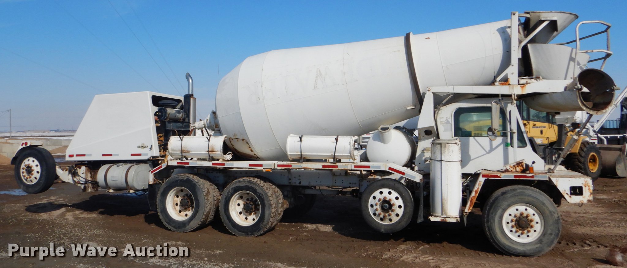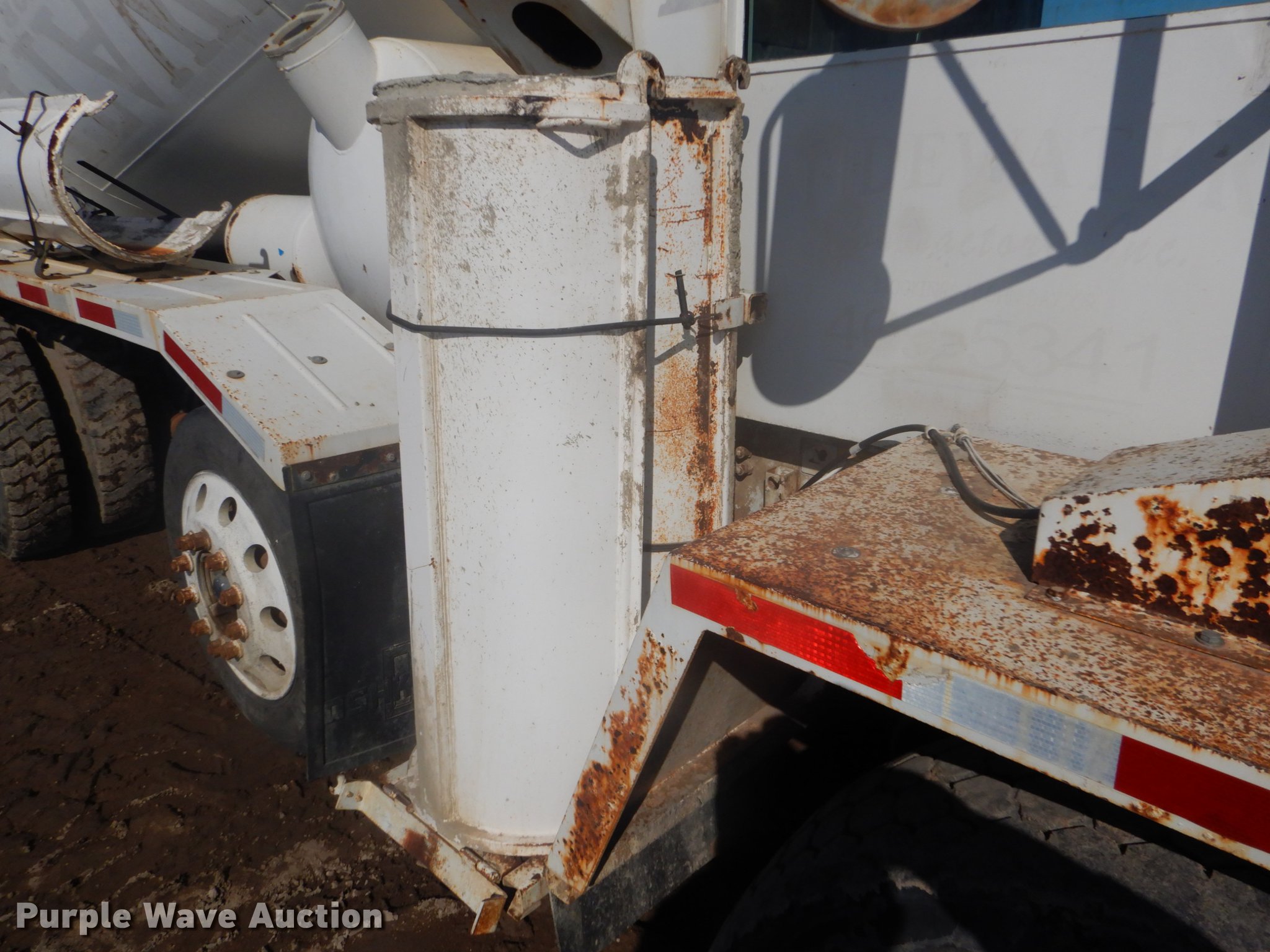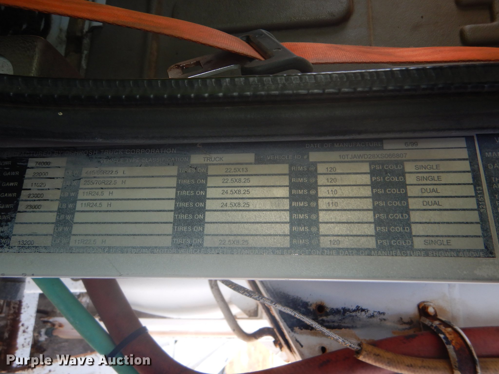 1999 Oshkosh S2346 ready mix truck. 156,601 miles on odometer, 13,562 hours on meter, Caterpillar C12 12.0L L6 turbo diesel engine 355 HP , Serial 2KS10104, Eaton Fuller nine speed manual transmission, Six wheel drive, Inter-axle differential lock, Tandem axle Pusher tag axle, Suspension seat, Drum/axle controls, PTO, 11 cu.yd. mixer capacity, (4) steel chute extensions, 100 gallon water tank, Front discharge, Single fuel tank, Front pin hitch, Walking beam suspension, Air brakes, 425/65R22.5 front tires, 255/70R22.5 pusher axle tires, 11R22.5 tag axle tires, 11R24.5 rear tires, GVWR 74,000 lbs, FAWR 22,000 lbs, IAWR 23,000 lbs, Pusher axle GAWR 11,020 lbs, Tag axle GAWR 13,200 lbs, RAWR 23,000 lbs. Kansas title. 10TJAWD28XS066807. Dunlap Construction Co Inc.. 2227 W Mary. Garden City, KS 67846