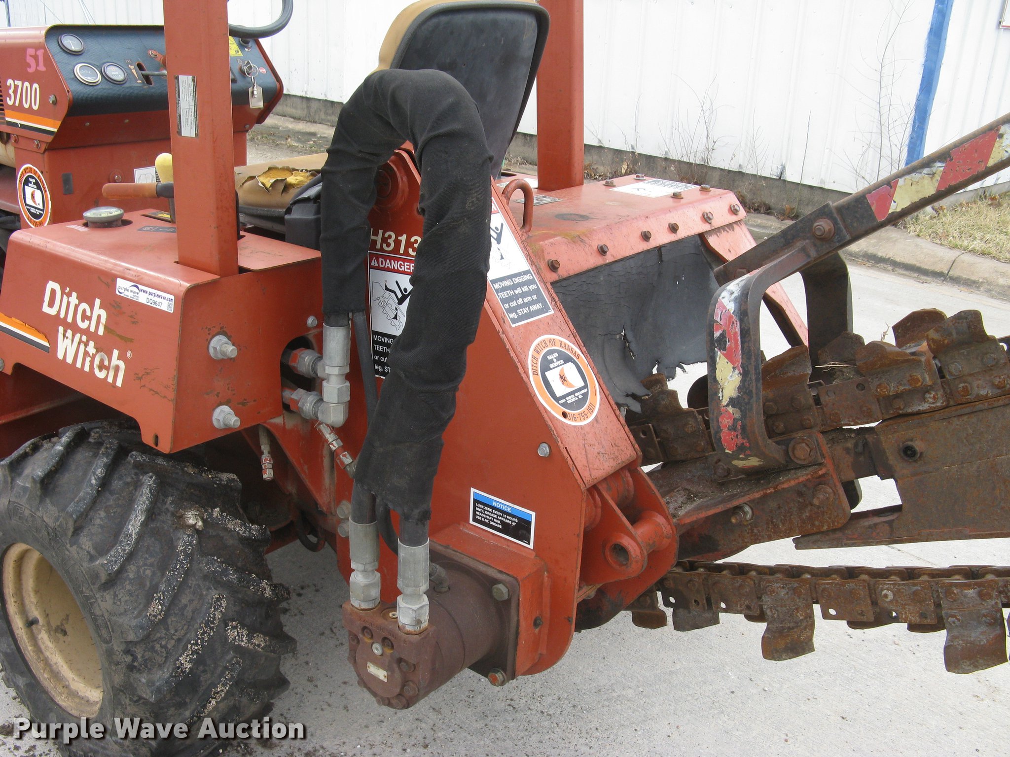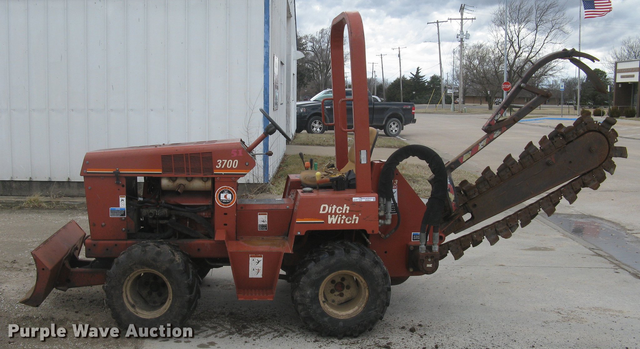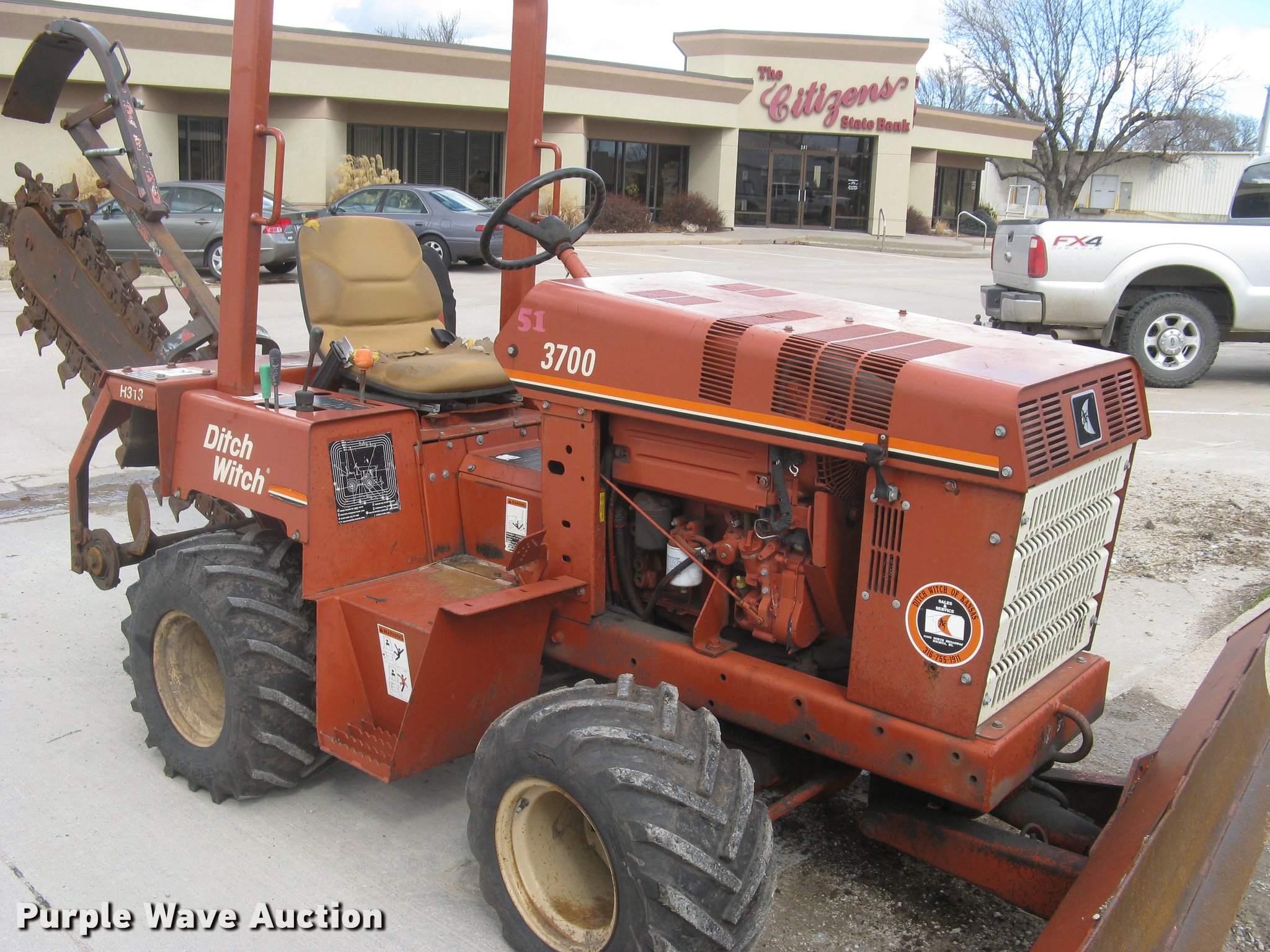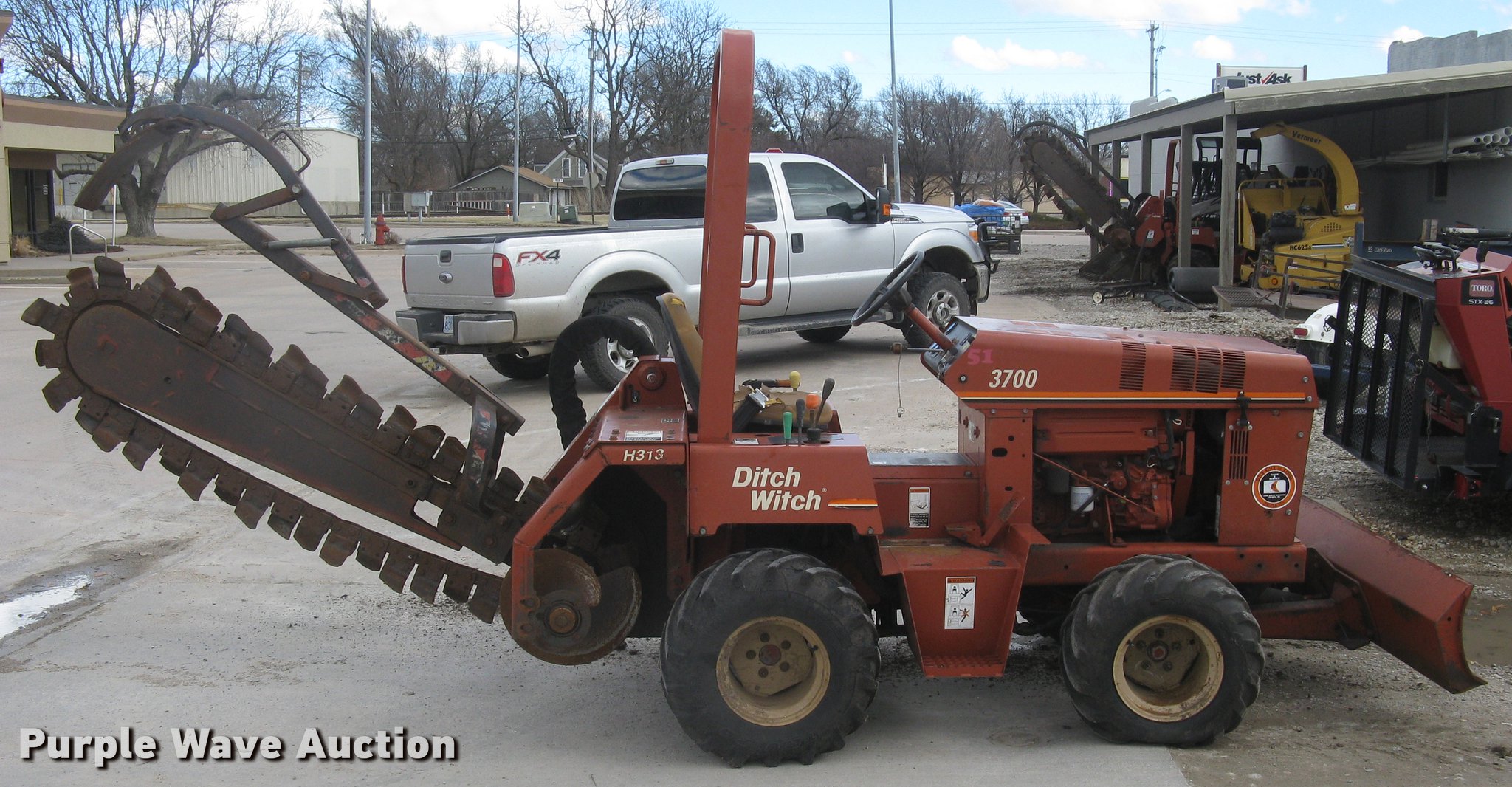 Purple Wave is selling a used Trencher or Rock Saw in Kansas. This item is a 2001 Ditch Witch 3700DD trencher with the following: 1,901 hours on meter, Deutz three cylinder diesel engine, Hydrostatic transmission, Two post ROPS, Trencher model H313, 84" boom length, 8" cutting width, Dirt teeth, Manual crumber arch, Serial 8V0013, 64"W four-way backfill blade, 26 x 12.00-12 NHS tires, Serial 3V0004