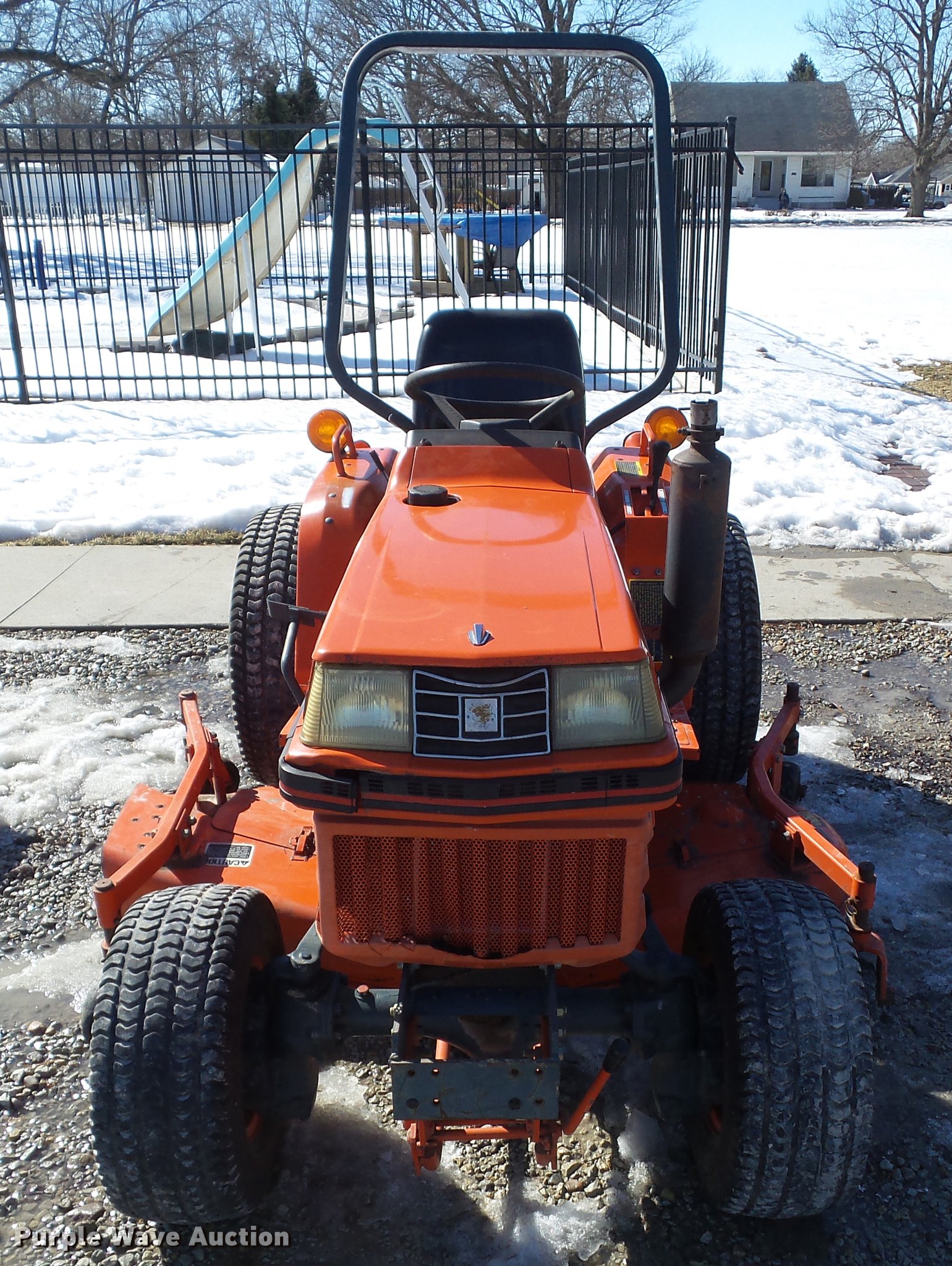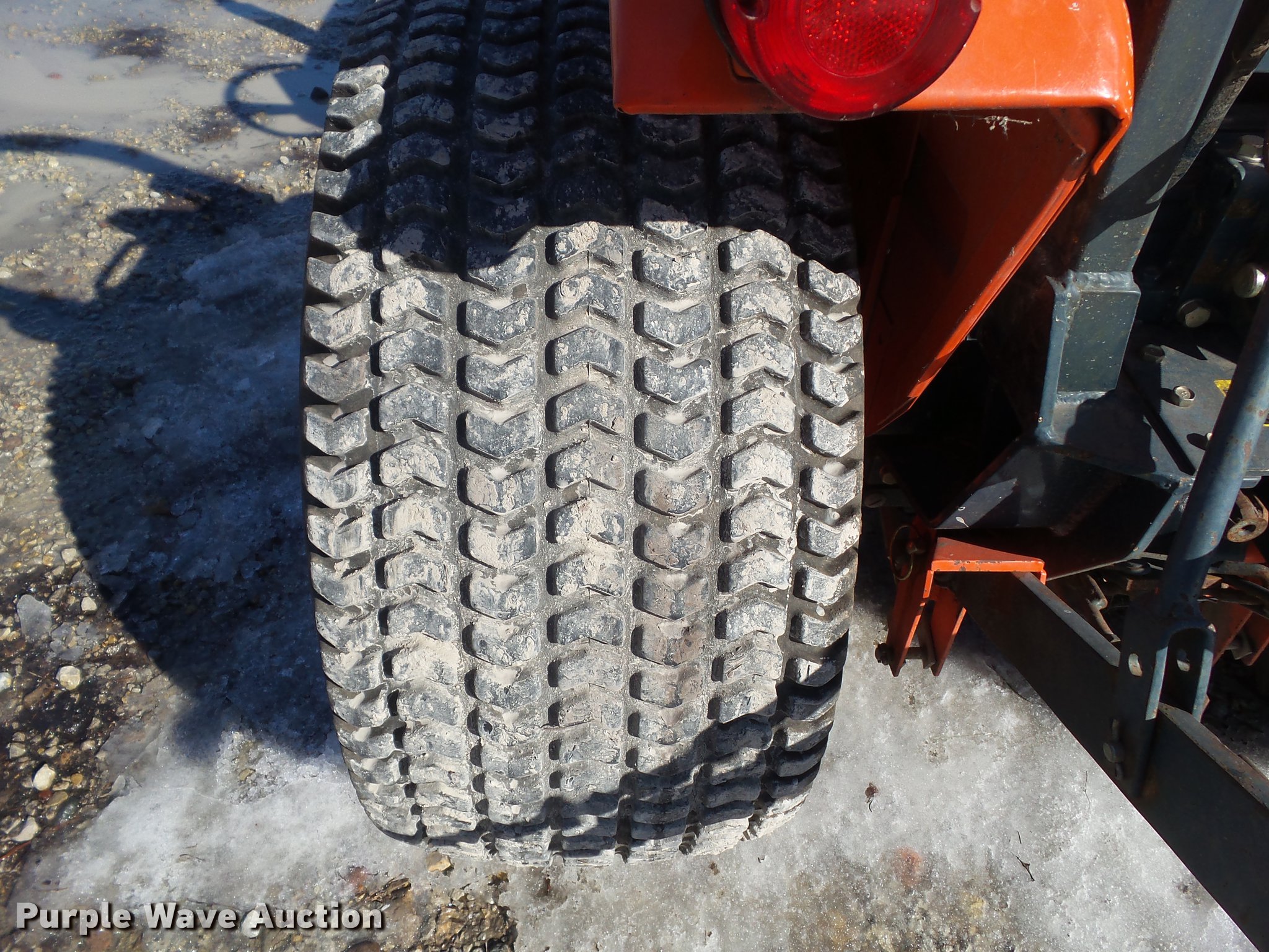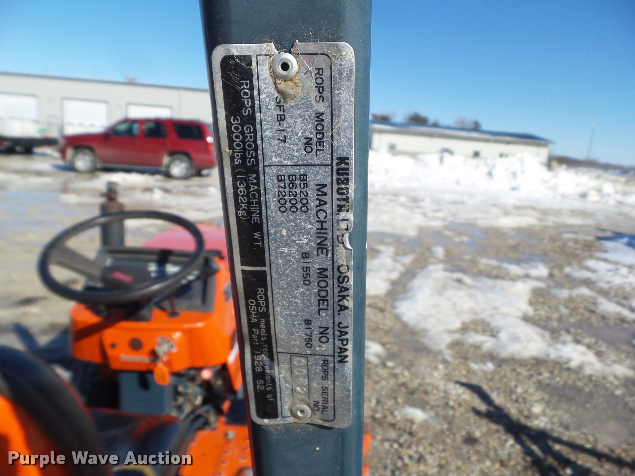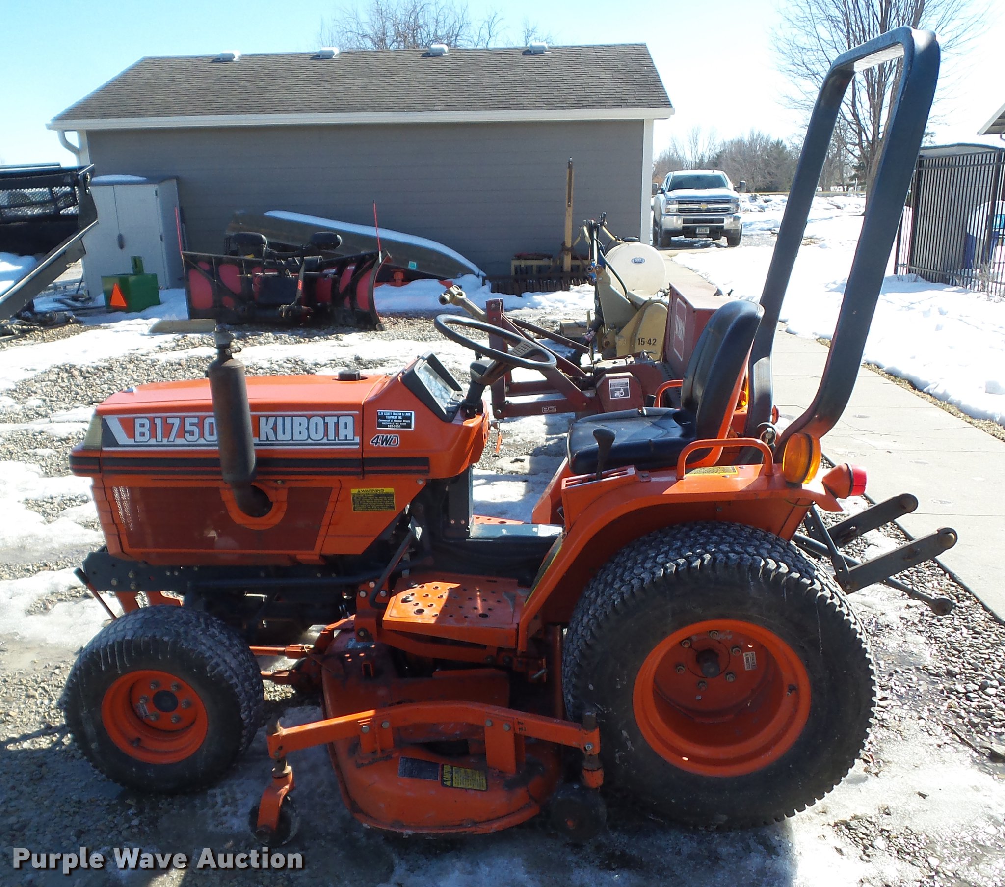 Purple Wave is selling a used Tractor in Iowa. This item is a Kubota B1750 MFWD tractor with the following: 1,566 hours on meter, Kubota D950-5B three cylinder diesel engine, Manual transmission, 6F-2R gears, Spring suspension seat, Three point, Top link, 540 PTO, Kubota RC60-B mowing deck, 60"W, Serial 11052, 20.5-8.00-10 front tires, 31 x 13.5-15 rear tires, Serial B1750D50361