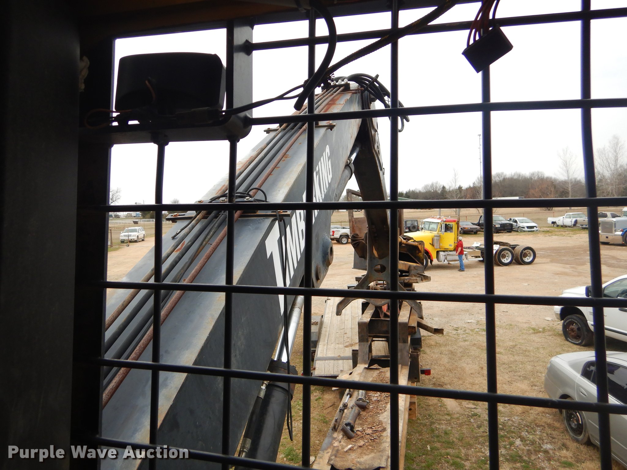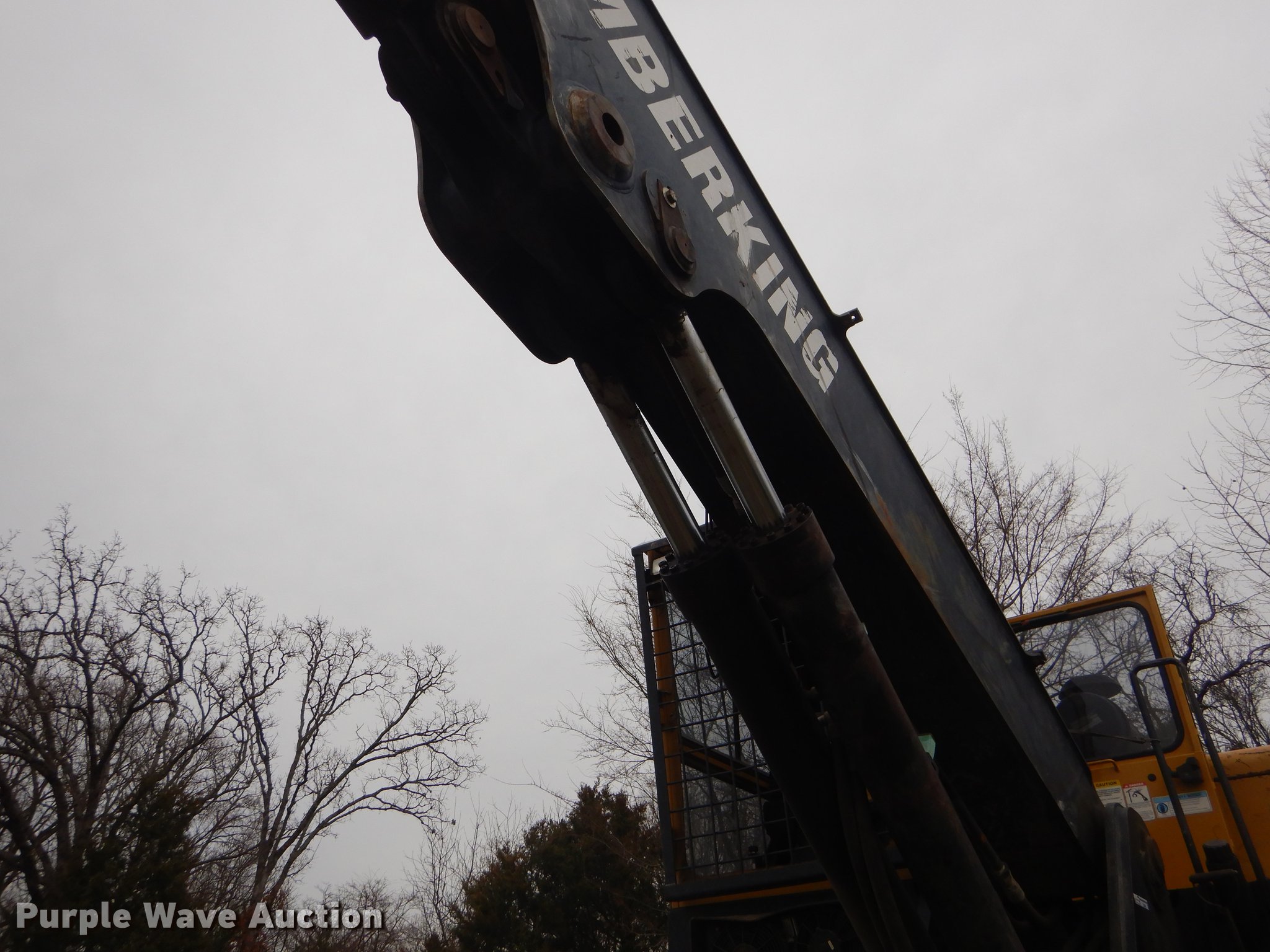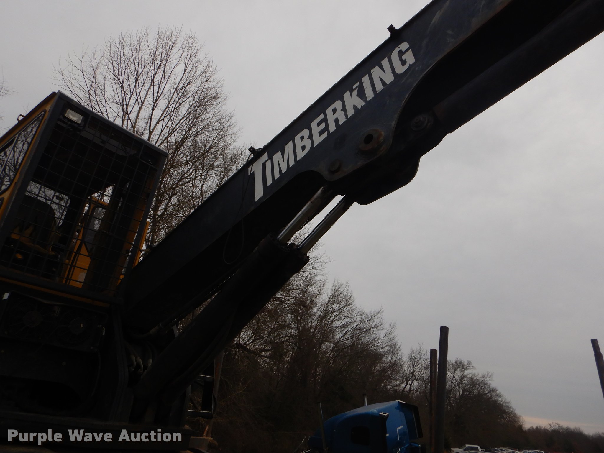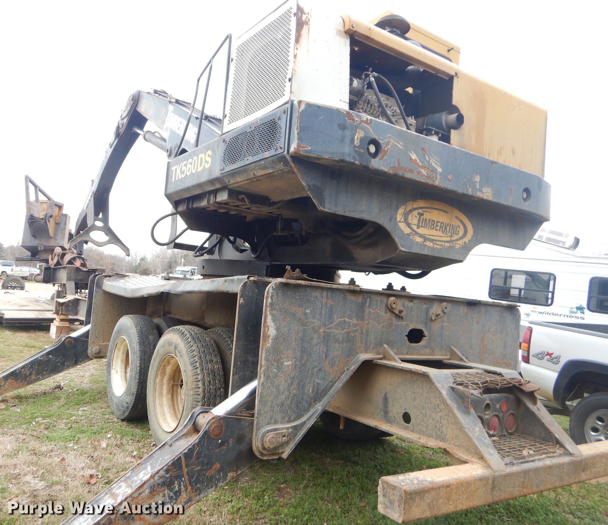 Purple Wave is selling a used Log Loader in Oklahoma. This item is a Timber King TK560DS log loader with the following: 51'L x 96"W, Caterpillar six cylinder turbo diesel engine, 12,449 hours on meter, ROPS, Suspension seat, Joystick control, Wipers, Front work lights, Prentice 32" grapple, On-board fuel cell, Delimber, (4) outriggers, Fifth wheel plate, Rigid suspension, Air brakes, Tandem axle, Steel wheels, 295/75R22.5 tires, Delimber bar and blade missing, Grapple unattached, Cylinders and grapple need rebuilt