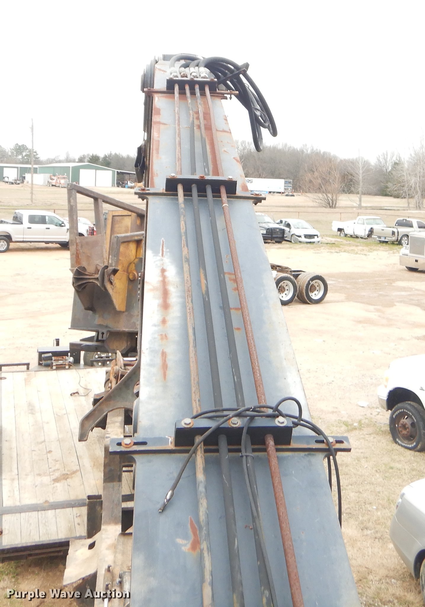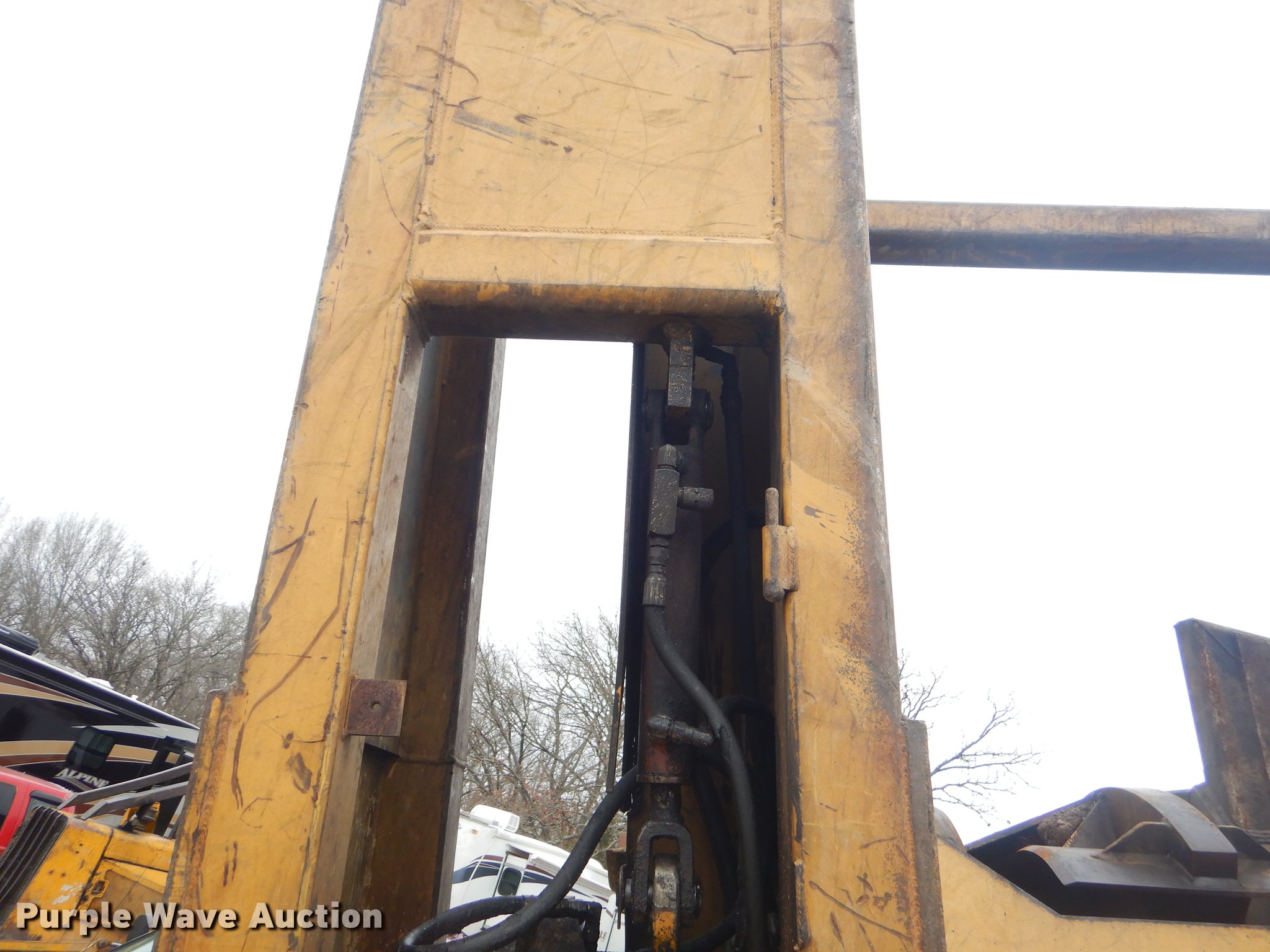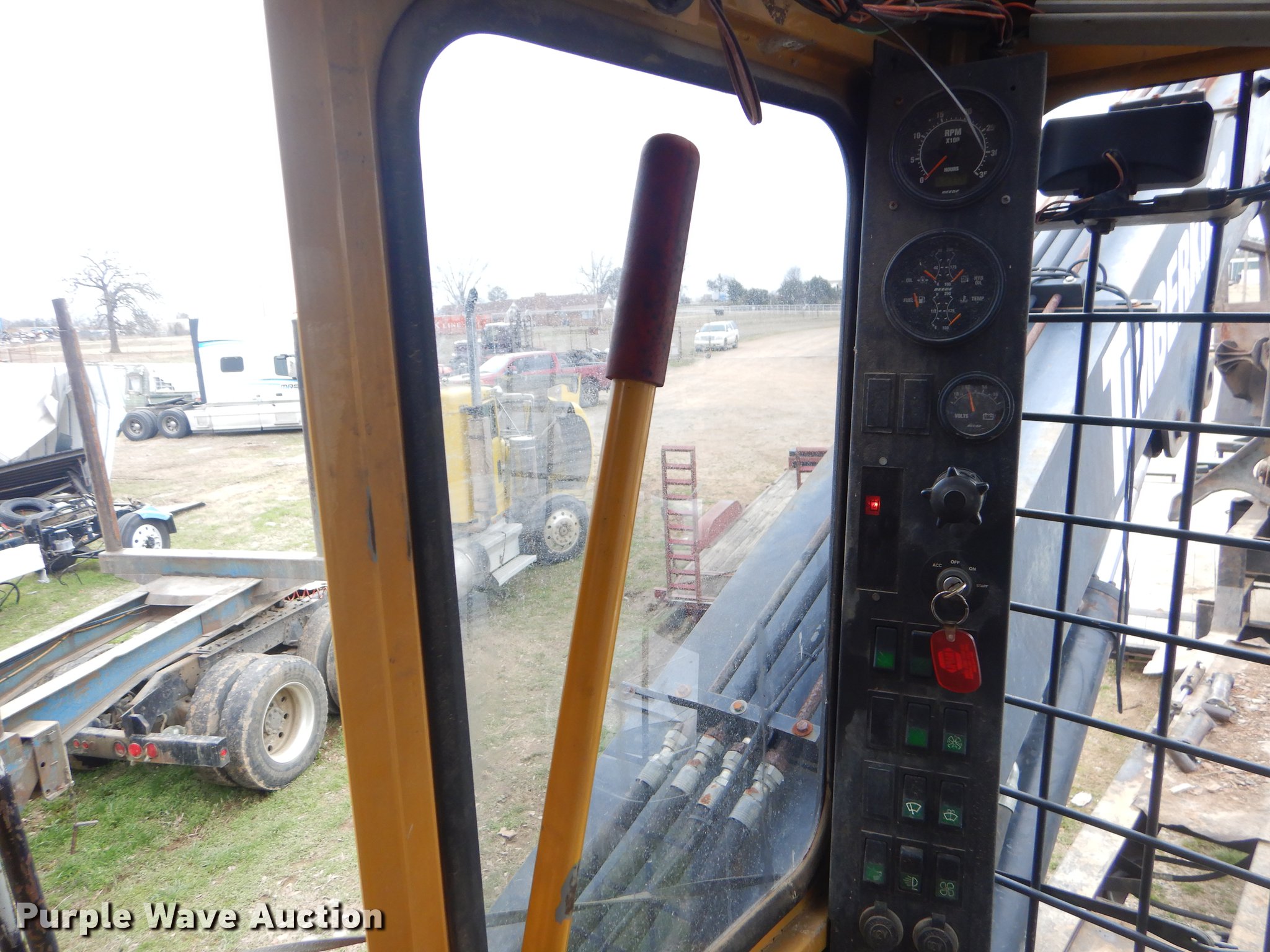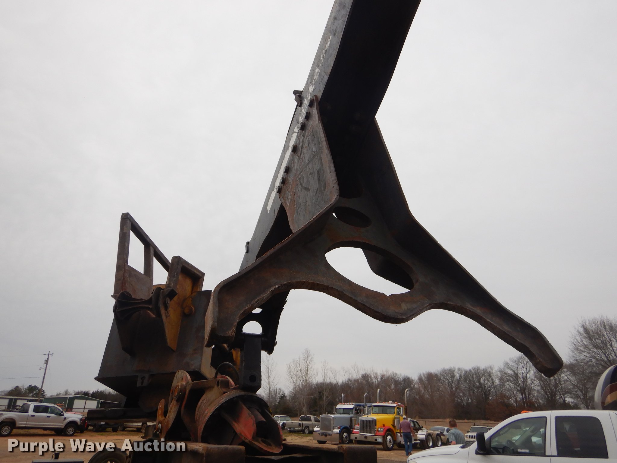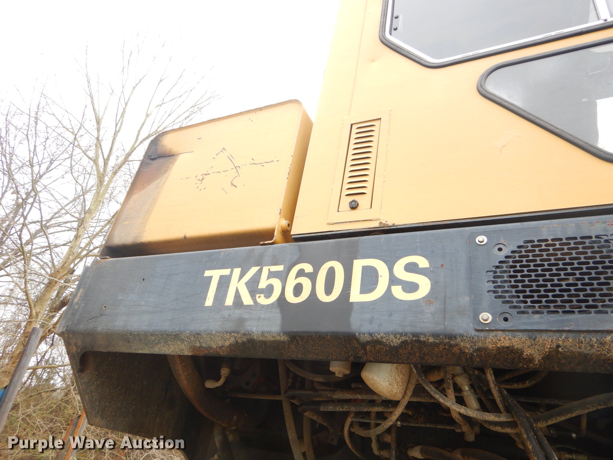 Purple Wave is selling a used Log Loader in Oklahoma. This item is a Timber King TK560DS log loader with the following: 51'L x 96"W, Caterpillar six cylinder turbo diesel engine, 12,449 hours on meter, ROPS, Suspension seat, Joystick control, Wipers, Front work lights, Prentice 32" grapple, On-board fuel cell, Delimber, (4) outriggers, Fifth wheel plate, Rigid suspension, Air brakes, Tandem axle, Steel wheels, 295/75R22.5 tires, Delimber bar and blade missing, Grapple unattached, Cylinders and grapple need rebuilt