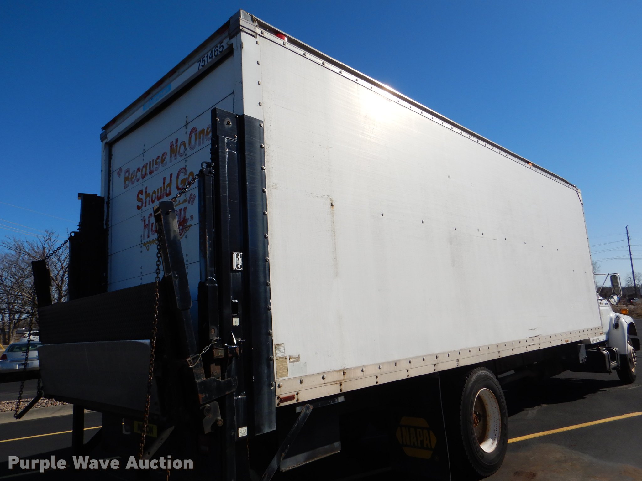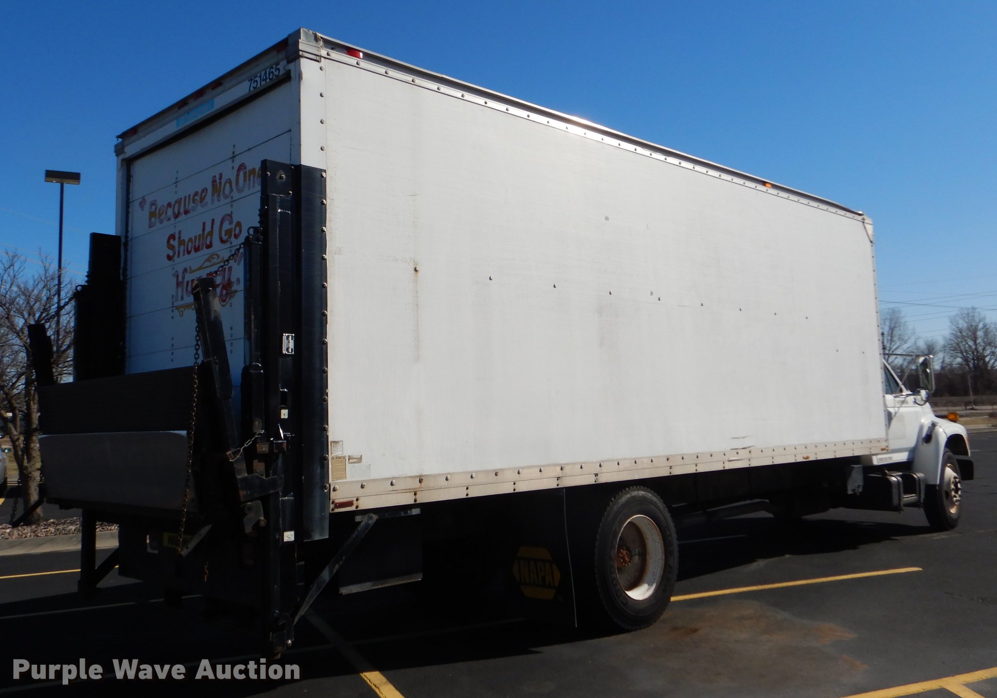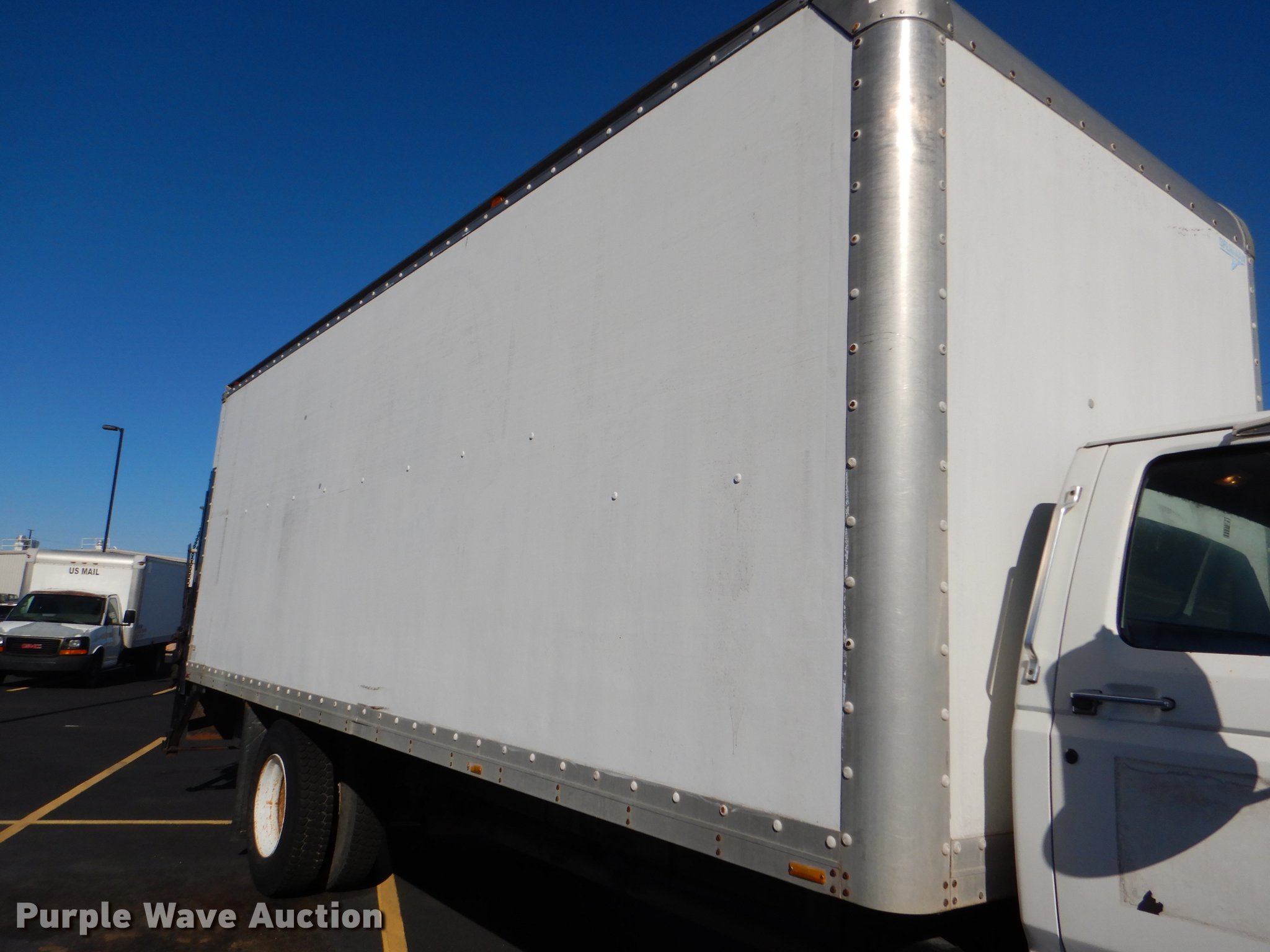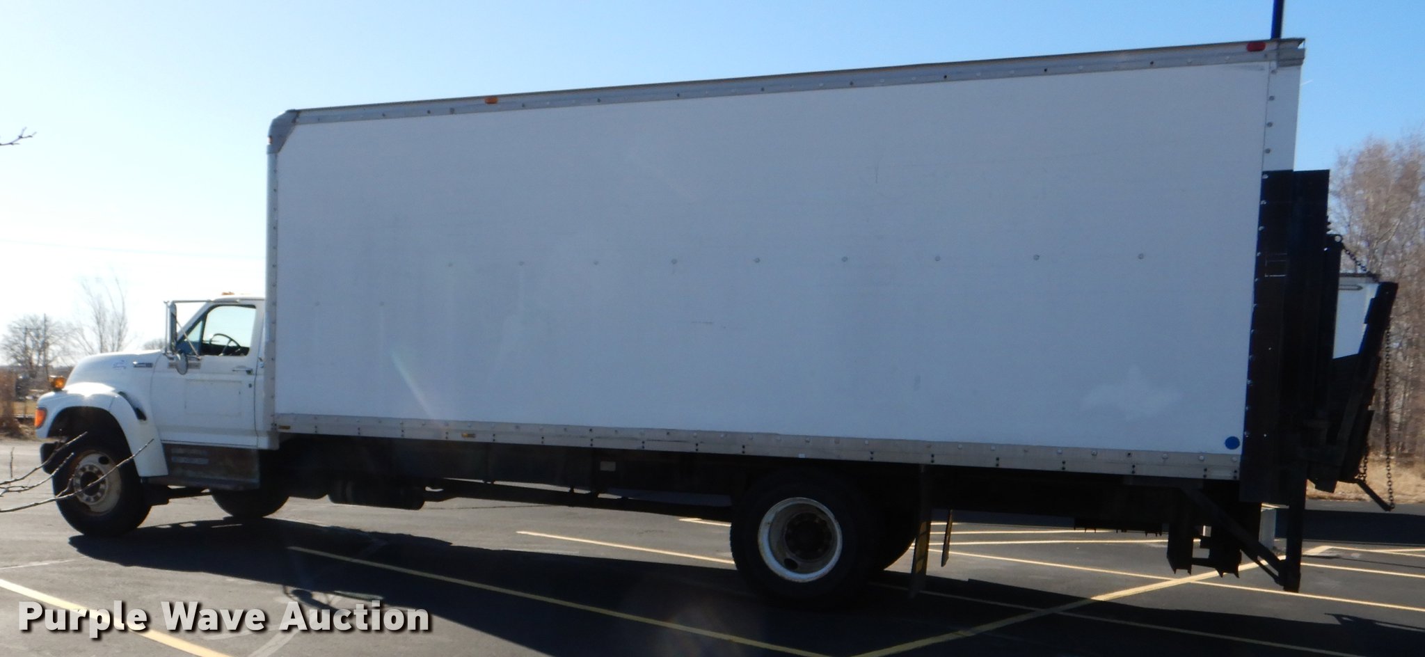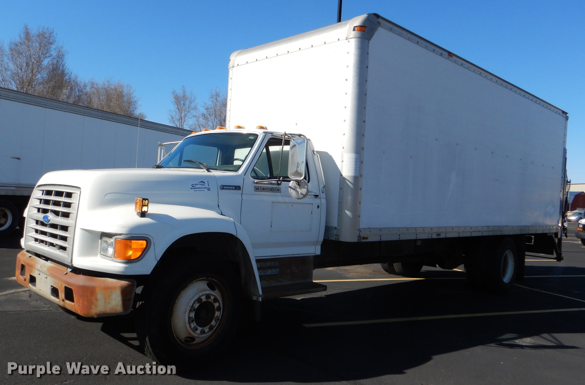 Purple Wave is selling a used Box Truck in Kansas. This item is a 1995 Ford F700 box truck with the following: 154,581 miles on odometer, Cummins B5.9 5.9L L6 turbo diesel engine, Automatic transmission, Single axle, AC and heat, AM/FM, 24'L x 8'W dry van body, Roll-up rear door, Maxon RCT-43 end gate lift, 4,000 lbs capacity, Serial C90399933C, Spring suspension, Hydraulic brakes, 10R22.5 tires