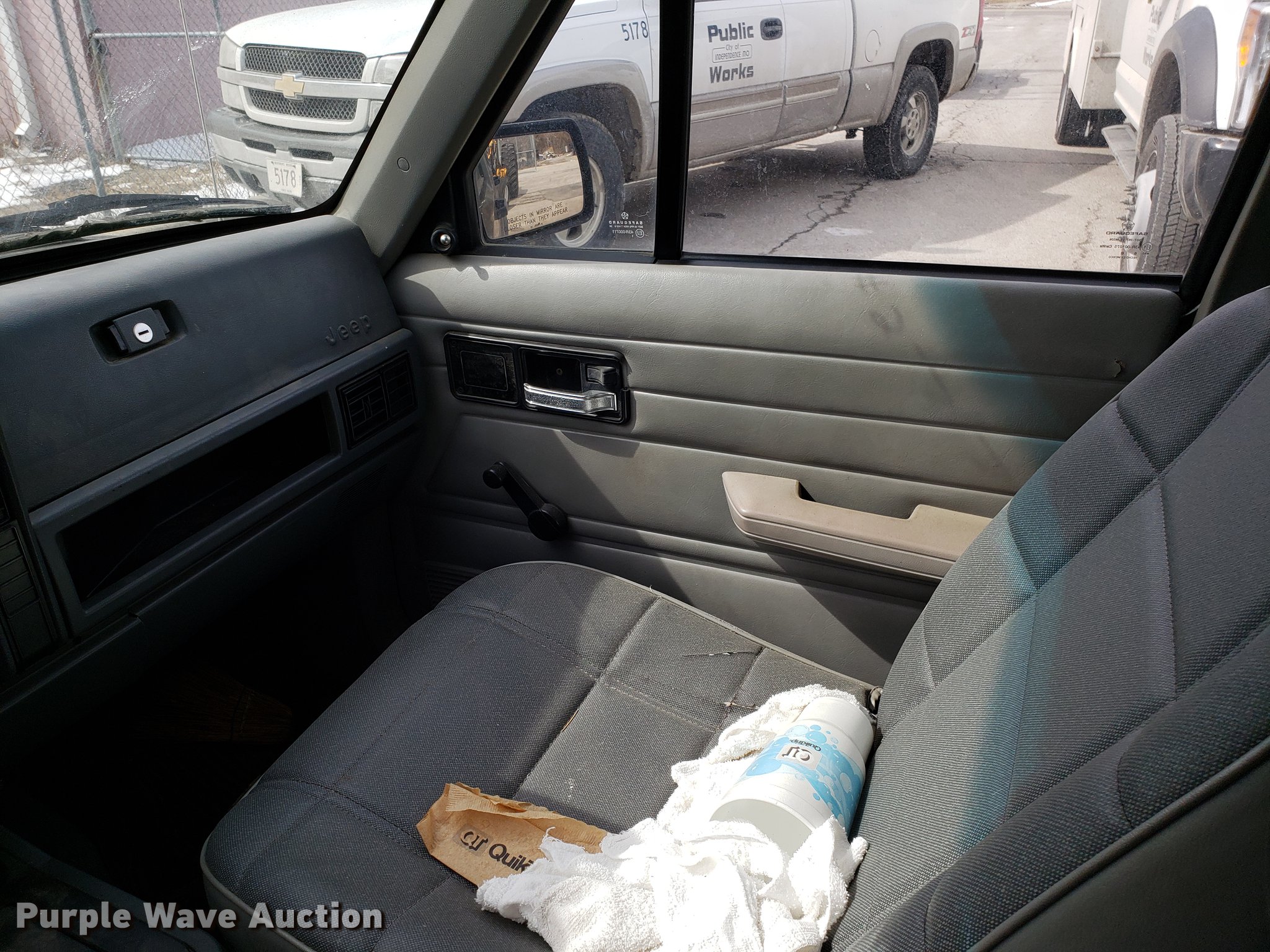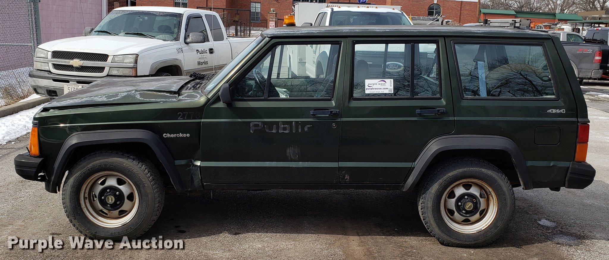 1996 Jeep Cherokee SUV. 106,652 miles on odometer, 4.0L L6 OHV 12V gas engine, Automatic transmission, Four wheel drive, Vinyl interior, Receiver hitch, Trailer wiring, 215/75R15 tires, Collision damage, Battery dead, Unit# 2778. Missouri title. 1J4FJ28S9TL212692. City of Independence. 111 E Maple Ave. Independence, MO 64050