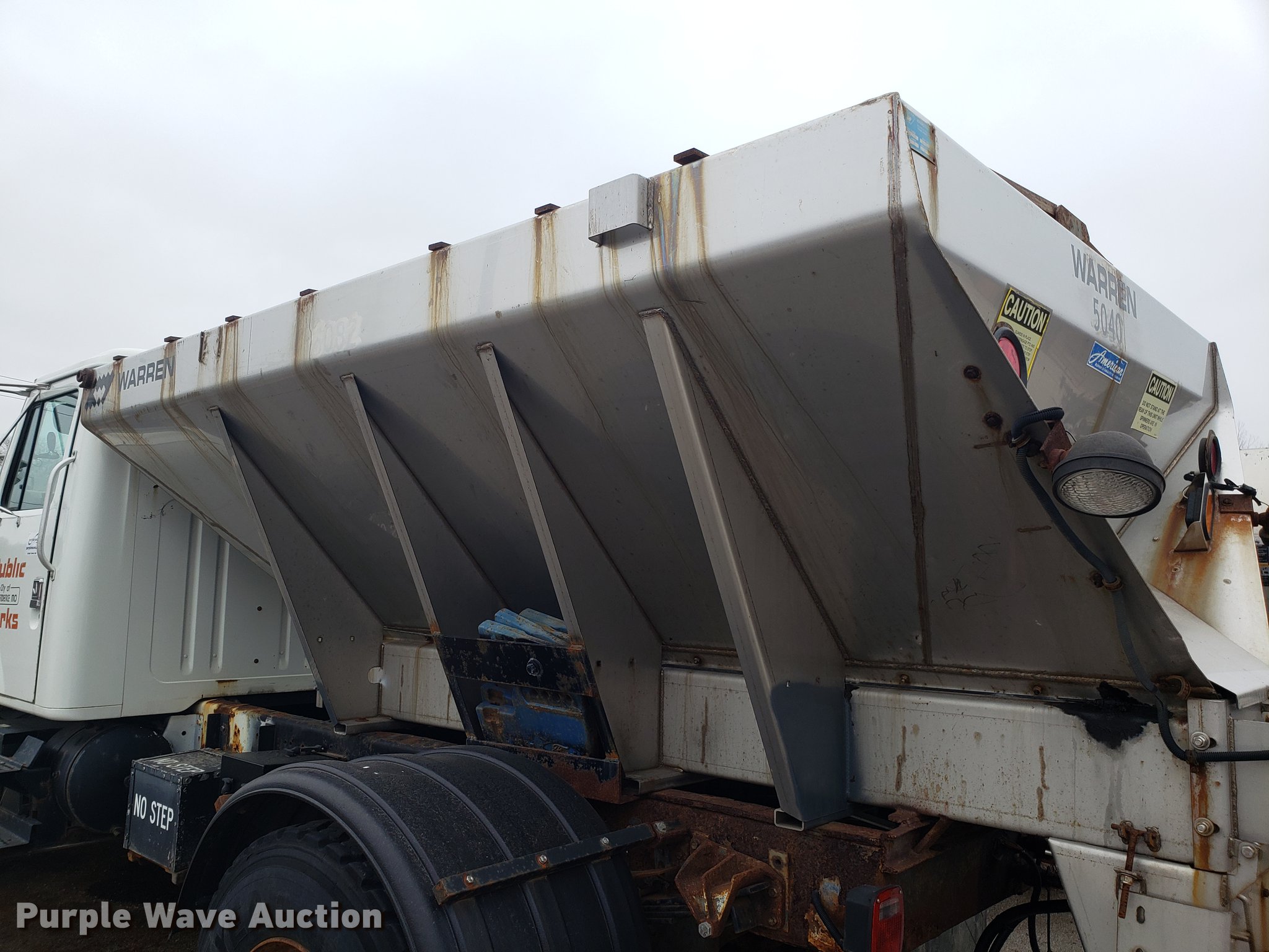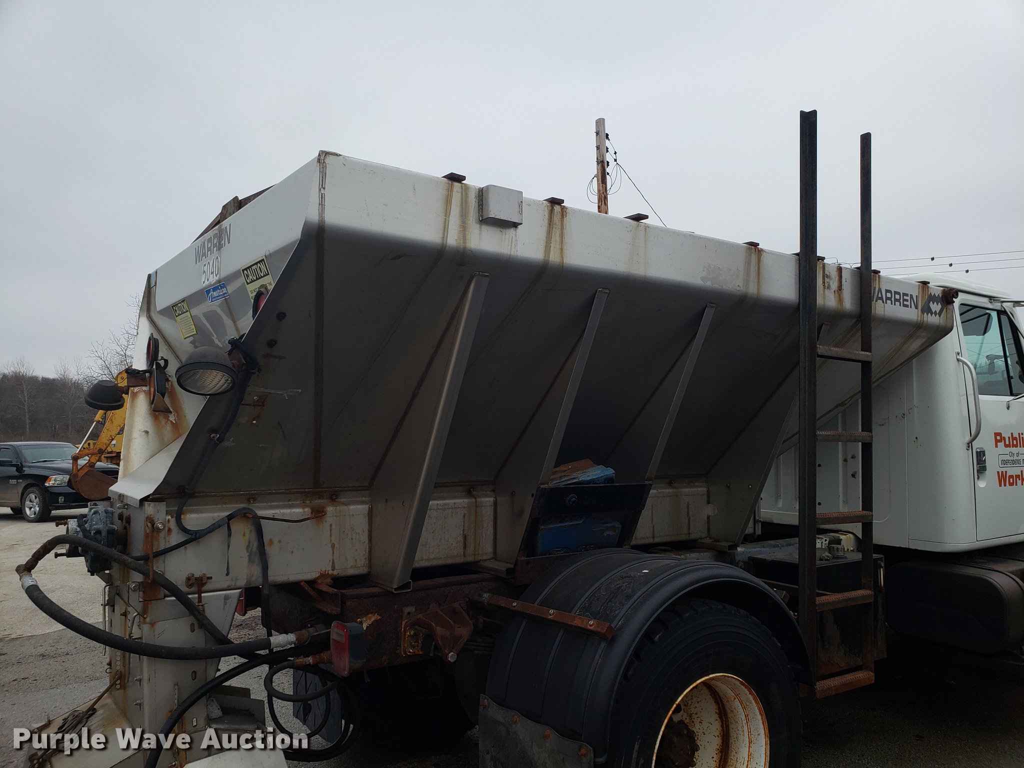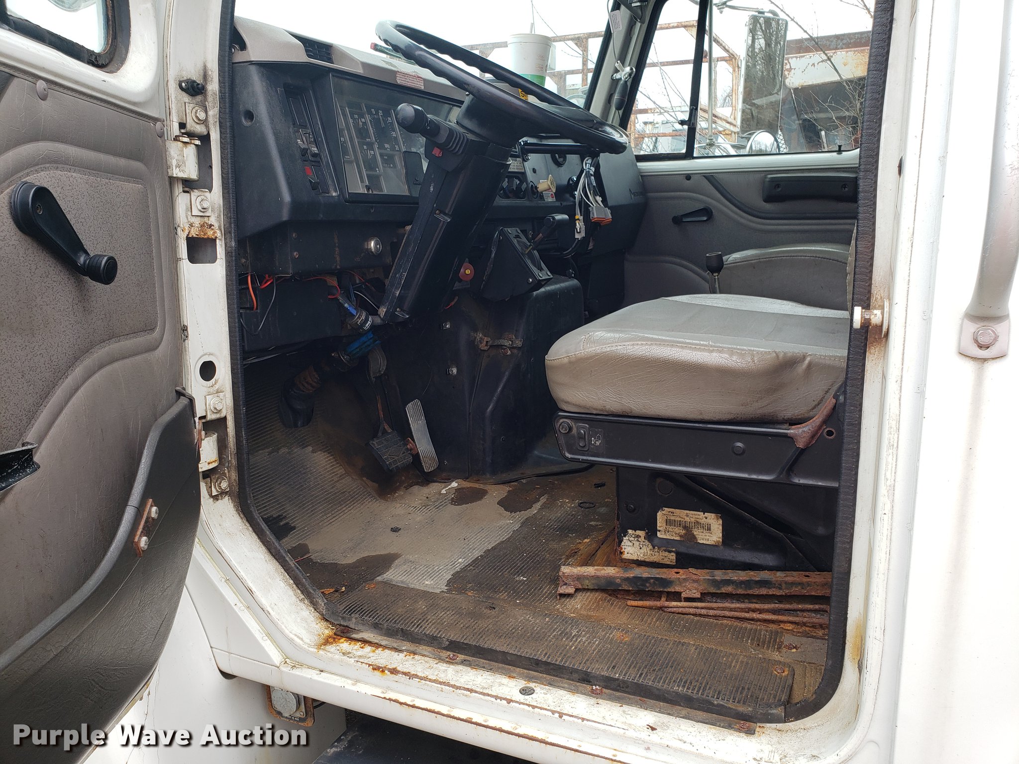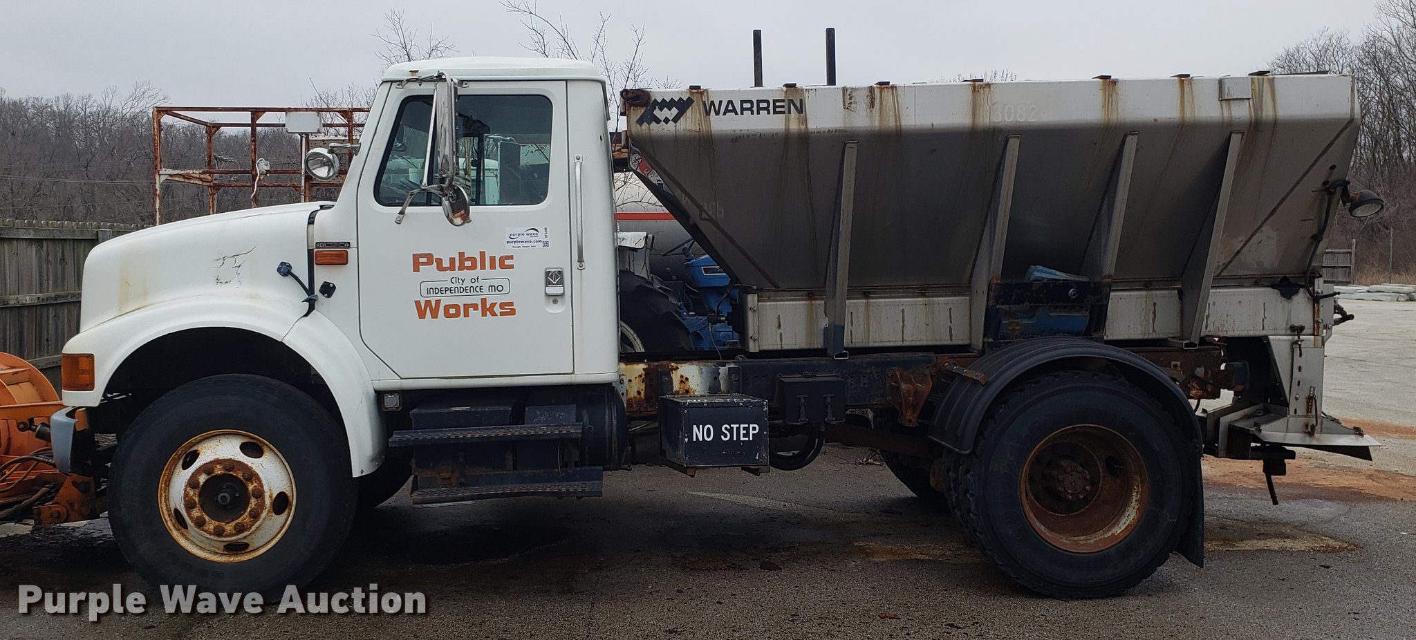 Purple Wave is selling a used Truck Chassis in Missouri. This item is a 2001 International 4700 spreader truck with the following: 233,077 miles on odometer, 30,946 hours on meter, International DT466 7.6L L6 turbo diesel engine, Automatic transmission, Cruise, AM/FM, Air suspension seat, PTO, Plow mount, Warren stainless steel spreader bed, 11'L x 7'W, Hydraulic operation, Spring suspension, Air brakes, 11R22.5 tires, Plow not included, Unknown operating condition, Unit# 3082