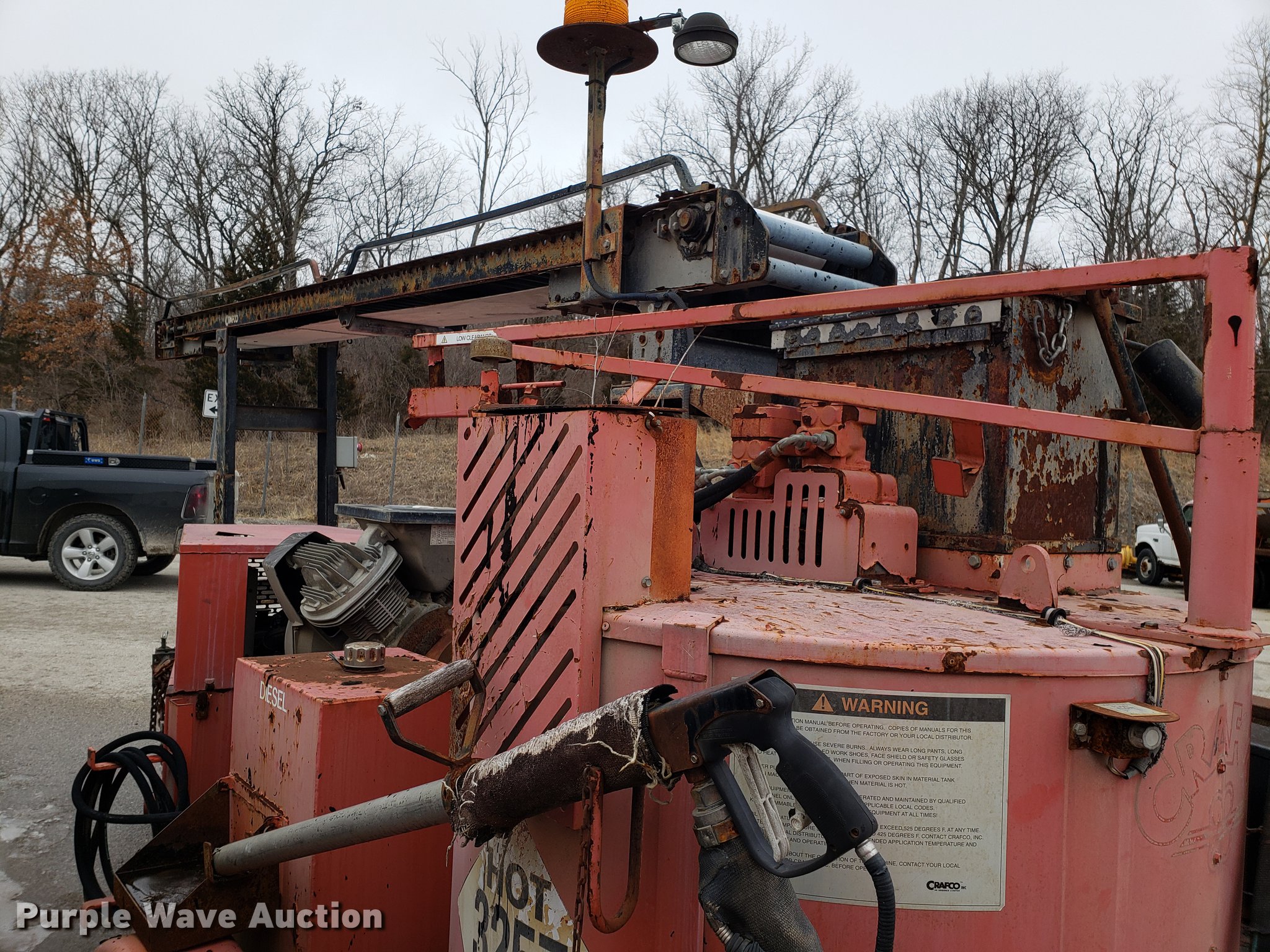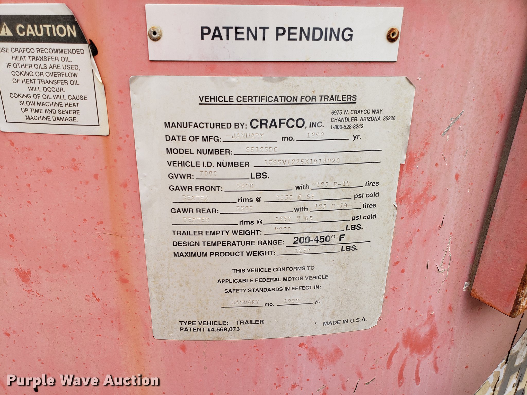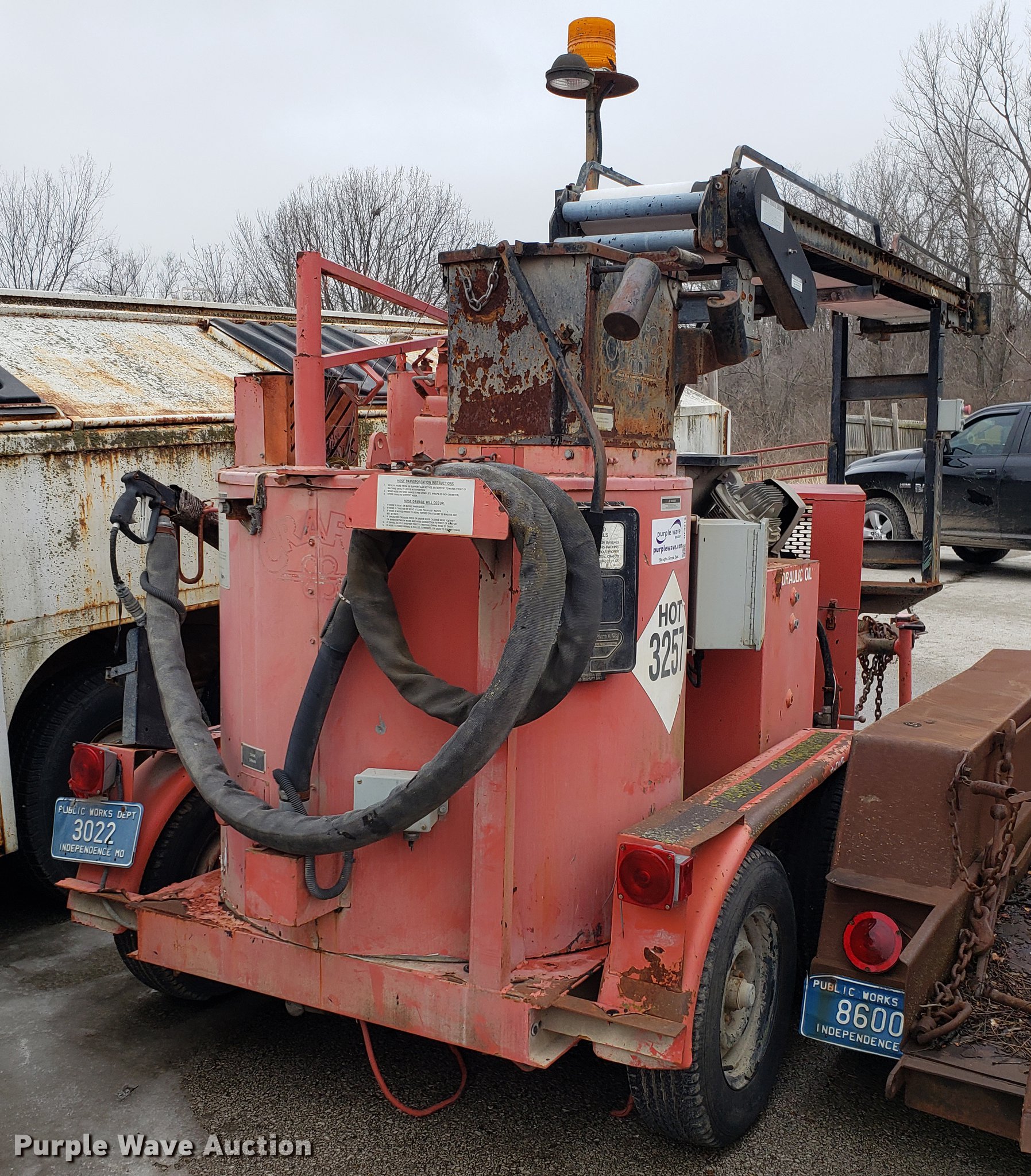 Purple Wave is selling a used Pot Hole Patcher in Missouri. This item is a Crafco SS125DC crack sealer with the following: Three cylinder diesel engine, 12"W conveyor, Air compressor, 2 5/16" ball hitch, Jack stand, 185R14 tires, GVWR 7,000 lbs, Unknown operating condition, Unit# 8676