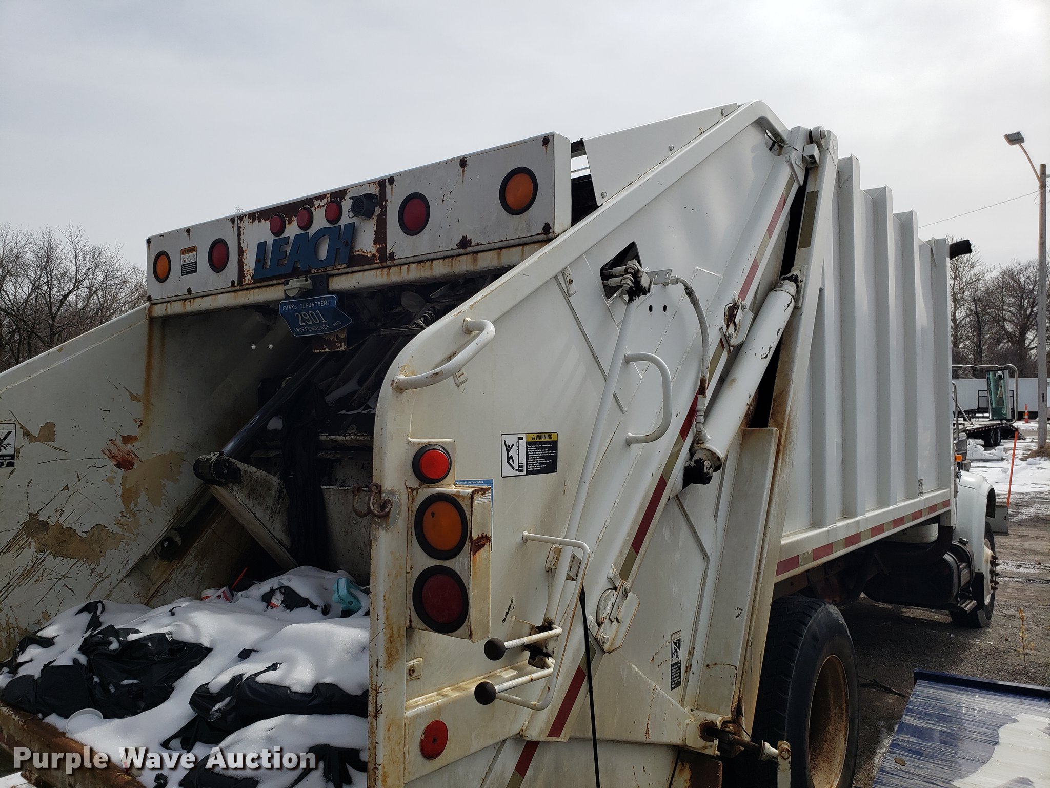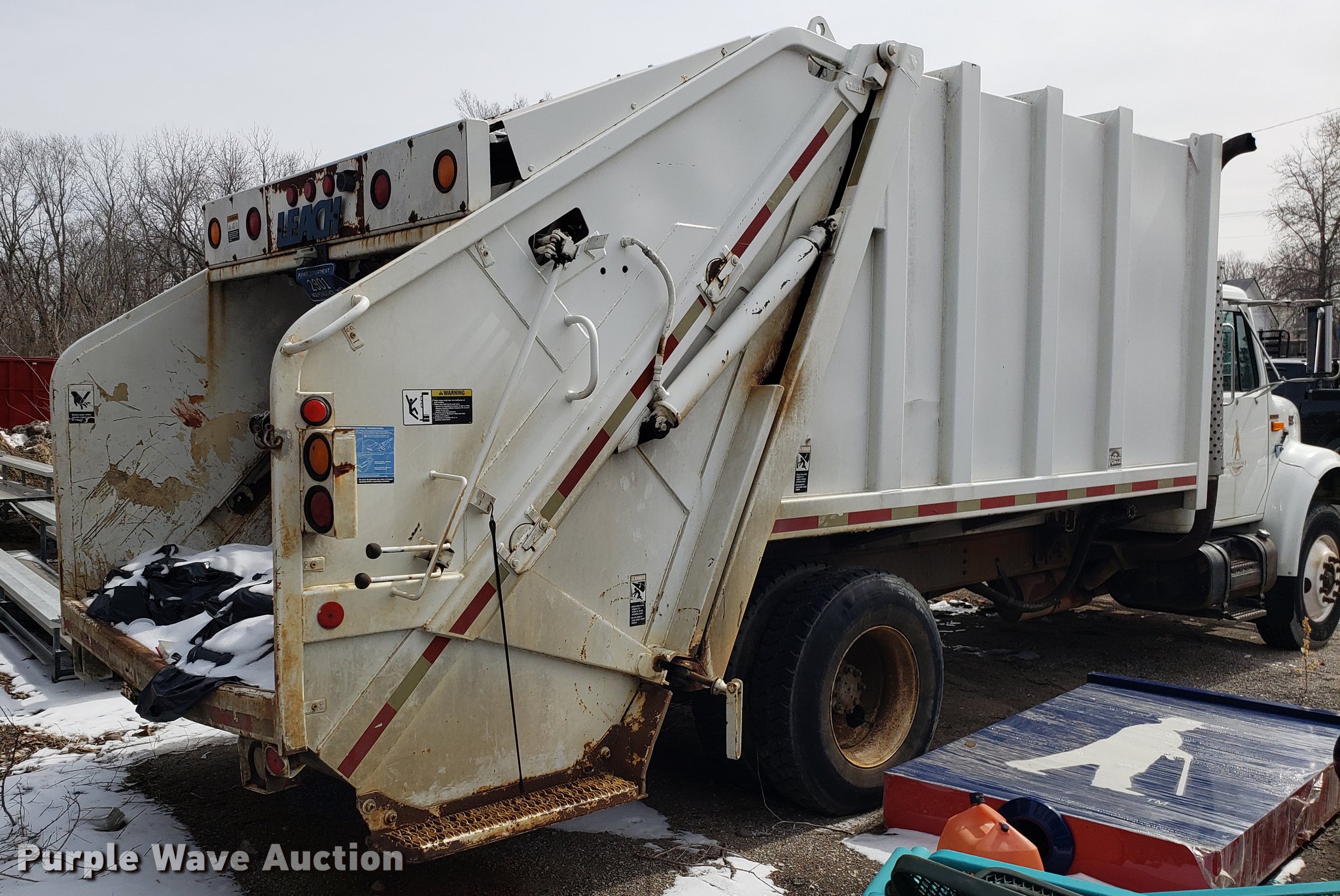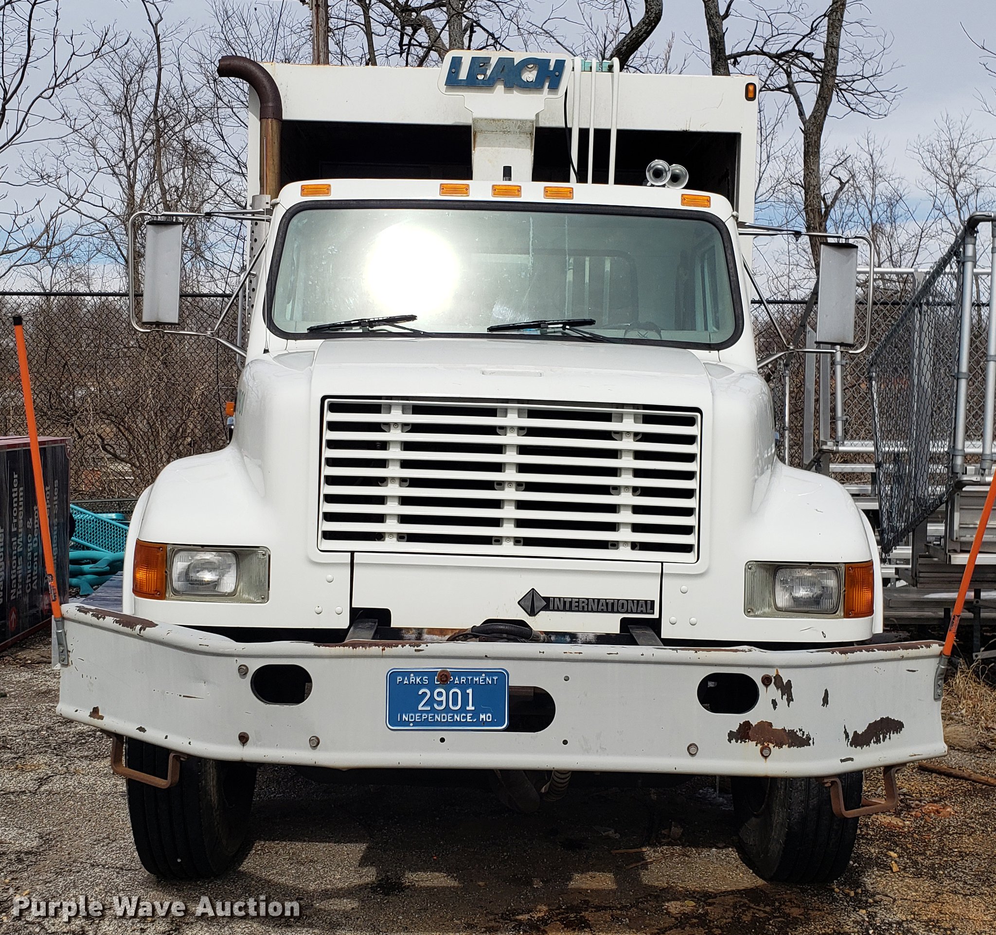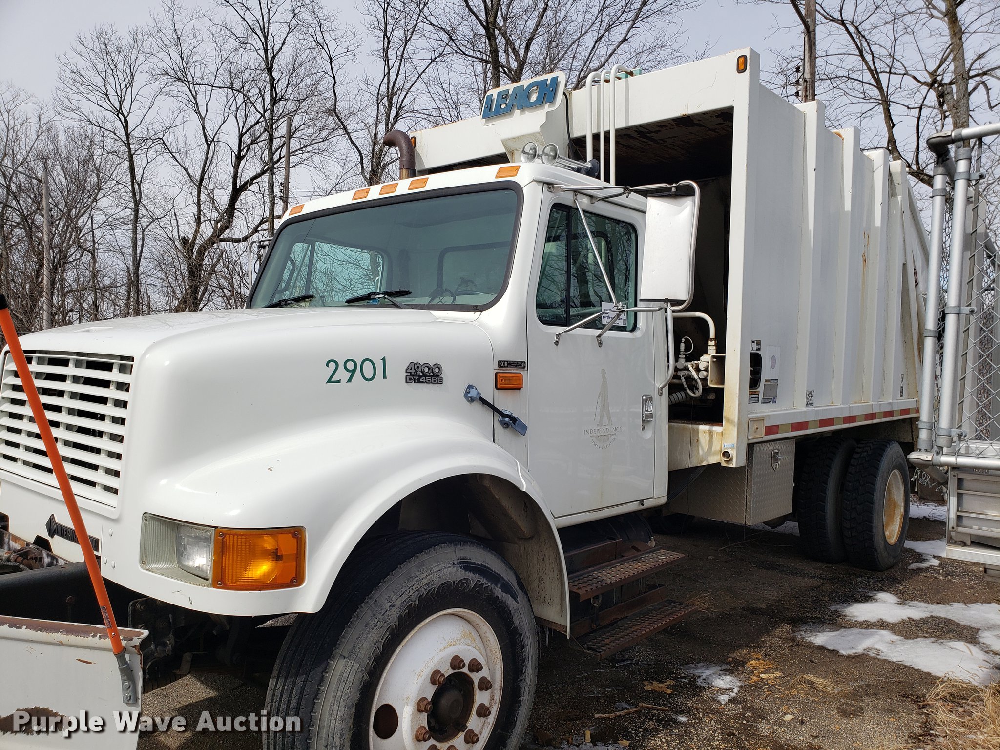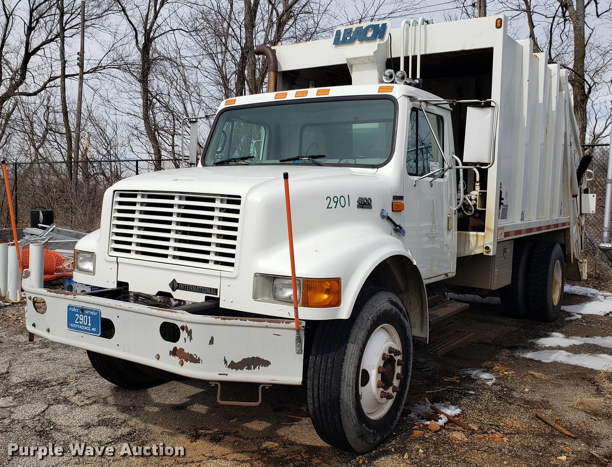 Purple Wave is selling a used Refuse Truck in Missouri. This item is a 1998 International 4900 refuse truck with the following: 97,787 miles on odometer, 9,883 hours on meter, International DT466 7.6L L6 turbo diesel engine, Automatic transmission, Heat, AM/FM/CD, Vinyl interior, PTO, Leach AL-HIP refuse bed, 18'L, Rear load, Serial 3642, Spring suspension, Air brakes, 11R22.5 tires, Non-operational unit, Unit# 2901