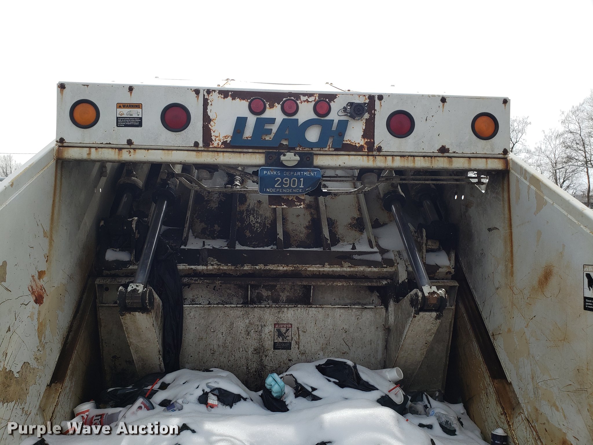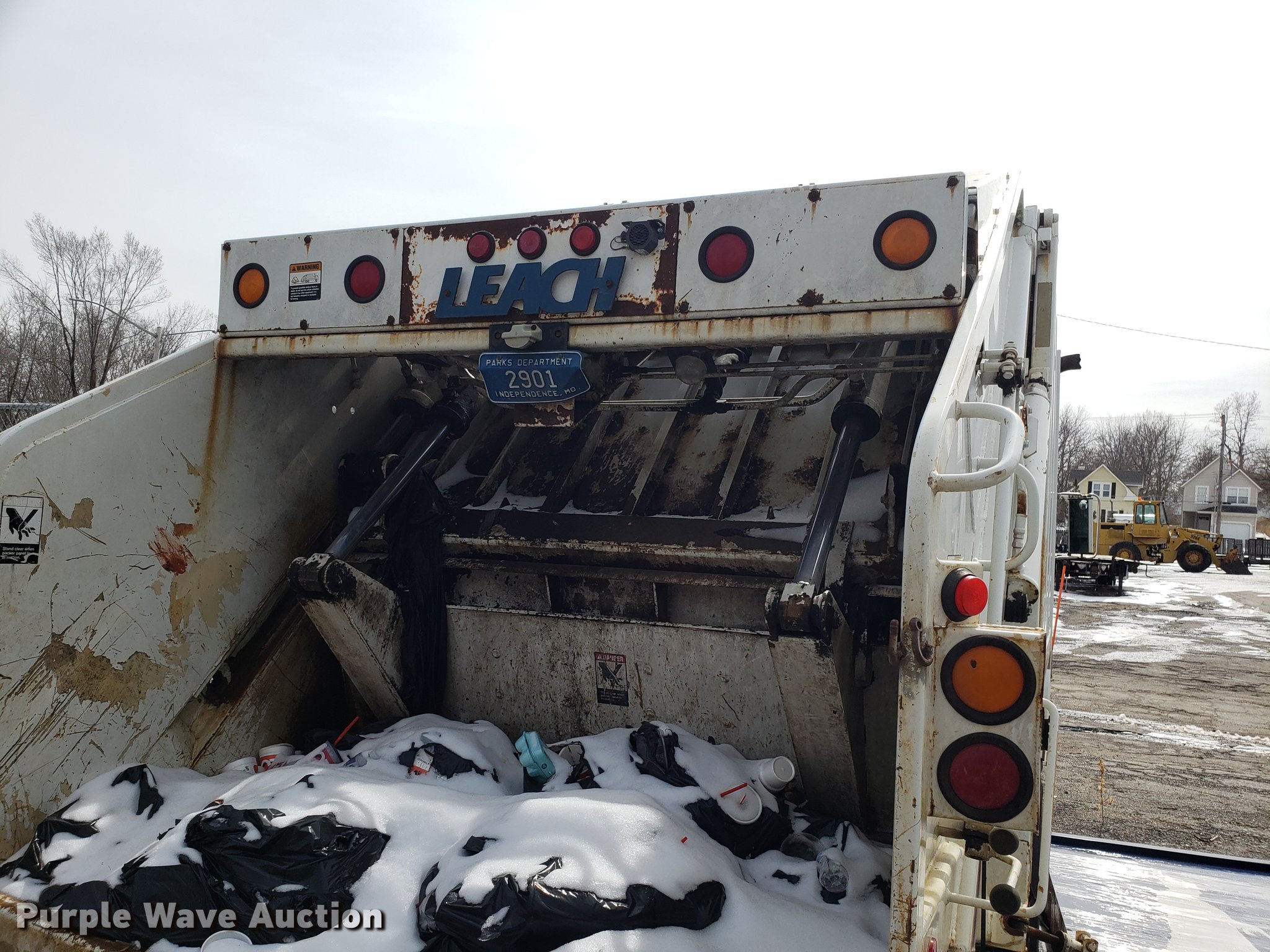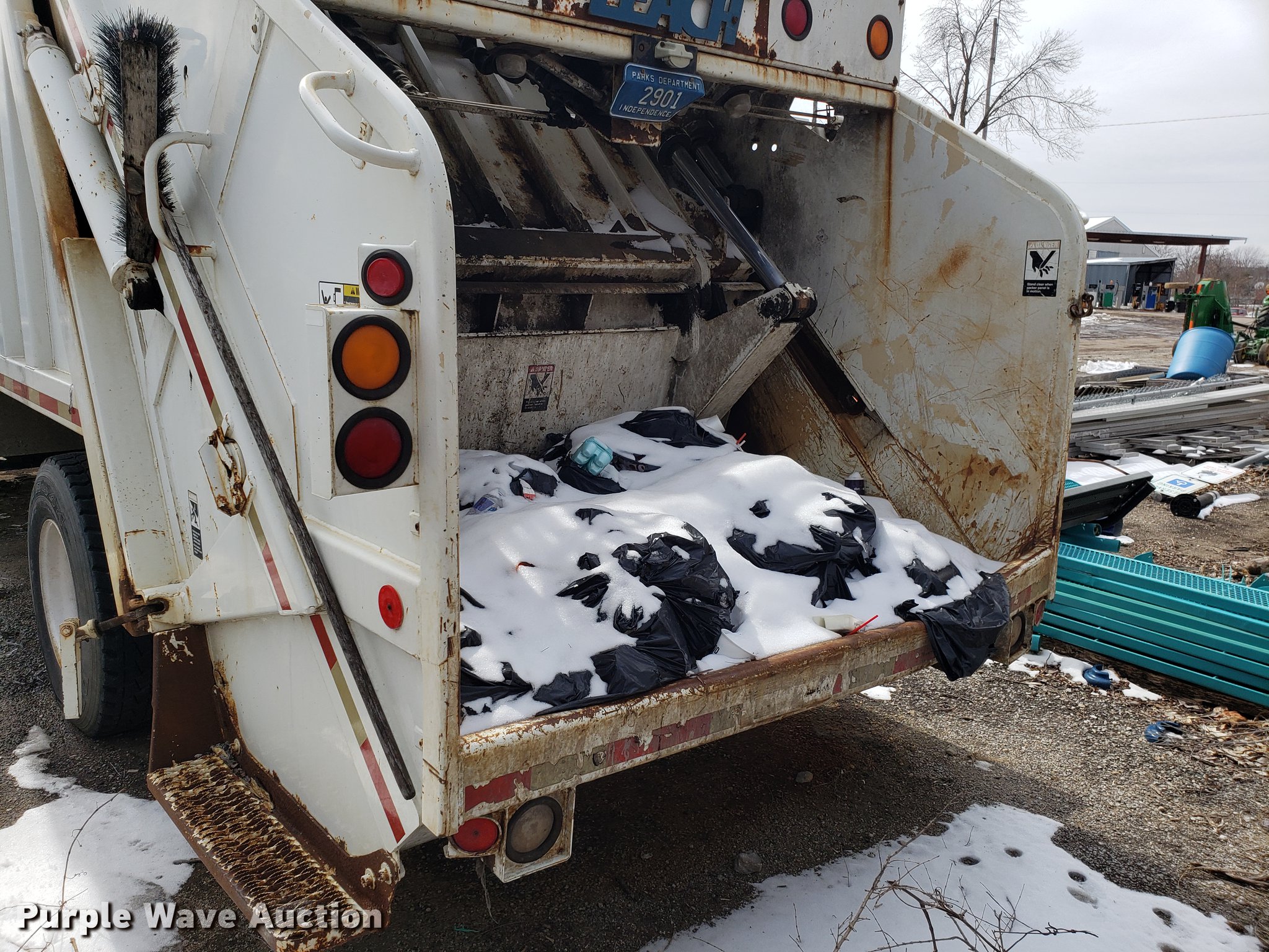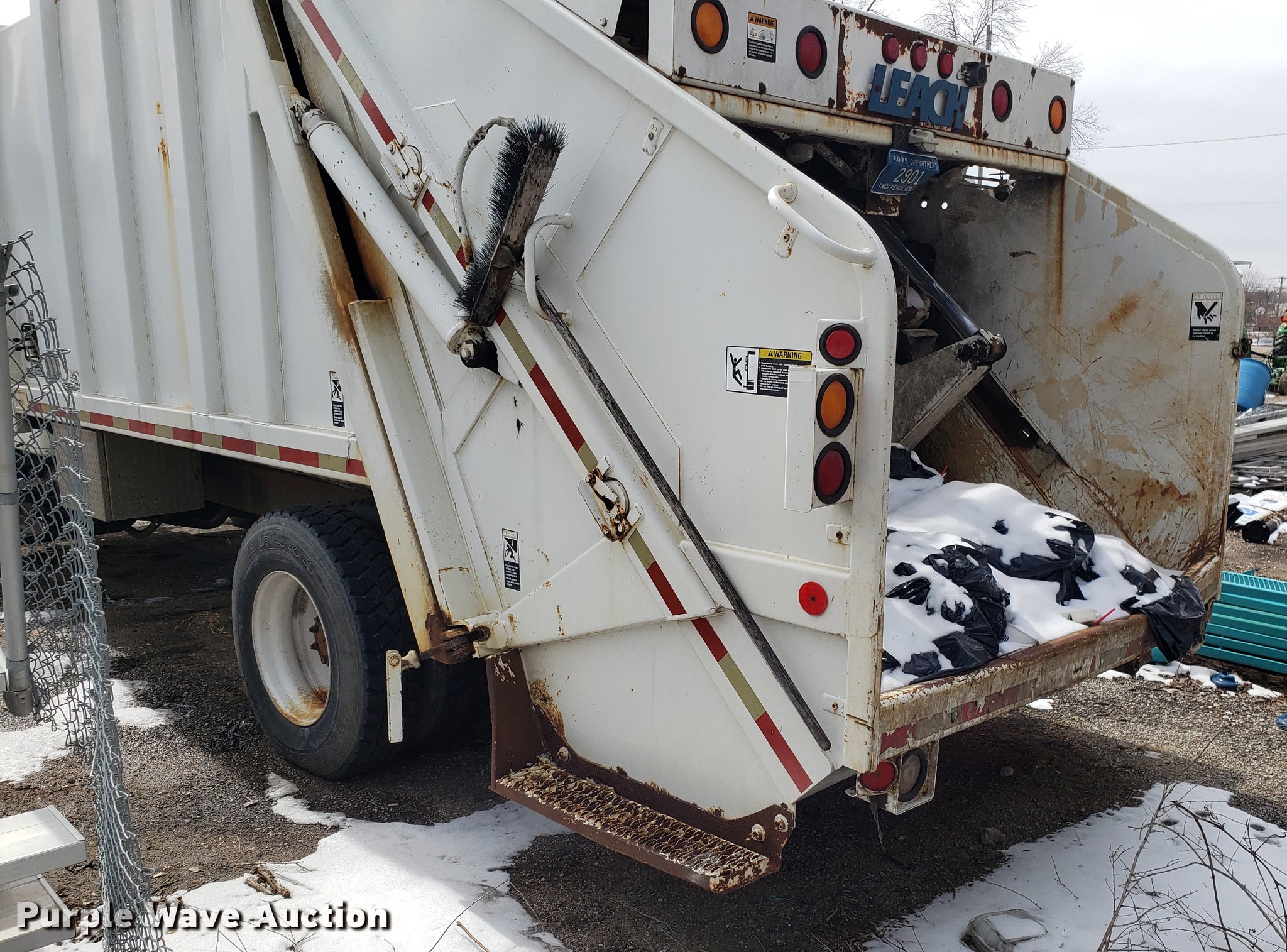 Purple Wave is selling a used Refuse Truck in Missouri. This item is a 1998 International 4900 refuse truck with the following: 97,787 miles on odometer, 9,883 hours on meter, International DT466 7.6L L6 turbo diesel engine, Automatic transmission, Heat, AM/FM/CD, Vinyl interior, PTO, Leach AL-HIP refuse bed, 18'L, Rear load, Serial 3642, Spring suspension, Air brakes, 11R22.5 tires, Non-operational unit, Unit# 2901