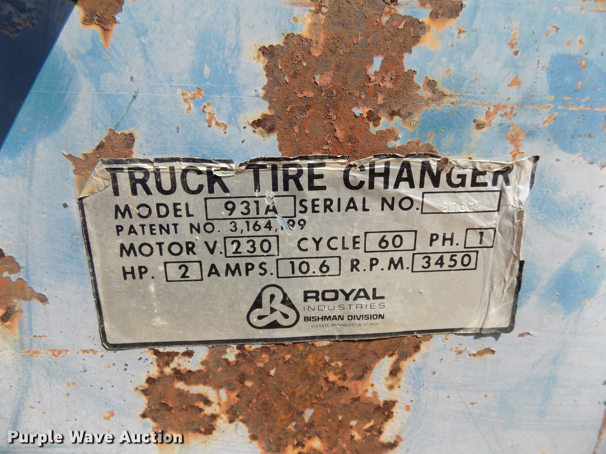 Purple Wave is selling a used Tools in Oklahoma. This item is a Tire machine with the following: Model 931A, 230V, 2 HP, 60 cycle, 0.6 amp, 3,450 RPM, Single phase, Serial 3762