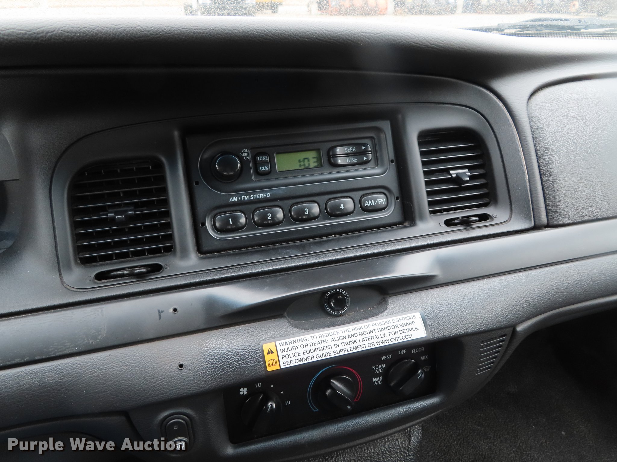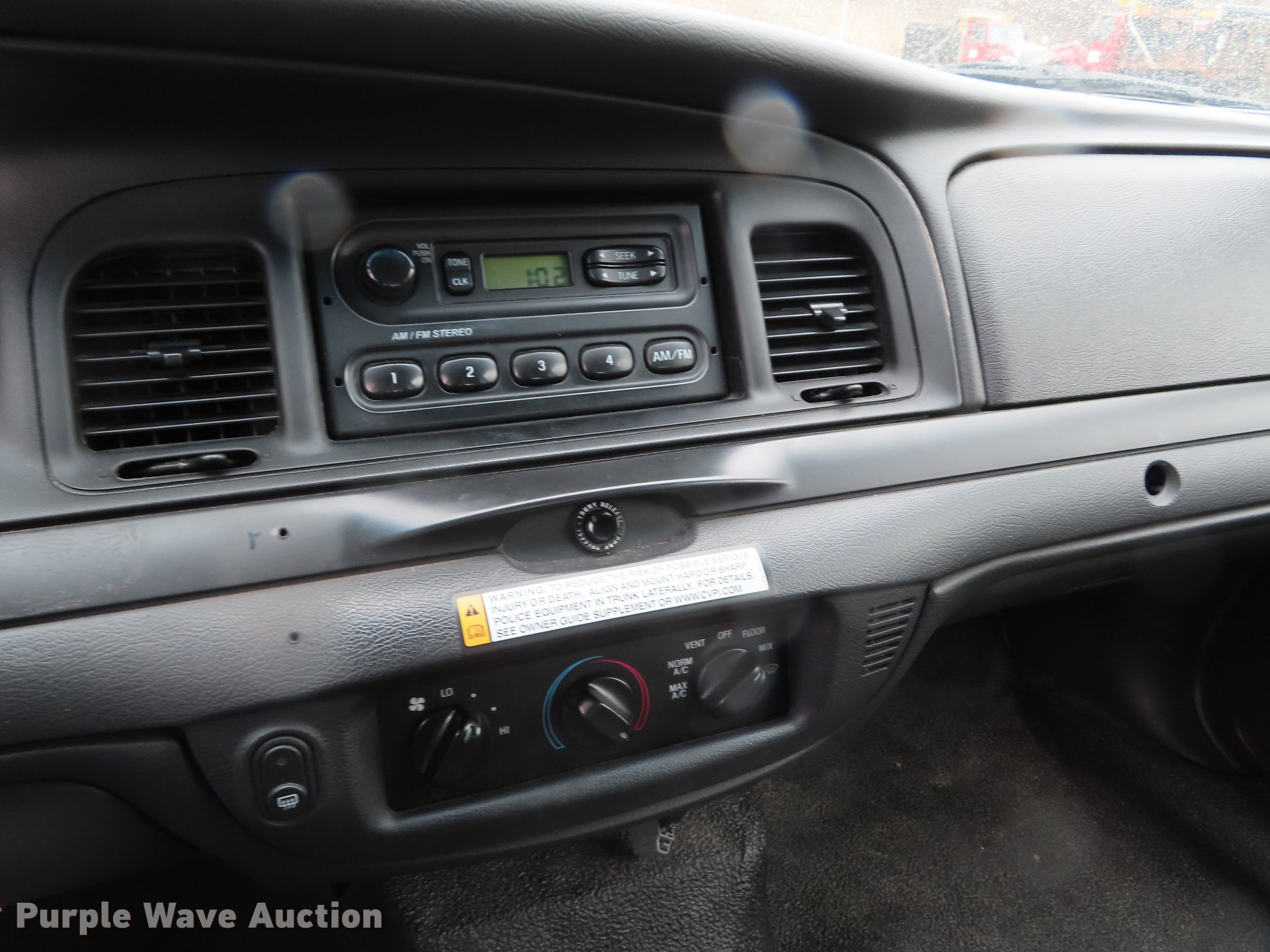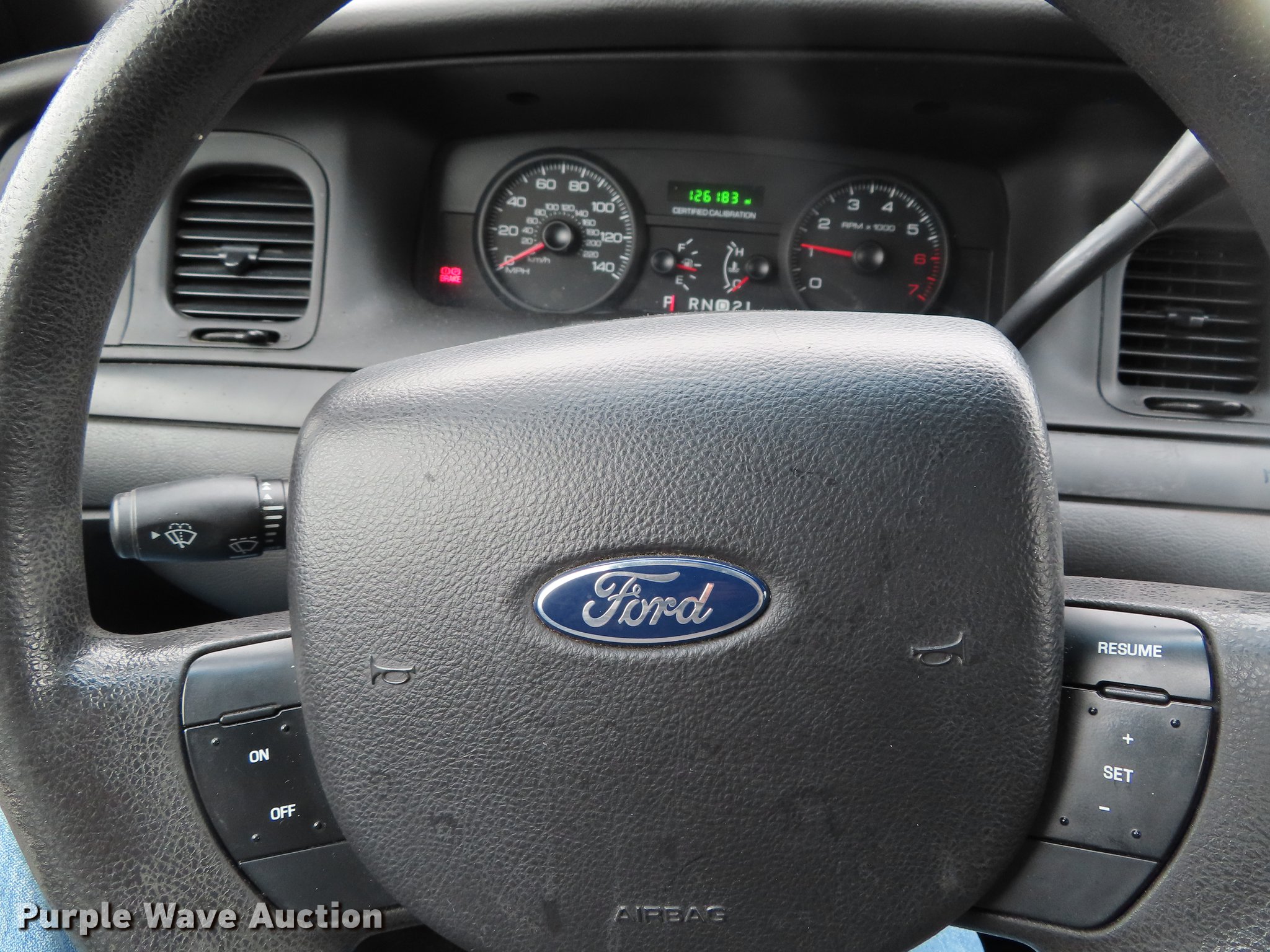 Purple Wave is selling a used Passenger Vehicle in Kansas. This item is a 2006 Ford Crown Victoria Police Interceptor with the following: 126,183 miles on odometer, 4.6L V8 SOHC 16V gas engine, Automatic transmission, AC and heat, Tilt, Cruise, AM/FM, Power windows, locks, and mirrors, Cloth interior, Vinyl rear seat, Cage divider, Spot light, 235/55R17 tires, Unit# COR222