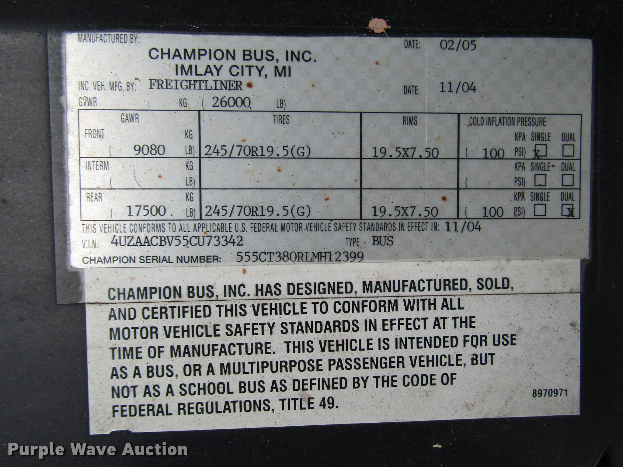 Purple Wave is selling a used Bus in Arkansas. This item is a 2005 Freightliner MB55 Champion shuttle bus with the following: Unknown miles on odometer, Cummins ISB 5.9L L6 turbo diesel engine, Automatic transmission, Single axle, AC and heat, AM/FM/CD, Power mirrors, Air suspension seat, Electric passenger sliding door, Ceiling handrail, 40 passenger capacity, Seat belts, Braun wheelchair lift, (2) wheelchair tie down areas, Side emergency exits, Backup alarm, Air suspension, Air brakes, 278" wheelbase, 245/70R19.5 tires, GVWR 26,000 lbs, Non-operational unit