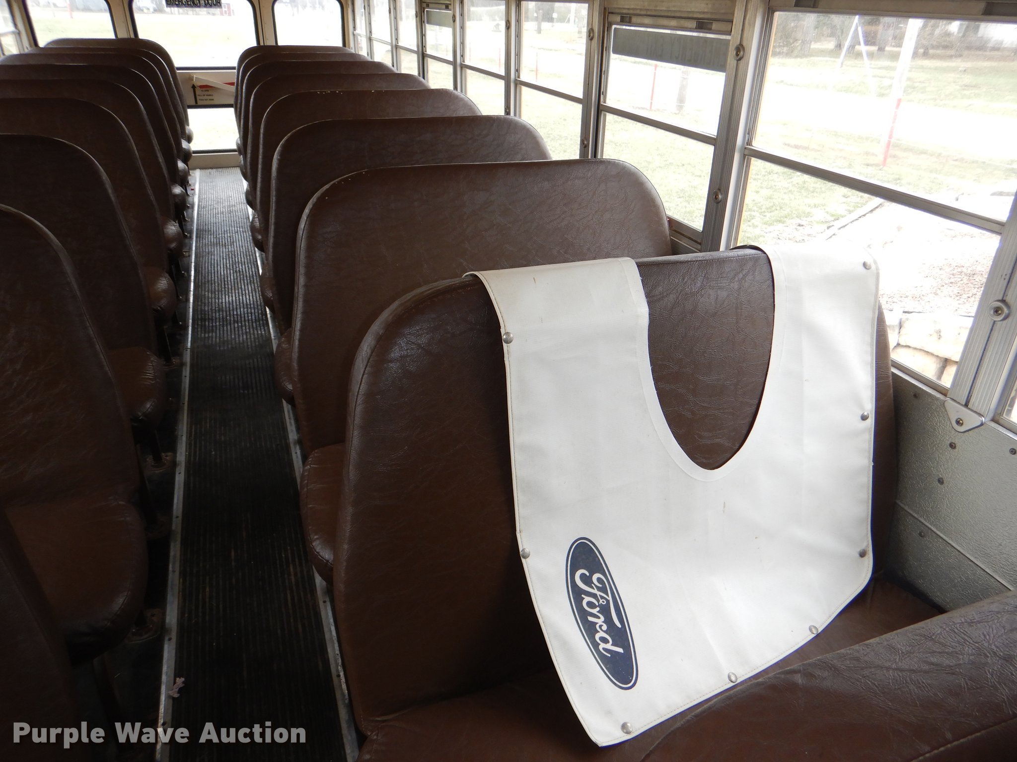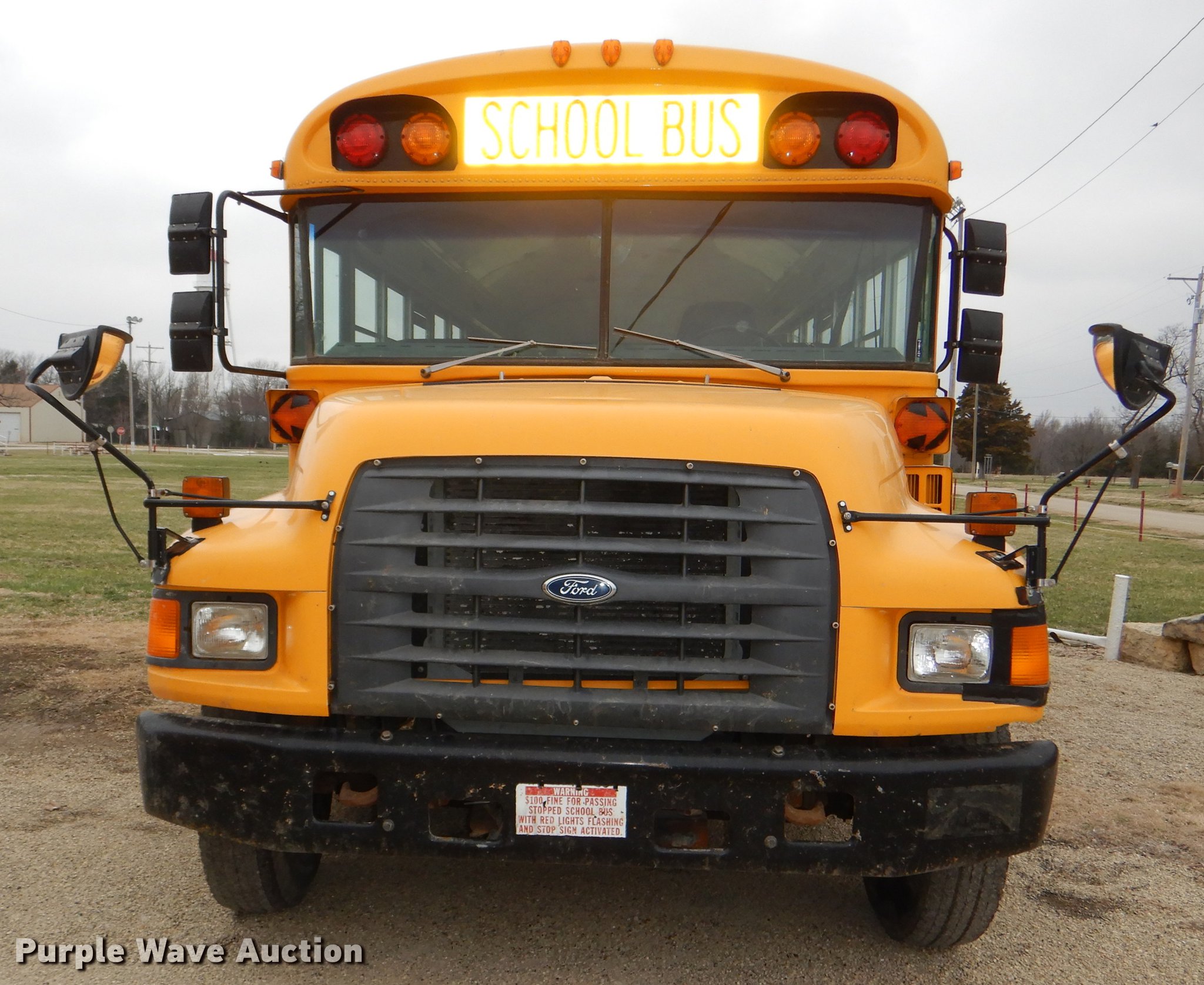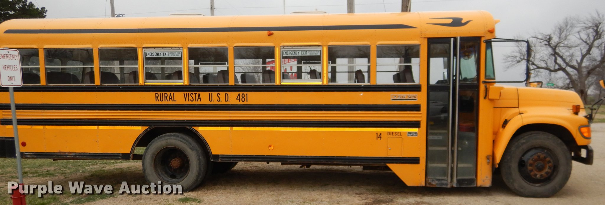 Purple Wave is selling a used Bus in Kansas. This item is a 1998 Ford B800 school bus with the following: 193,272 miles on odometer, Cummins B5.9 5.9L L6 diesel engine, 190 HP, Serial 56378188, Automatic transmission, Single axle, Heat, AM/FM, Vinyl interior, 53 passenger capacity, Ceiling, rear, and side emergency exits, Lighted stop sign, Backup alarm, Block heater, Cold weather hood bonnet, Underside luggage storage, Front and rear tow hooks, Spring suspension, Hydraulic brakes, 217" wheelbase, 10R22.5 tires, GVWR 25,500 lbs, Decals will be painted over, Unit# 14