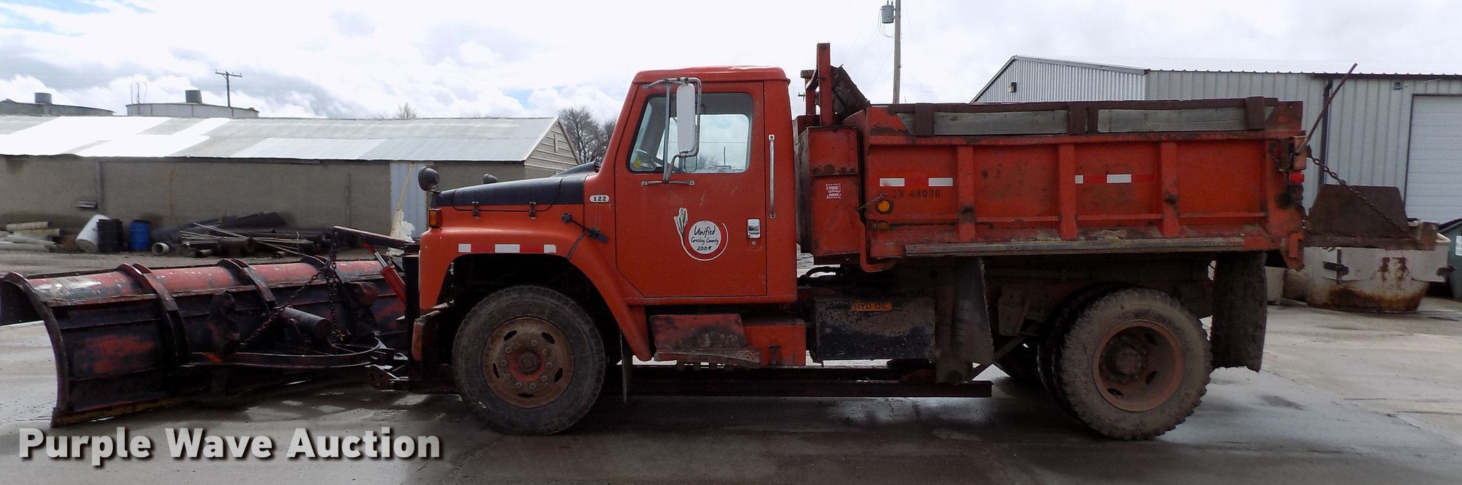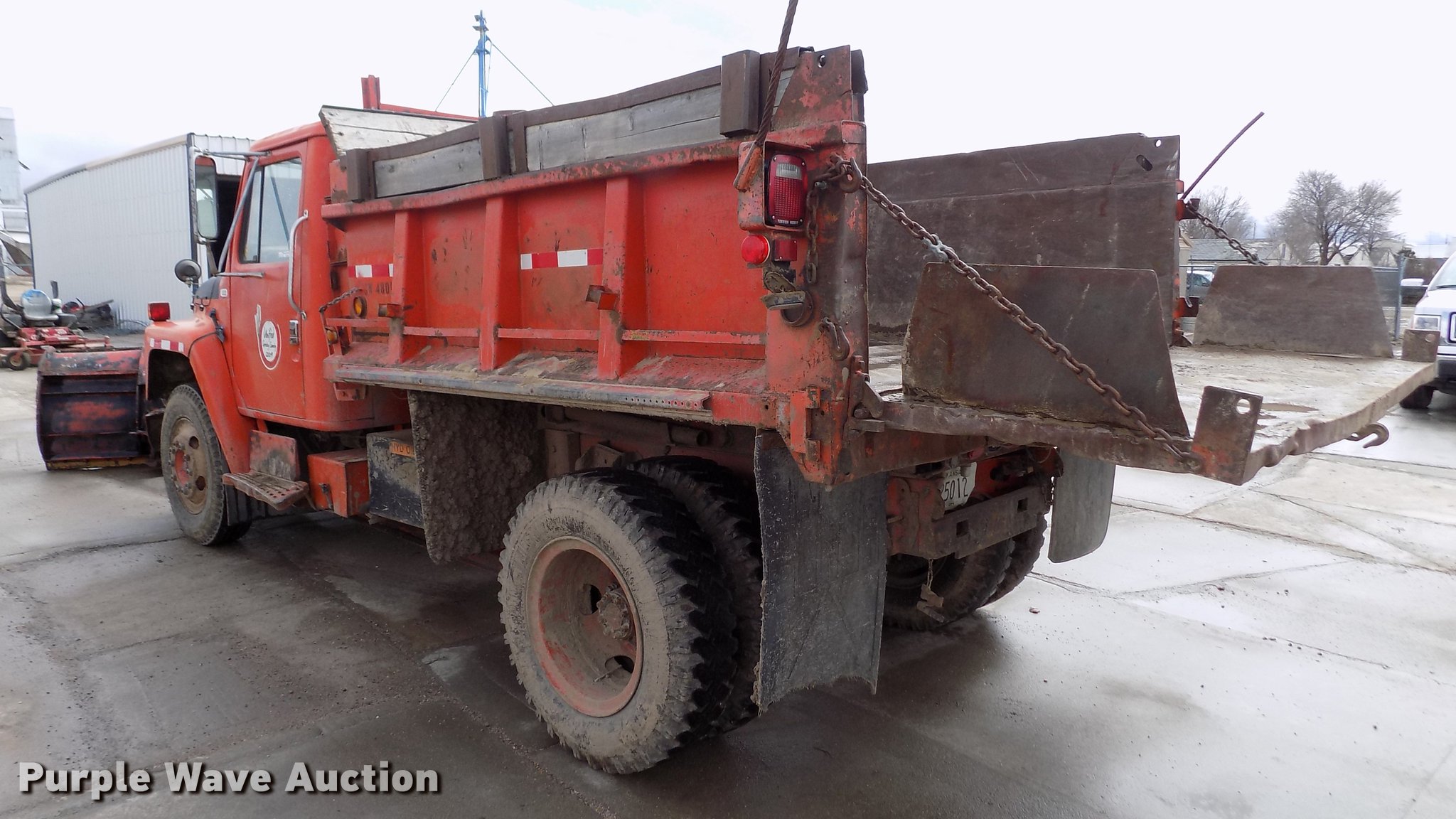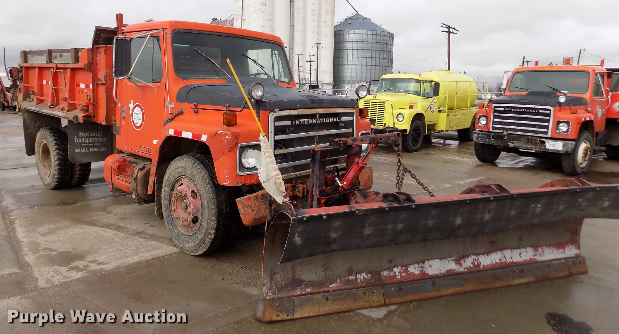 Purple Wave is selling a used Construction Dump Truck in Kansas. This item is a 1981 International 1754 dump truck with the following: 138,621 miles on odometer, International 9.0L eight cylinder diesel engine, Automatic transmission, Two speed rear end, Tandem axle, Heat, Block heater, PTO, 9'L x 96"W steel dump bed, 29" side height, 7.5" side board height, Single ram hoist, Manual end gate, 10'W plow, Single fuel tank, Trailer wiring, Spring suspension, Air brakes, 152" wheelbase, 9.00-20 tires