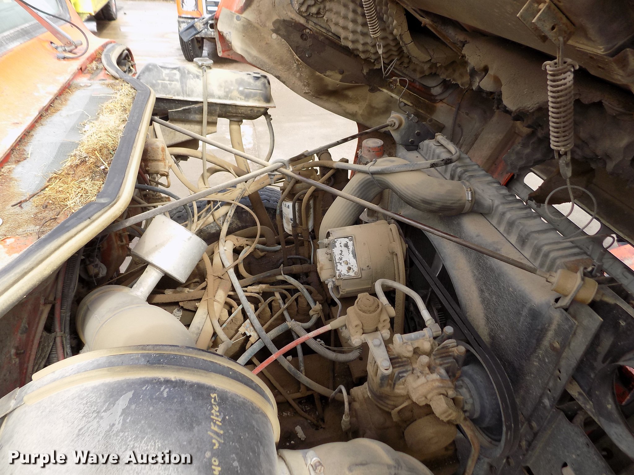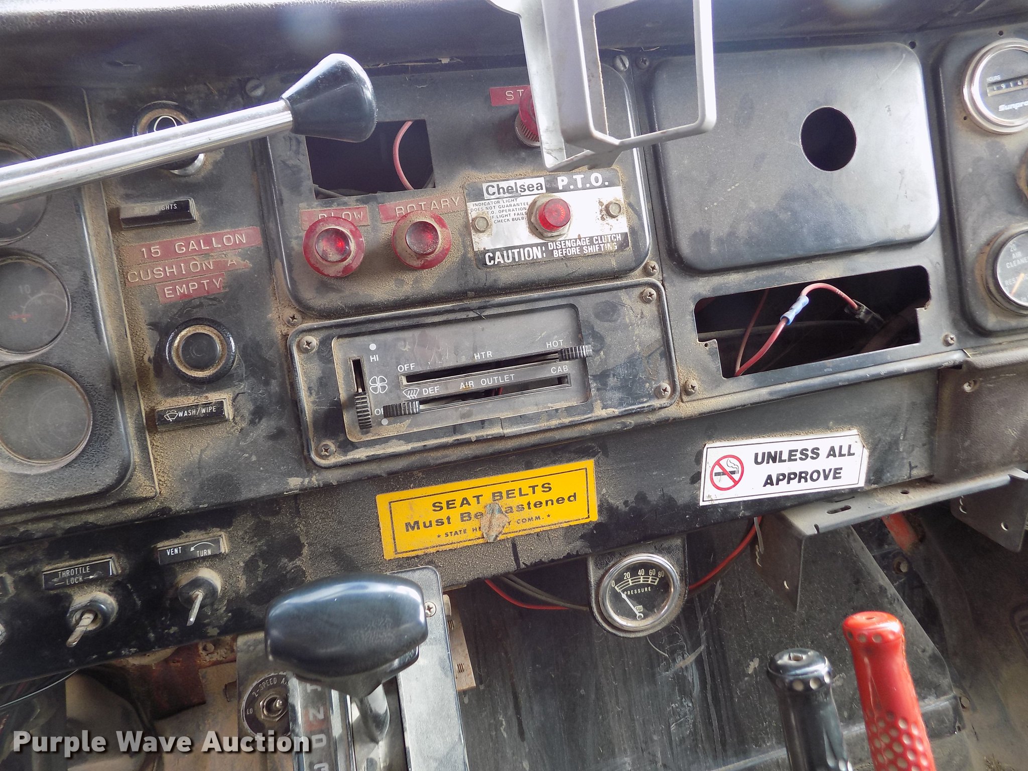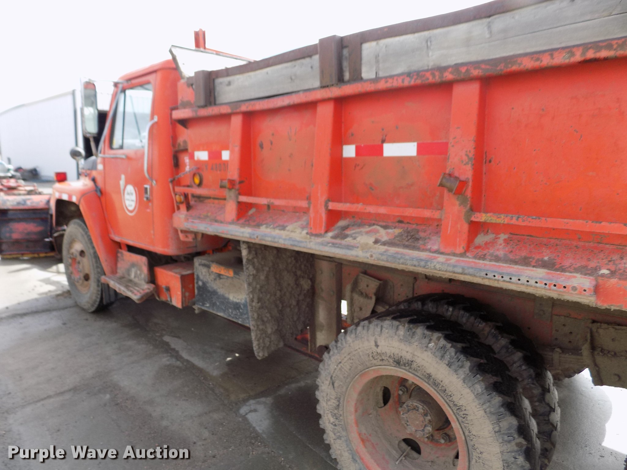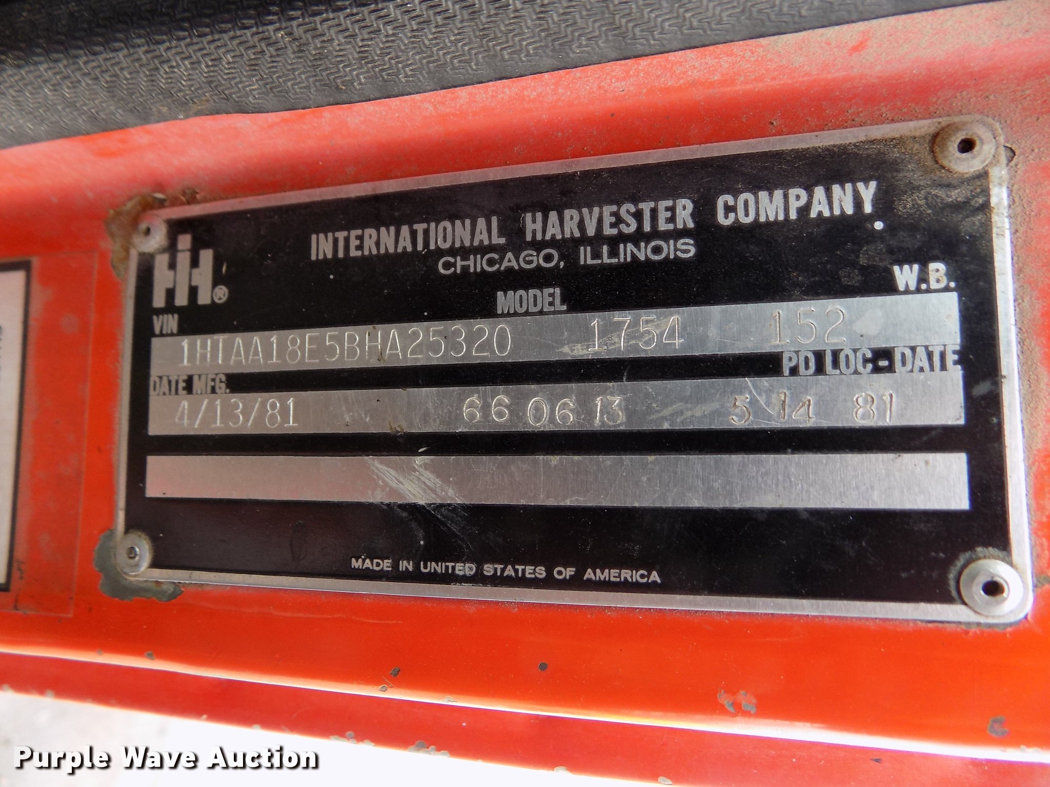 Purple Wave is selling a used Construction Dump Truck in Kansas. This item is a 1981 International 1754 dump truck with the following: 138,621 miles on odometer, International 9.0L eight cylinder diesel engine, Automatic transmission, Two speed rear end, Tandem axle, Heat, Block heater, PTO, 9'L x 96"W steel dump bed, 29" side height, 7.5" side board height, Single ram hoist, Manual end gate, 10'W plow, Single fuel tank, Trailer wiring, Spring suspension, Air brakes, 152" wheelbase, 9.00-20 tires