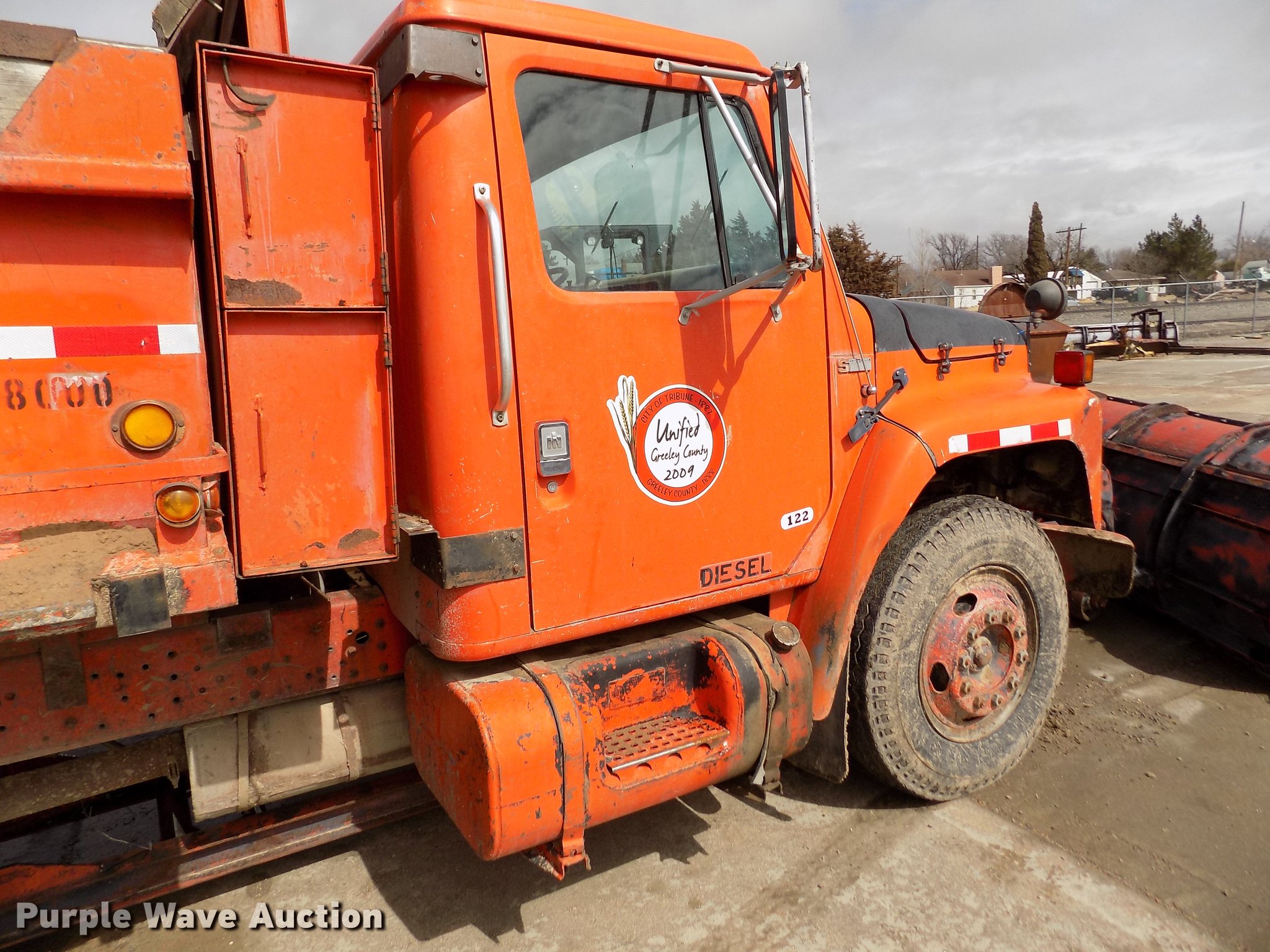 1981 International 1754 dump truck. 138,621 miles on odometer, International 9.0L eight cylinder diesel engine, Automatic transmission, Two speed rear end, Tandem axle, Heat, Block heater, PTO, 9'L x 96"W steel dump bed 29" side height, 7.5" side board height, Single ram hoist, Manual end gate, 10'W plow, Single fuel tank, Trailer wiring, Spring suspension, Air brakes, 152" wheelbase, 9.00-20 tires. Kansas title. Title distribution may be delayed up to 30 days from verification of funds. 1HTAA18E5BHA25320. Unified Greeley County. 150 4th St. Tribune, KS 67879
